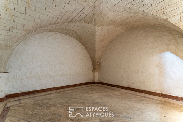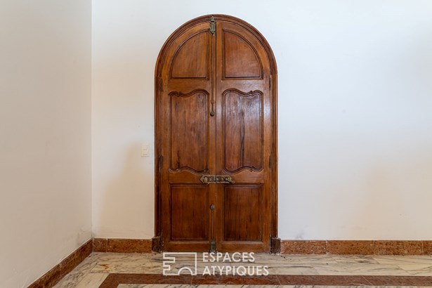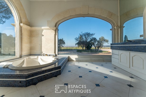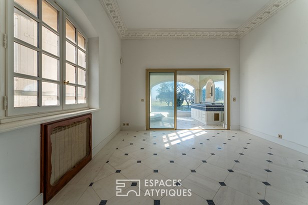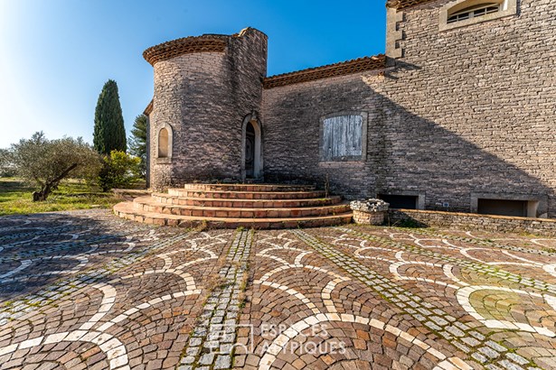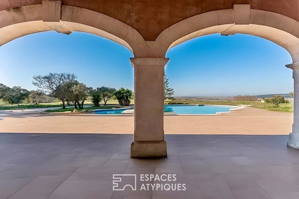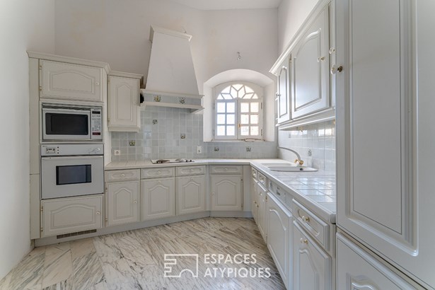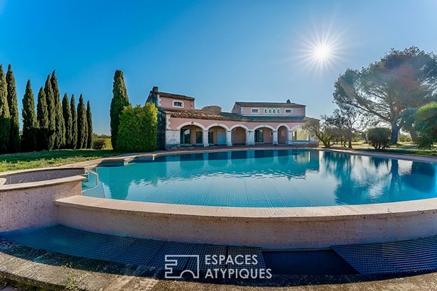 The park planted with Mediterranean species enjoys an exceptional dominant position and offers panoramic views of the magnificent natural landscapes. The house asserts its architectural character with its pink stone facade, its turret and its succession of arches composing a unique sculptural silhouette in judicious balance with the environment.