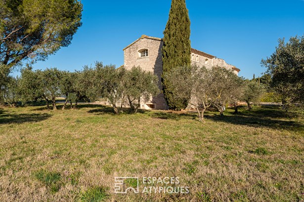 At the gateway to the Alpilles, this 222 sqm property with a swimming pool, accompanied by a separate 112 sqm caretaker's apartment, discreetly rises on a hill in the heights of Barbegal, just 10 minutes from the historic center of Arles.