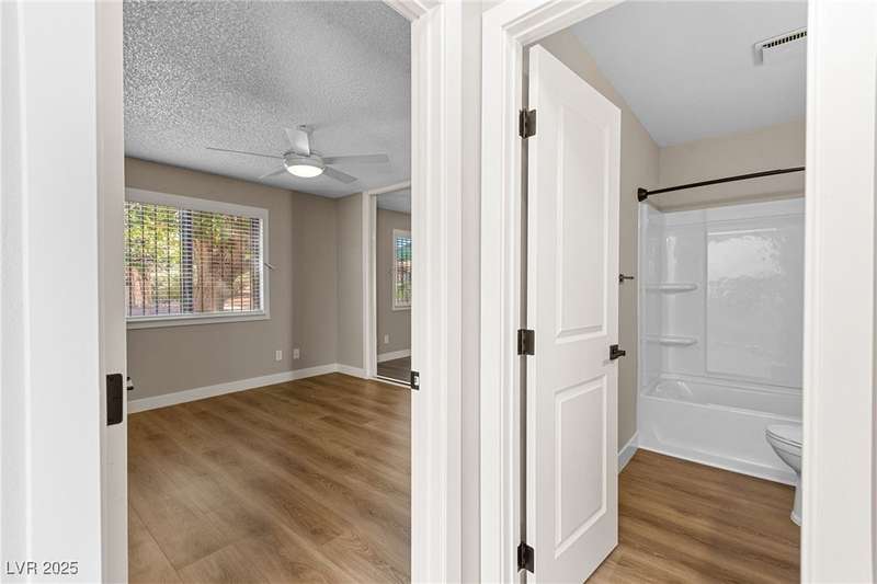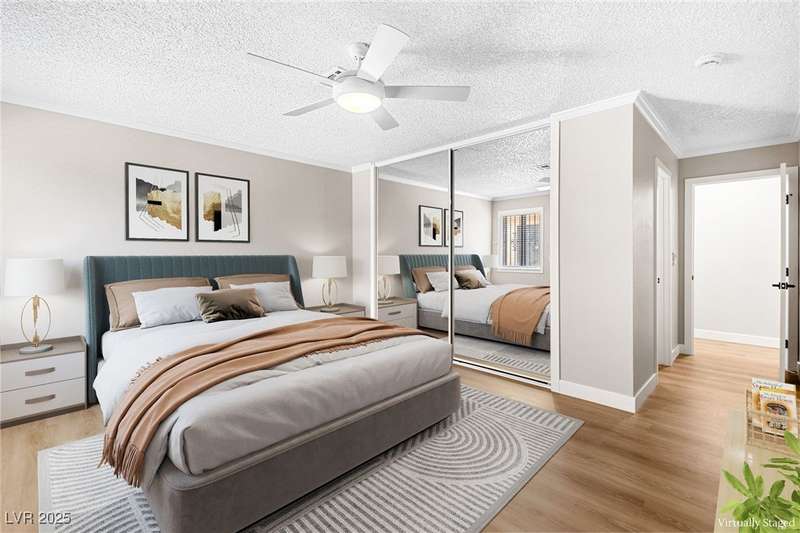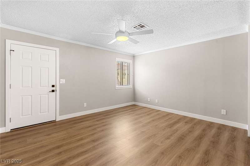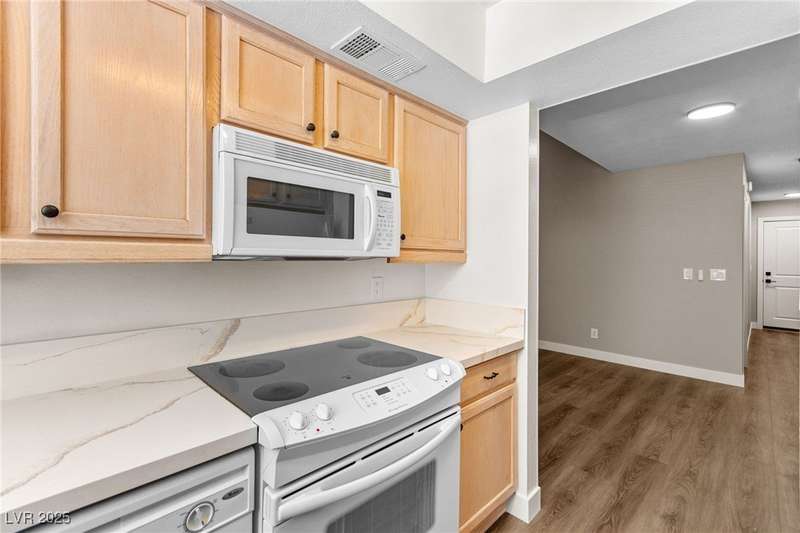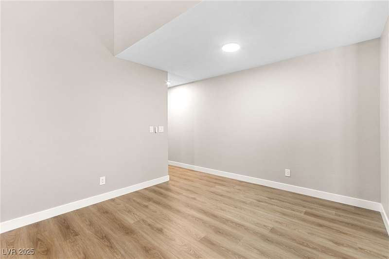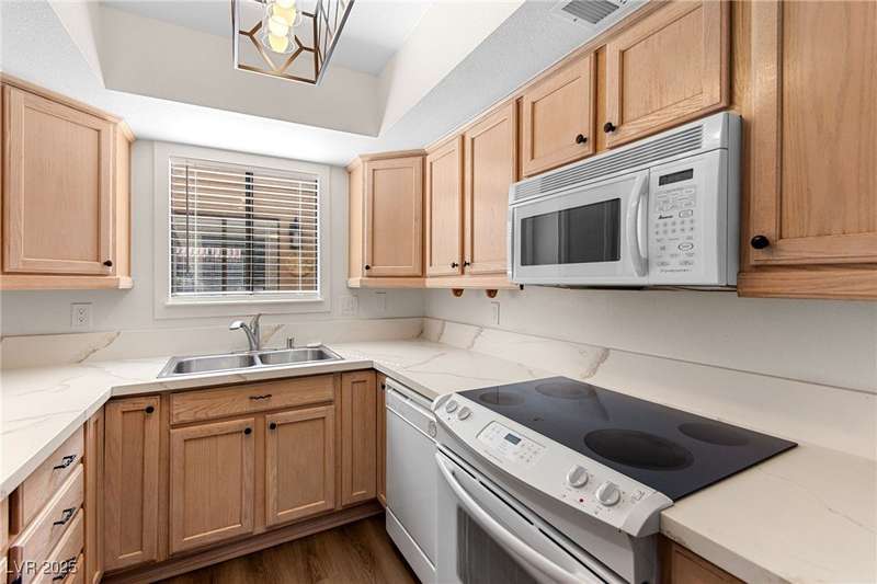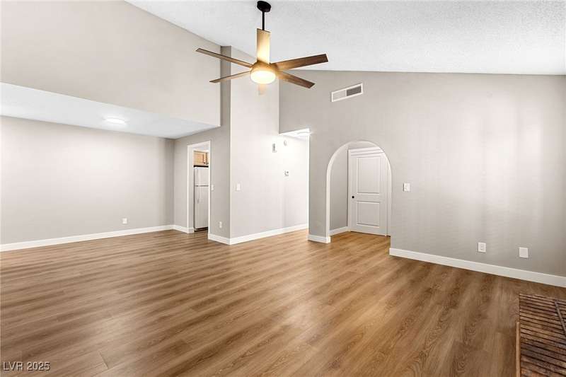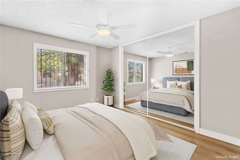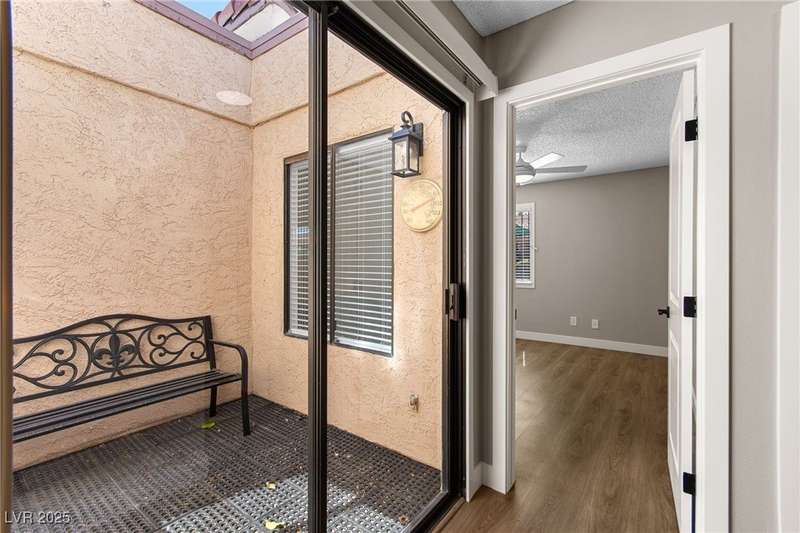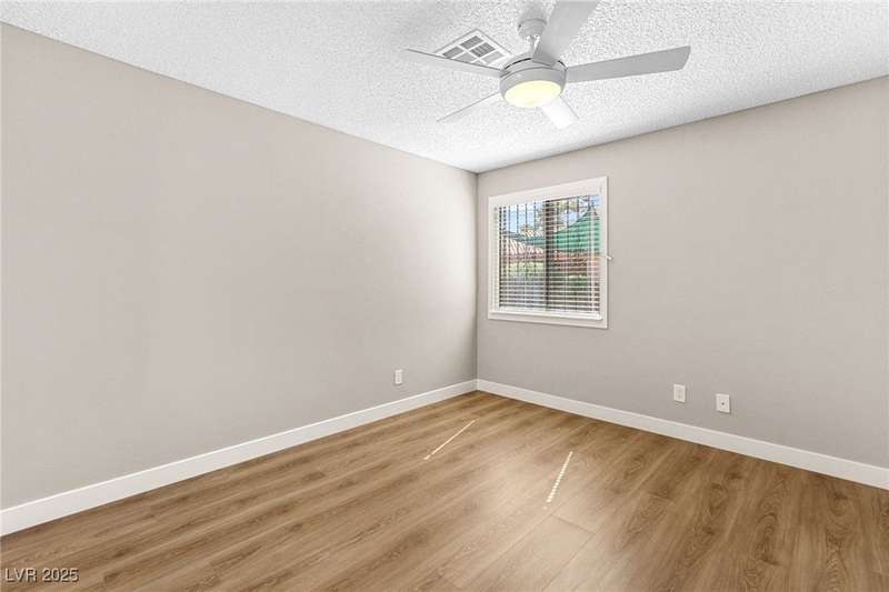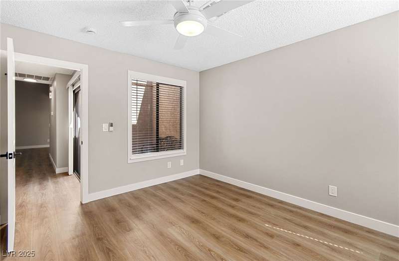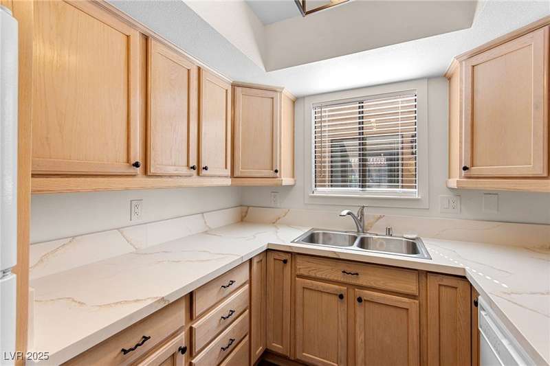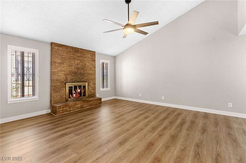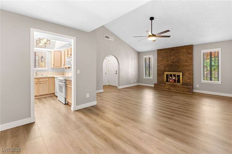 Charming one-story, fully renovated townhome with 2 bedrooms, 2 baths, and a versatile den that can function as an office or a third bedroom (door included, no closet). Enjoy an attached 2-car garage and a cozy enclosed atrium/patio. The primary suite has a private entry, and the open living area features vaulted ceilings and a striking stone fireplace. Thoughtful upgrades throughout include luxury vinyl plank flooring, quartz countertops, ceiling fans with a NEW water heater and HVAC. Residents enjoy access to a community pool and tennis courts. Conveniently located just minutes from the Strip, Airport, and UNLV.