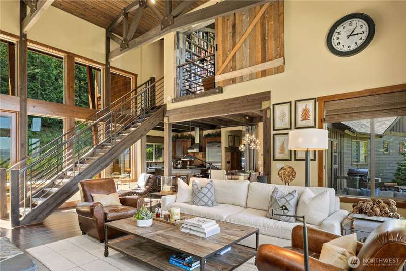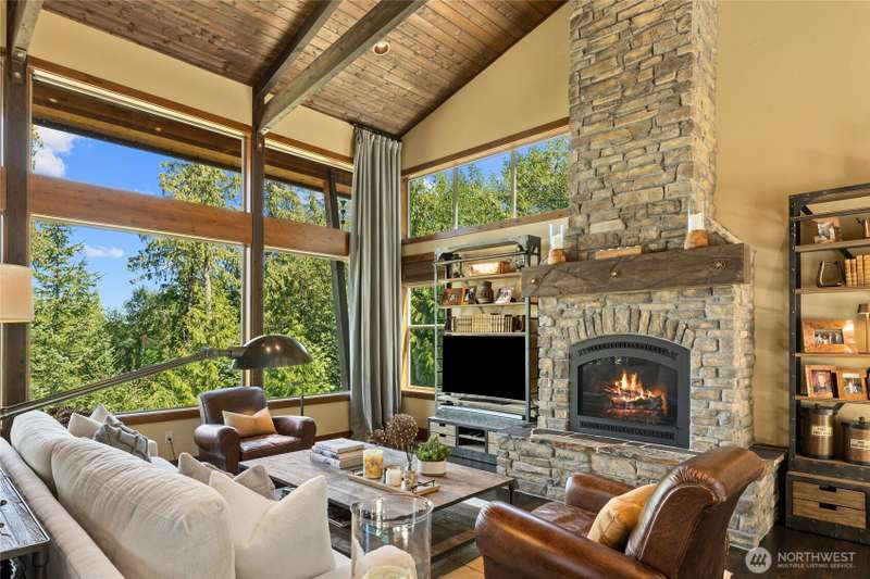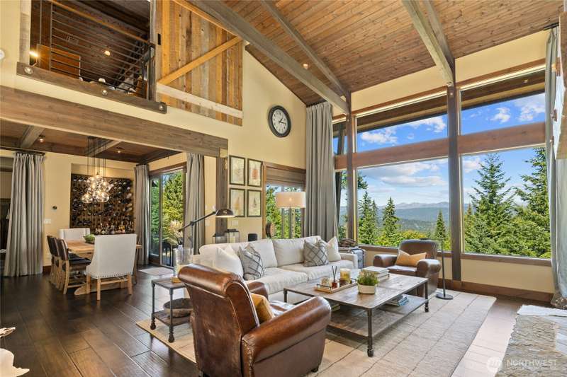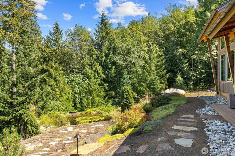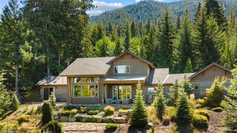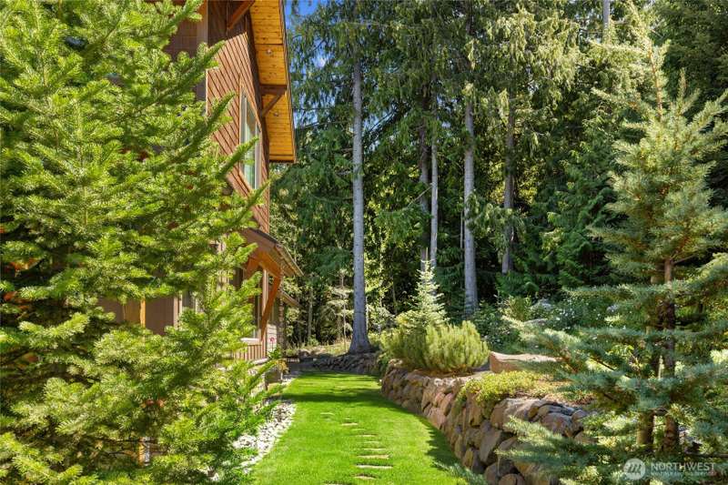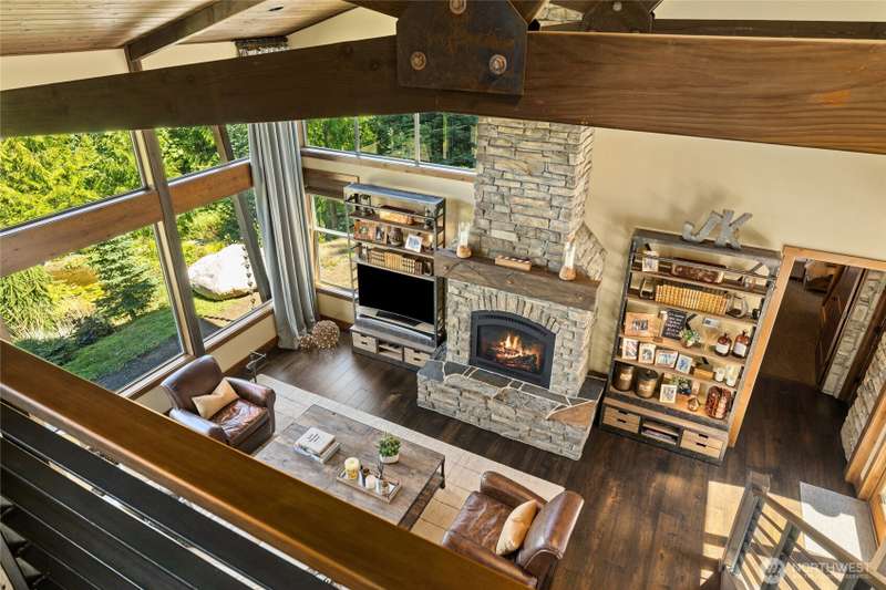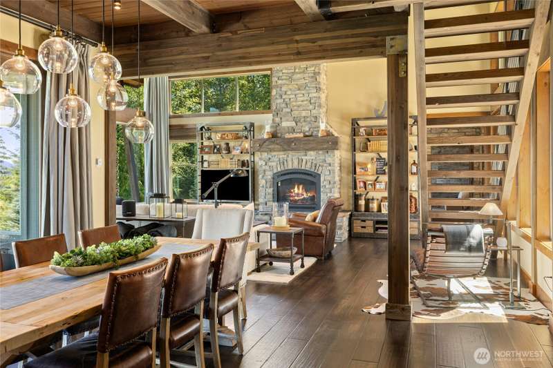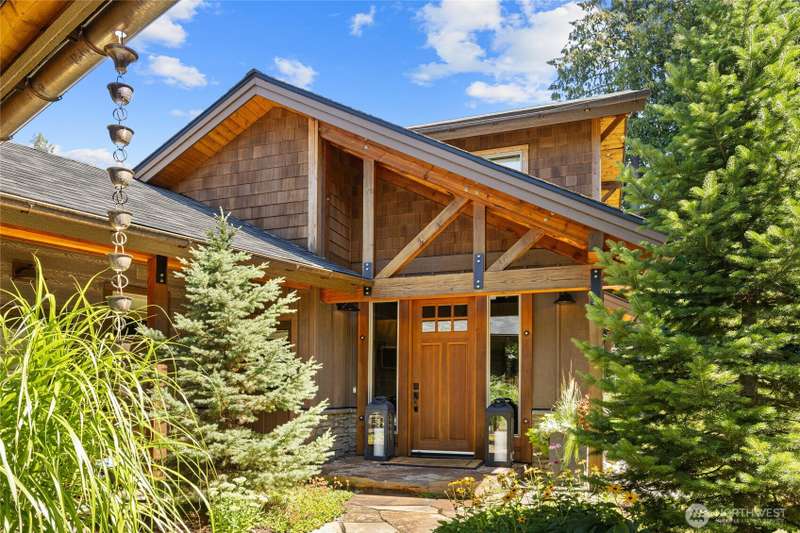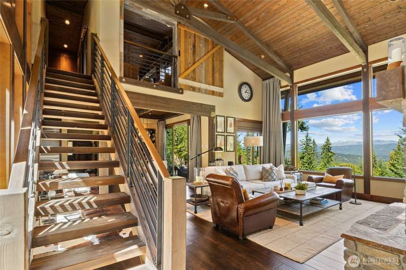 Exceptional Trailside home showcases stunning Stewart Mountain views and radiates rustic, old-world charm. Extensively upgraded, it boasts custom barnwood & stone finishes, a striking built-in wine rack, and vaulted ceilings with exposed beams & reclaimed wood planking. The library/guest room features custom built-in shelving, while a separate bunk room offers the perfect retreat for guests. Professionally designed landscaping highlights a private pond with circulating stream, full irrigation, and a cozy fire pit area. A garage car lift adds extra parking. Custom window treatments and countless details enhance this remarkable home. Gated community with access to Evergreen Snow Park offers snowmobiling in winter, ATV & hiking in summer.