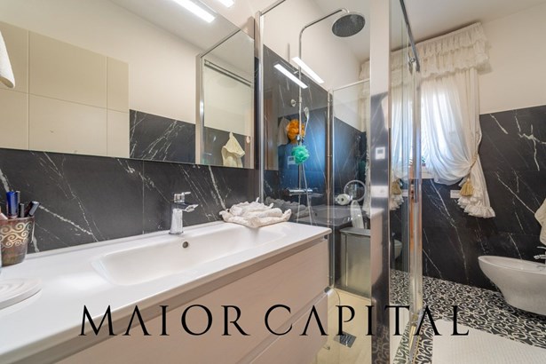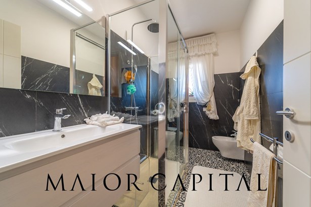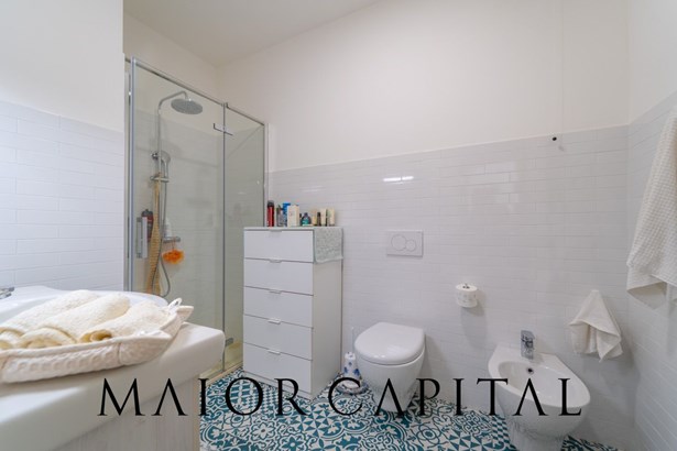 The sleeping area consists of a double bedroom with a functional wardrobe that optimises space, and a second versatile bedroom, ideal as a children's room, professional study or guest room. The property is completed by two modern bathrooms, both equipped with showers.