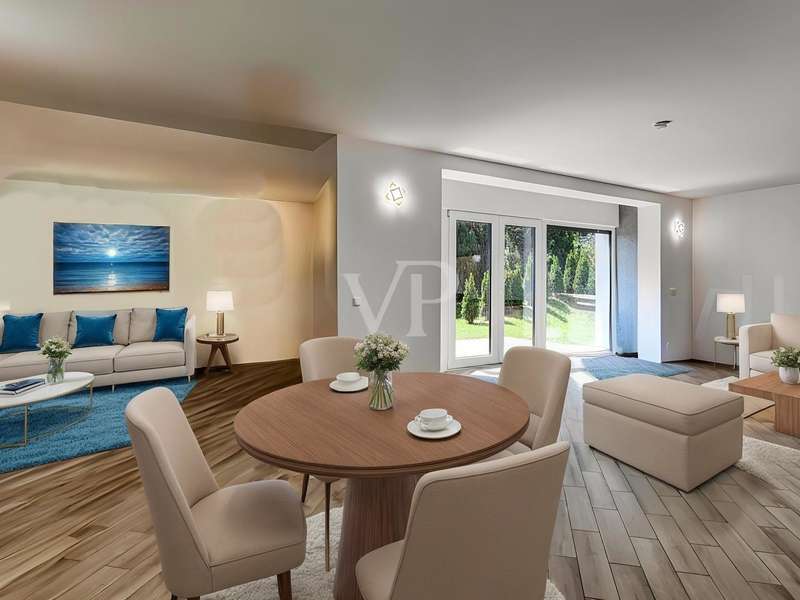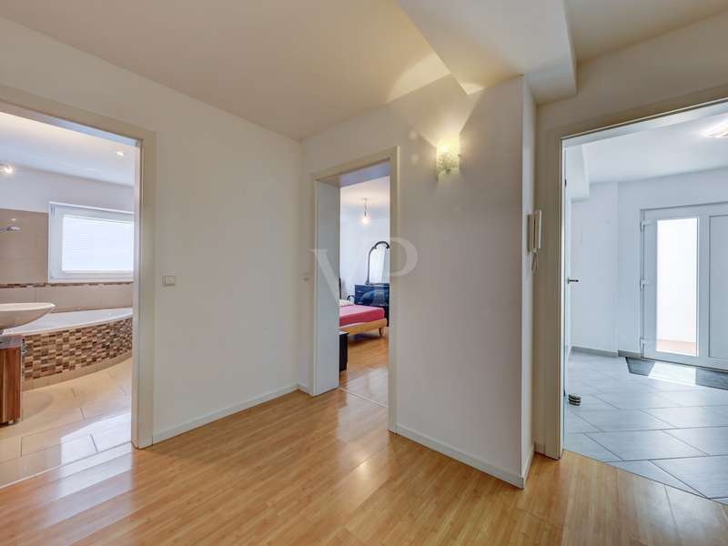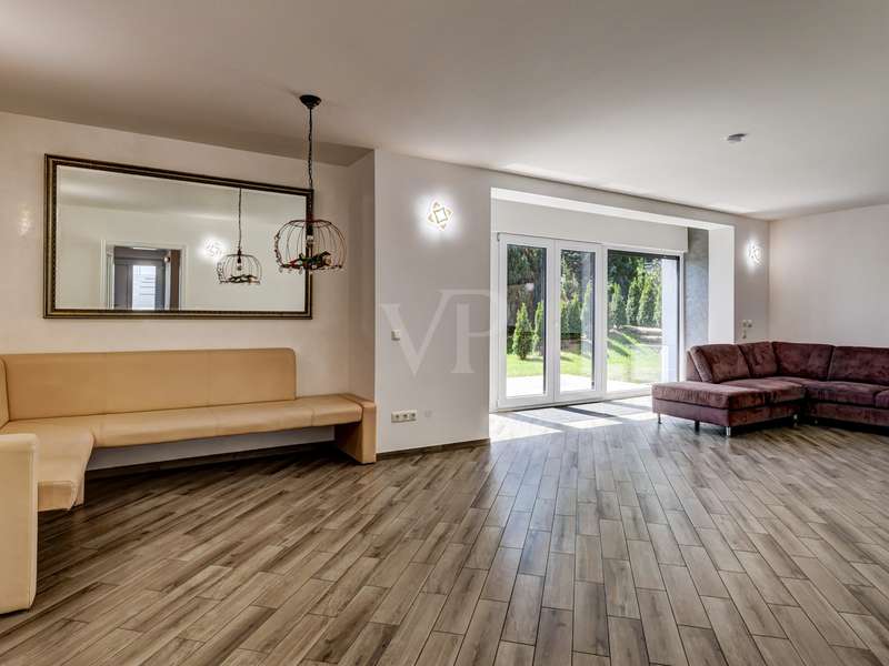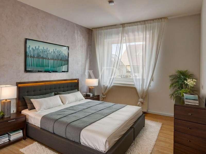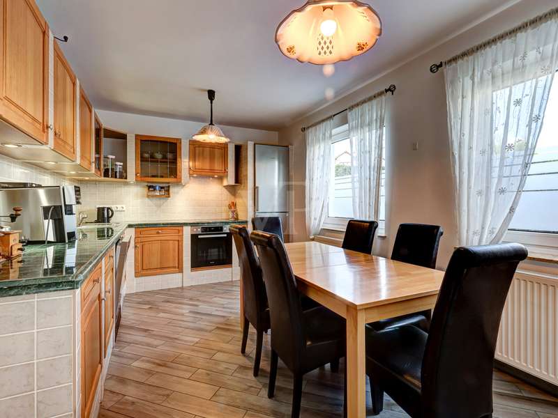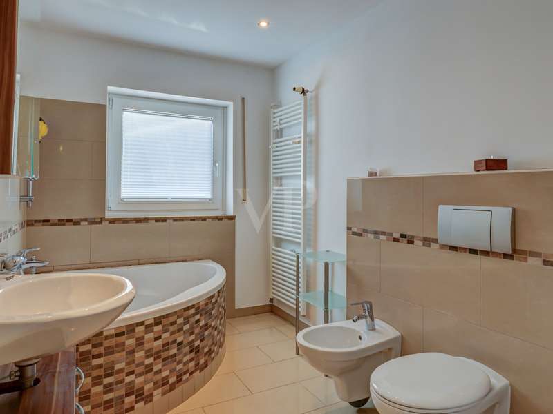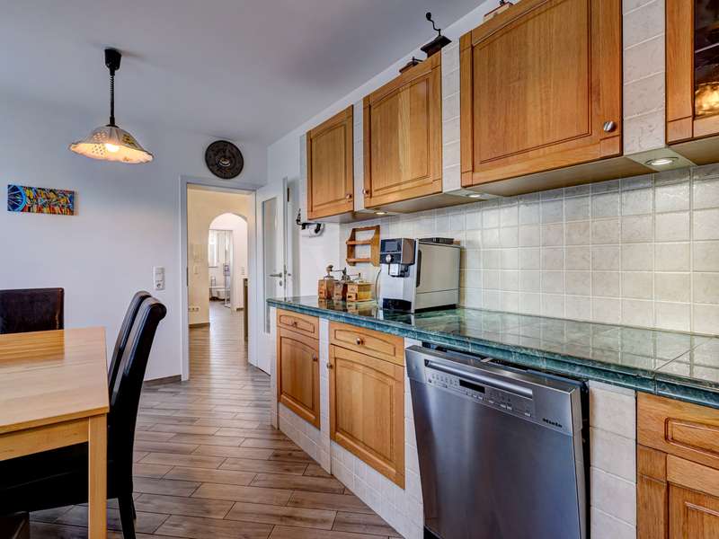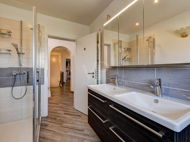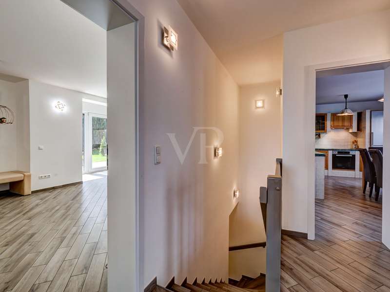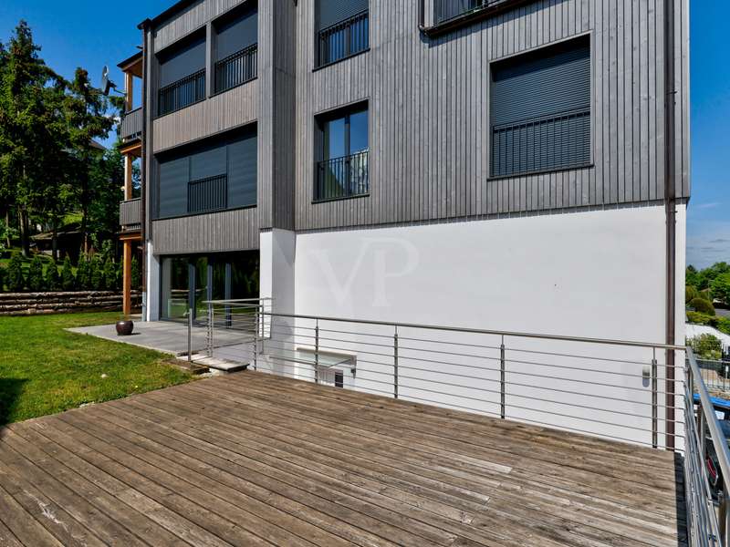 This exceptionally beautiful property is situated in a quiet, beautiful panoramic location and has around 210 m² of living space spread over two floors (garden level and hillside level). The magnificent view over Neu-Anspach invites you to relax from the very first moment - your gaze wanders into the distance, everyday life fades into the background and you immediately feel at home. The location on the edge of a field and at the end of a cul-de-sac offers not only tranquillity and pure nature, but also a protected living environment characterized by attractive, well-kept neighbourhood development in which children in particular can grow up in a protected environment. The property, designed as a house within a house, was completely renovated between 2010 and 2012 and furnished to a high standard. Just two years ago, the building was extended by adding two further, self-sufficient residential units. The property on offer here extends over the lower two floors of the building with two entrance areas, either on the courtyard side or via the staircase as the main entrance. The interior of the apartment boasts a sophisticated design concept with exclusive surfaces such as Velluto spatula technology on the walls, giving the home an elegant and timeless atmosphere. The high-quality Italian-style eat-in kitchen is a one-off design. The extraordinary look, the good equipment with brand-name appliances in mint condition and granite worktop ensure cooking enjoyment at a high level. The heart of the apartment is the spacious living/dining room with direct access to the idyllic outdoor area. A large panoramic window and the floor-to-ceiling window front provide a beautiful incidence of light and a view of the greenery. Elegant wood-effect tiles lend the entire floor a stylish character. Two spacious bedrooms with soft color accents through the exquisite wall design in spatula technique offer plenty of space and score with a fantastic view over the Taunus nature. A spacious daylight bathroom with shower and double washbasin as well as a checkroom, which can also be converted into an additional guest WC thanks to the existing water connections, complete this living level. On the ground floor, there are two further bright living rooms as well as a large hobby room, a modern daylight bathroom with corner bath and a kitchenette in the utility room. The hobby room of around 18 m² can be used for living purposes or as a usable area (included as living space in the floor area). Thanks to the separate entrance, this area can be used flexibly and is ideal for freelancers, multi-generations, au pairs or guests. A modern pellet heating system in combination with solar thermal energy and façade insulation ensures a sustainable heat supply and low operating costs. The plot size of 860 m² refers to the entire property. This residential unit accounts for 334/1000 of the common property. The separate property for the residential unit on offer includes two terraces, a garden area and a large double garage with an electric door and two parking spaces in front of it. The upper garden area with beautiful trees can also be used communally. In a beautiful location on the edge of a field, this special property not only impresses with its phenomenal view, but also with its ready-to-move-in condition - an all-round harmonious home and a truly unique property for people who demand style, living quality and sustainability.
