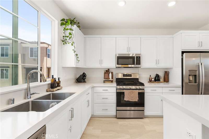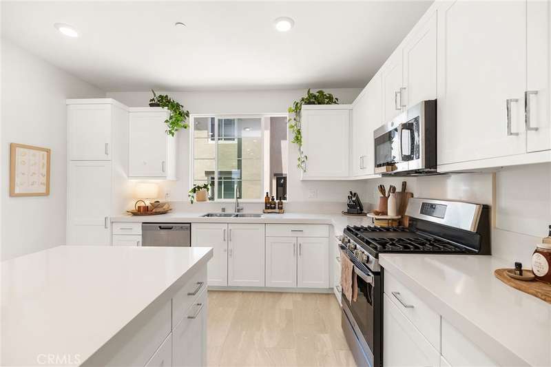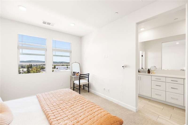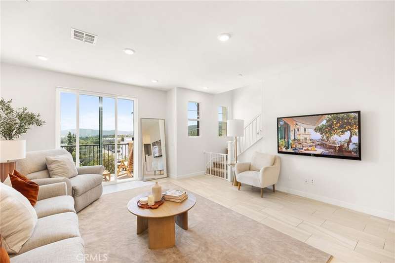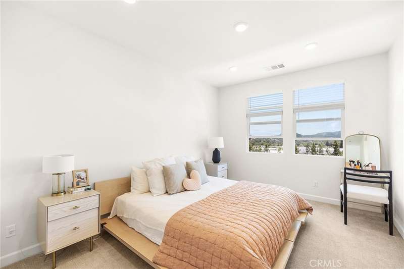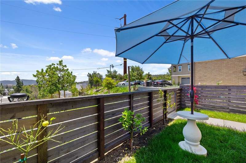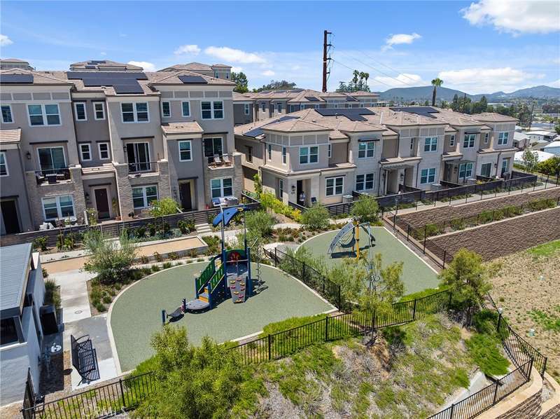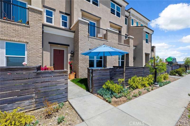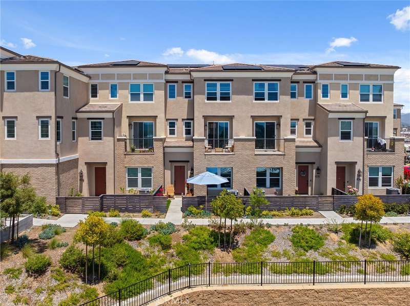 TURNKEY, Gorgeous 3 bedroom, 3 1/4 bath, 1858 square feet townhome located in the sought-after gated Sunrise View Community. This home boasts Italian stone flooring and upgraded carpets throughout. Beautiful natural light shines through windows that face lush mountain and hill views. An added bonus would be the colorful sunrise that greets you each and every morning. As you enter the ground floor, an ensuite bedroom and bath are upgraded to include custom designer paint. The kitchen is outfitted with stainless steel appliances, a large island and walk in pantry. Spacious laundry room located on the second floor. The primary bedroom/ensuite and third bedroom/ensuite are located on the third floor. High energy tankless water heater and car charging capabilities located in the 2 car garage, along with steel storage racks . This home has PAID SOLAR! The sparkling community pool and spa has a covered BBQ area with seating and surrounded by lush landscaping. Play areas are placed throughout the complex. Located near the 78 and 15 freeways off Barham and Myers, this home has it all and then some!