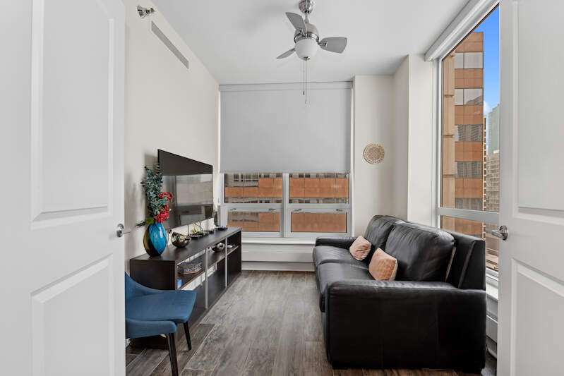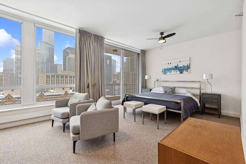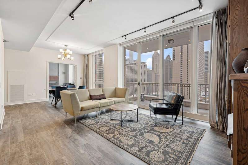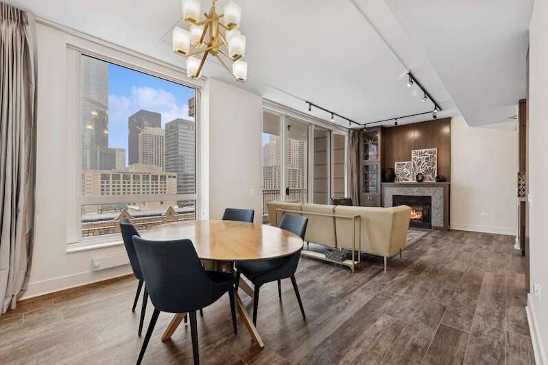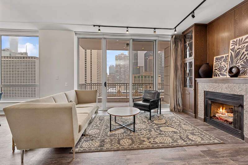 THIS UNIT IS IN BEAUTIFUL CONDITION (Buyer got cold feet). Magnificent southeast corner 2-bedroom plus office/den in a luxury high-rise. This significant remodel has amazing, bright city views from 3 large terraces. The split floorplan gives you a massive en suite primary bedroom with a large sitting area, a walk-in closet, and a bath featuring a double vanity, separate shower/tub, linen closet, and private W.C. New, wide plank wood look, porcelain flooring, gorgeous fireplace with custom surround and built-in custom cabinetry, The remodeled kitchen opens to the living space and has Wolf, Subzero, and Boshe appliances. The building features 24-hour door staff, pool, gym, sauna, and a business center-ALL steps to the Magnificant Mile and the iconic Chicago Lakefront. Large storage and 1 Parking space are included! 2ND PARKING SPOT AVAILABLE.