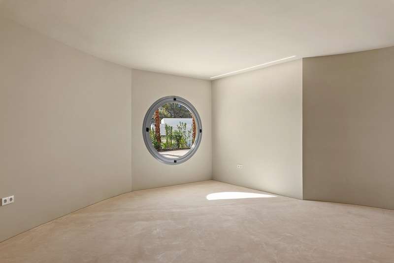 The ground floor, of the residence showcases a capacious living area intricately designed with the spiral staircase and elevator seamlessly integrated. The kitchen, partially autonomous, links to the living space through a breakfast bar and includes a separate pantry. Additionally, a guest WC is available. Expansive sliding windows establish a connection between the living room and the pool terrace, complemented by adjustable dividers that offer myriad configurations for indoor-outdoor living experiences. The terrace presents covered and open sections for varied usage.