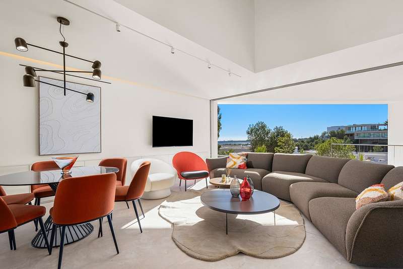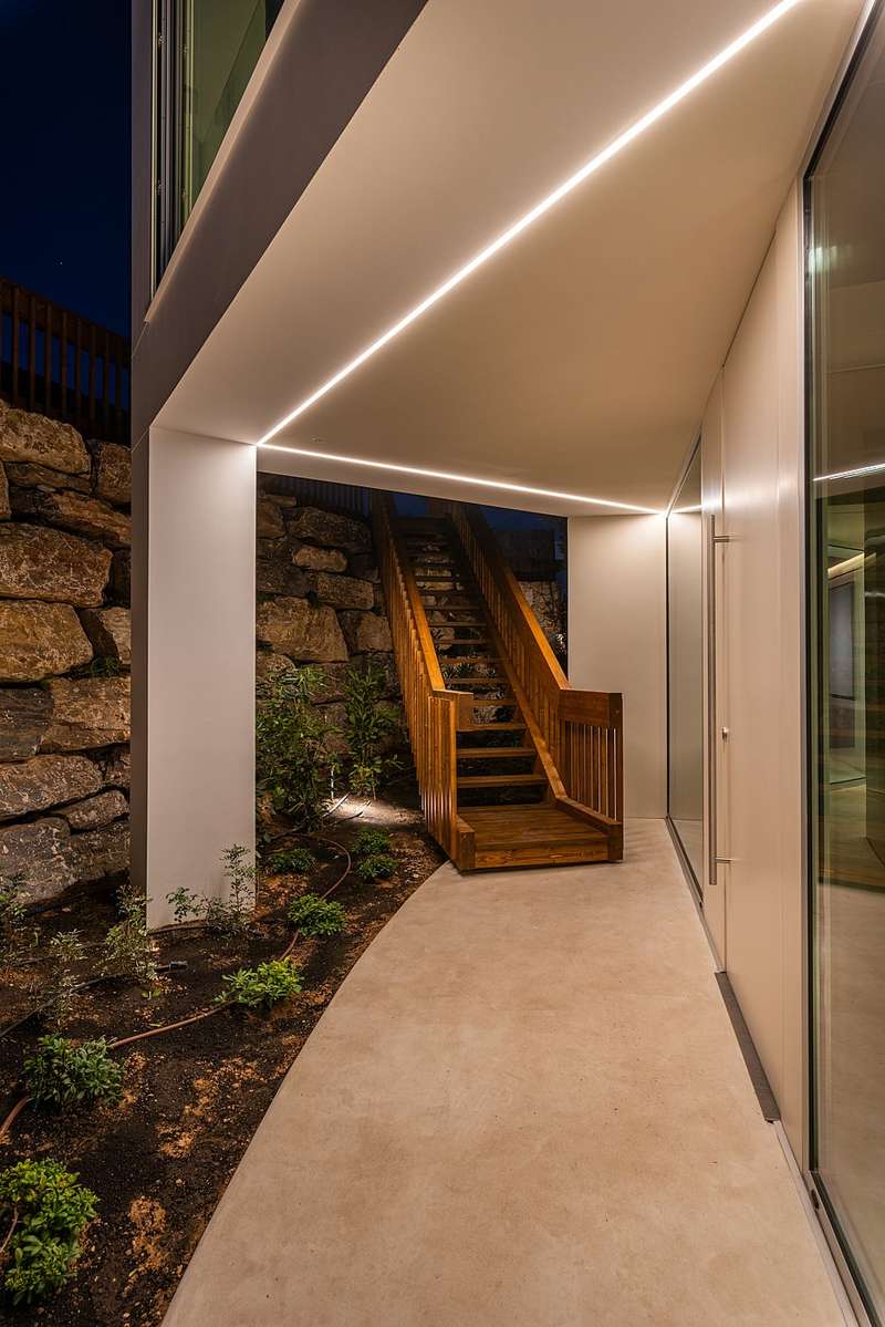 Ascending to the upper level reveals three bedrooms alongside a reading room/home office. Each bedroom is equipped with its own en-suite bathroom, with the master suite boasting two bathrooms. The innovative 45-degree layout affords rooms dual outlooks through two substantial gaps, granting each space two orientations. The facade incorporates sliding joinery and light control panels, allowing for the manipulation of ambiance by either blocking out external light entirely or exposing 50% of its surface area to the surrounding natural environment.