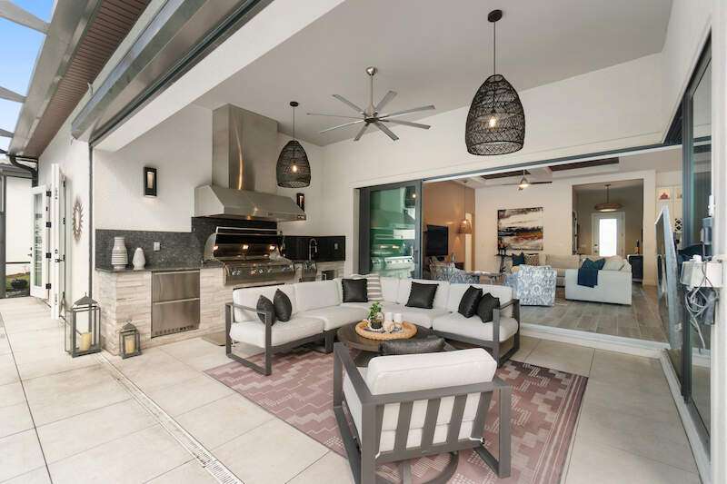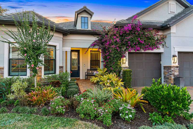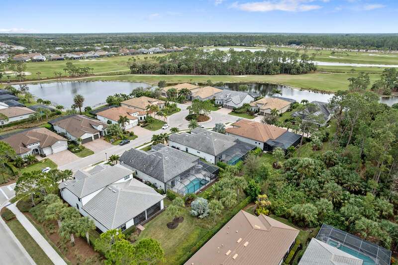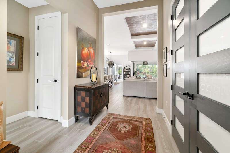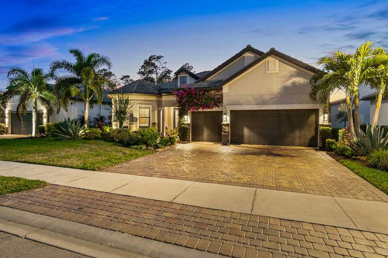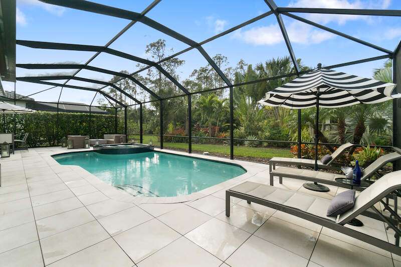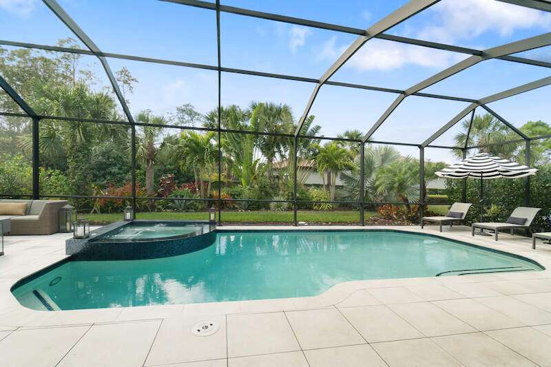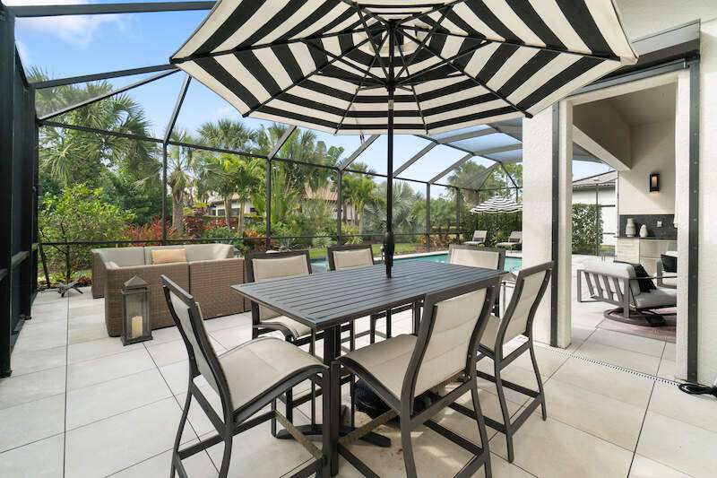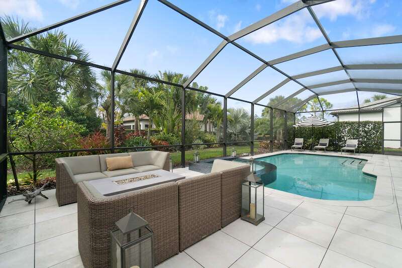 Discover a lifestyle of unparalleled luxury and leisure in the prestigious Greyhawk community. The most desired and meticulously enhanced Pinnacle model, offering 3 bedrooms + den and a 3-car garage, redefines elegance with its flawless design and sophisticated charm. OVER $200k WORTH OF UPGRADES! Designer-style furniture and decor are also available, making it effortlessly move-in ready. Enjoy the rare opportunity of IMMEDIATE GOLF membership - bypass the waitlist and immerse yourself in the world of world-class golf, a privilege rarely found in today's market. As you walk through the grand entrance, framed by vibrant bougainvillea and flowering plants, you'll feel the warmth of a space and tons of natural light. The living room, with its coffered ceilings lined in real wood wallpaper, sets the tone for a home that's equal parts stylish and inviting. Sunlight streams through added French doors in the kitchen and master bedroom, creating a seamless connection to the outdoors. In the kitchen, the details are a chef's dream: upgraded kitchen cabinetry with above lighted glass cabinets, a custom pantry, wine fridge, electric hot water dispenser that ensures your morning coffee or evening tea is always within reach. Every space has been thoughtfully enhanced, from the illuminated mirrors and upgraded lighting to the custom-built closets that keep everything perfectly in place. This home features sleek tile flooring in all areas, and luxurious wood flooring adds warmth and elegance to the master suite. Step outside, and your private oasis unfolds. Nestled on a secluded lot, the home is surrounded by lush landscaping that transforms the space into a serene retreat. As evening falls, custom outdoor lighting casts a warm glow, creating an enchanting atmosphere perfect for relaxing or entertaining under the stars. Entire lanai deck pavers have been removed and replaced by non-slip ceramic tiles. Picture evenings by the saltwater pool and spa, renovated with elegant tile, and controlled effortlessly by a phone app. Cooking in your fully equipped outdoor kitchen, featuring a FireMagic grill, is a true delight. The upgrades continue with features designed for effortless living: hurricane impact doors and all windows, lanai hurricane electric roll-down screens for added safety, a Generac natural gas-fed generator, the air-conditioned and insulated garage, complete with electric storage racks and pull-down attic access, that is as functional as it is impressive. And the list goes on! This is your opportunity to not just own a home but to embrace an extraordinary lifestyle. Schedule your private showing today, and let your story begin here.