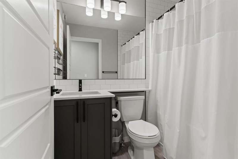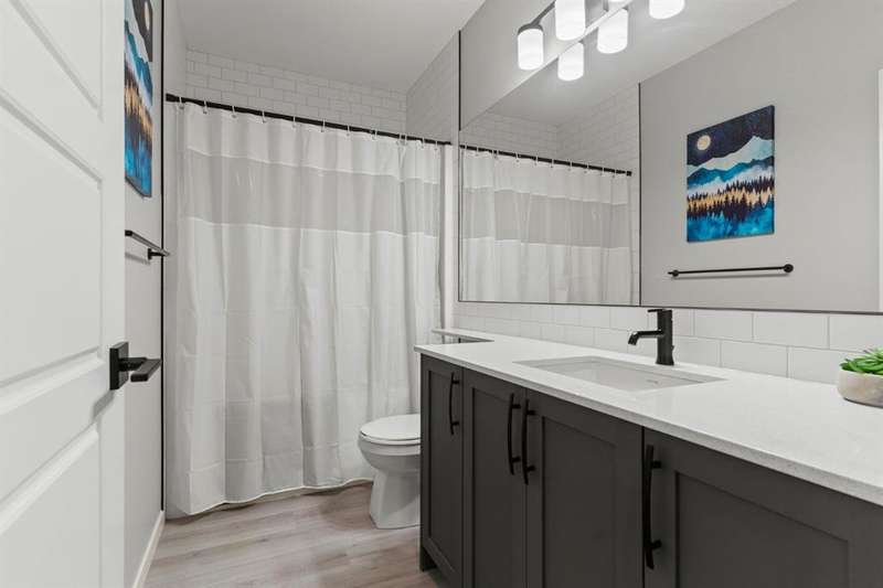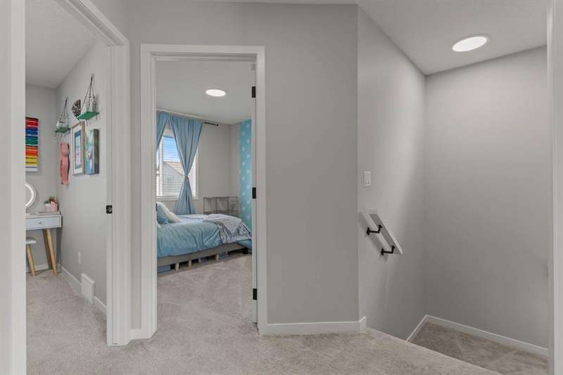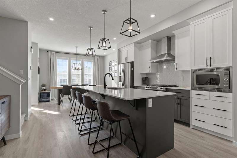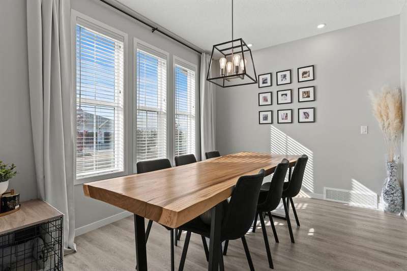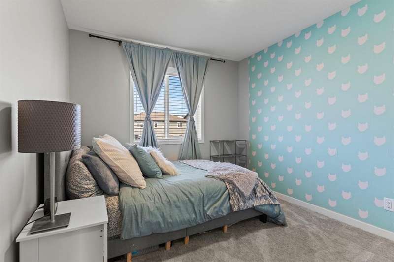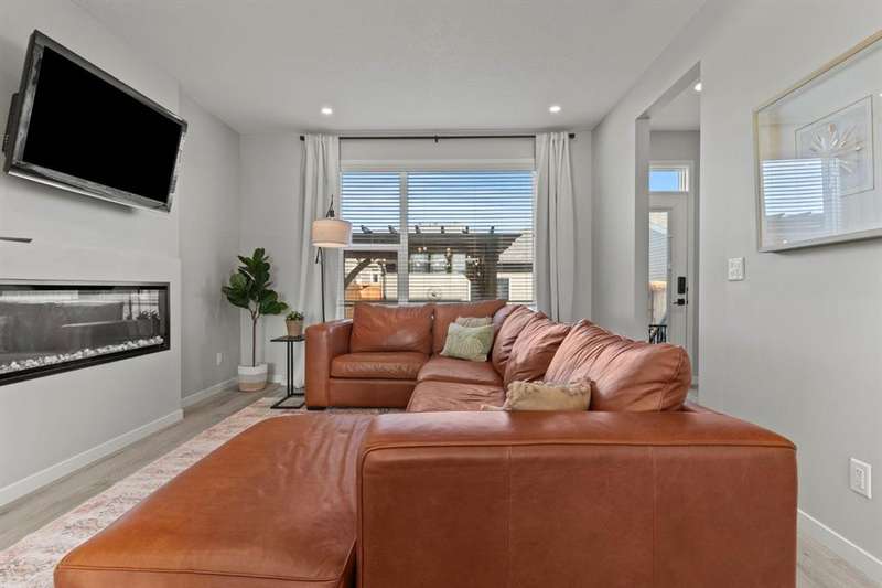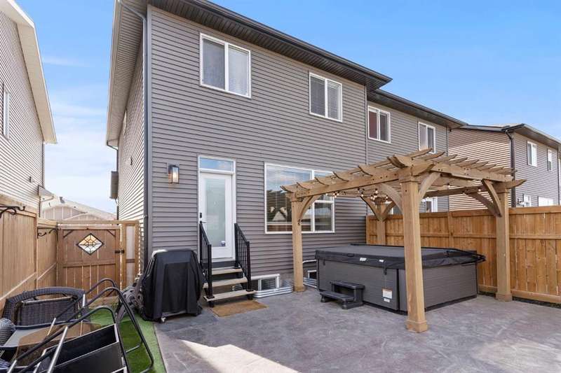 Welcome to this stunning, semi-detached 2-storey home in the sought-after community of Wedderburn in Okotoks -where modern design meets small-town charm. Offering over 2,100 sq. ft. of total living space, this 5-bedroom, 3.5-bath home provides exceptional comfort for growing families, busy professionals, or anyone looking for a move-in-ready property that has it all. The stylish and inviting main floor features a bright and open layout with large windows that fill the space with natural light. The designer kitchen combines beauty and performance showcasing quartz countertops, upgraded stainless steel appliances including a gas range and ceiling -height cabinetry. The central island is perfect for casual meals or for ease in entertaining and there is a spacious dining area creating an ideal gathering space for family and friends. A convenient 2 pce powder room and versatile back entry space with built in bench and hooks complete the main level. Upstairs, you’ll find three comfortable and spacious bedrooms, including the warm and welcoming primary retreat complete with a convenient walk-in closet for all your storage needs. The ensuite offers thoughtful touches with dual sinks, a large stand-up shower, and warm modern finishes — the perfect start and end to your day. A full main bath and upper-level laundry add everyday functionality. The basement is fully finished and expands your living options with a cozy family room, two additional bedrooms, and a 4-piece bathroom perfect for guests, teens, or a home office setup. Step outside and enjoy your private low-maintenance backyard oasis, highlighted by a stamped concrete patio, charming pergola with café lights, and a hot tub for year-round relaxation. There’s no grass to mow, just space to unwind and entertain in your backyard oasis. The property also features air conditioning for summer comfort and a double detached garage off the back lane for parking and storage options. You are ideally located close to community walking paths, playgrounds, and the many amenities that Okotoks has to offer, this home truly combines modern living with community warmth.