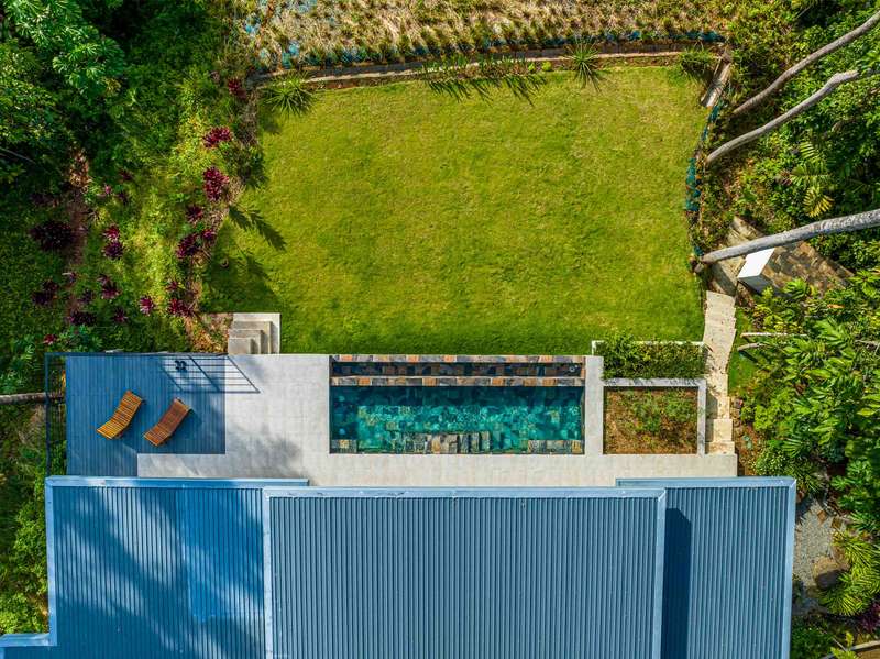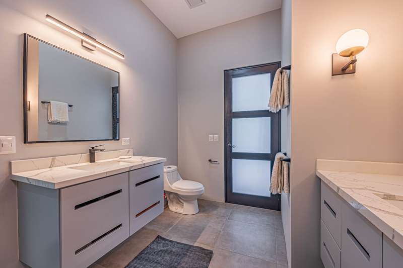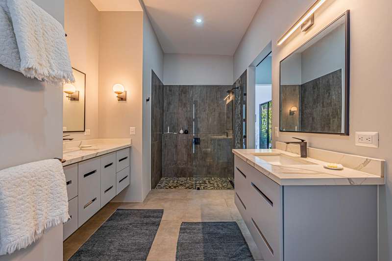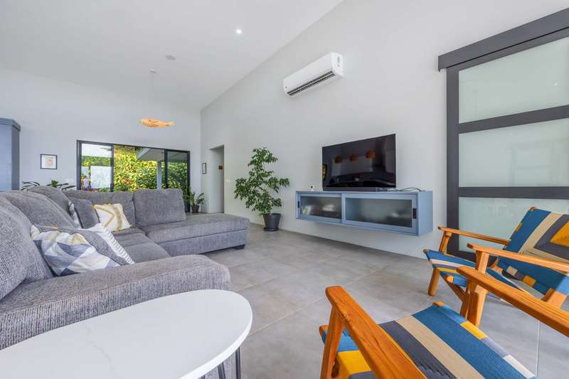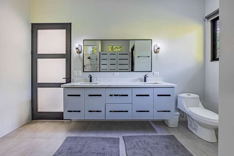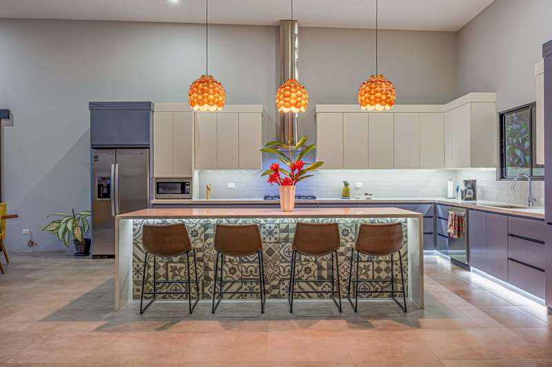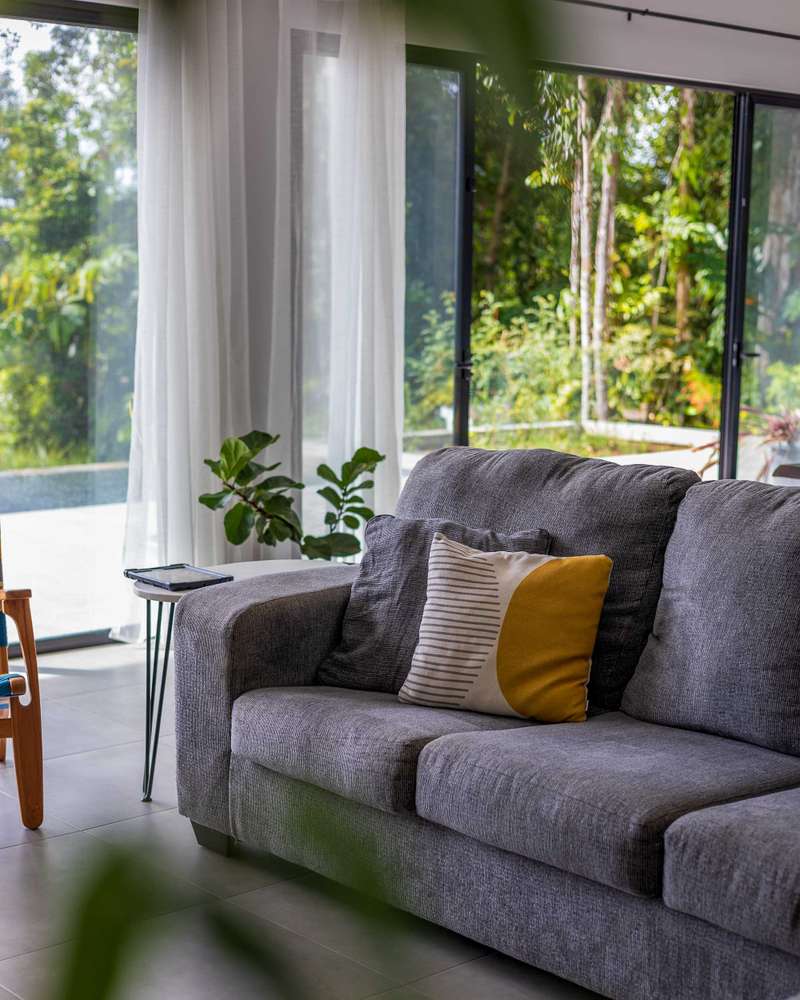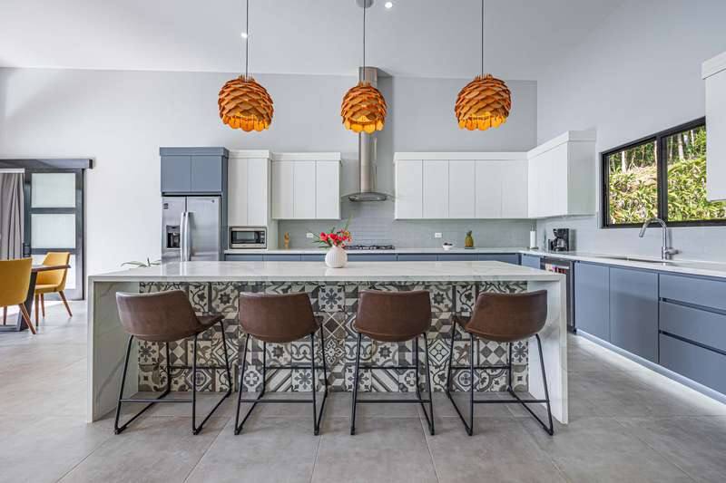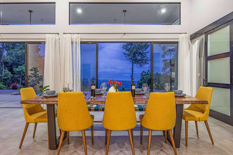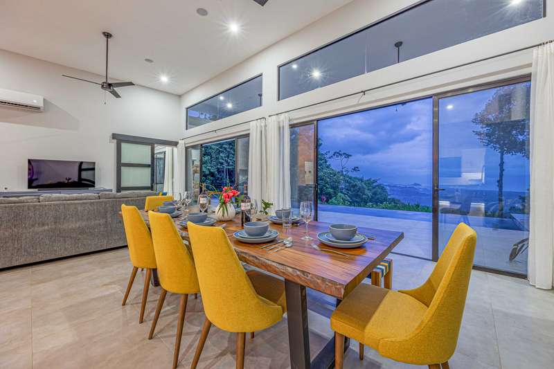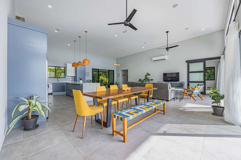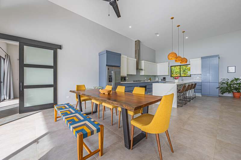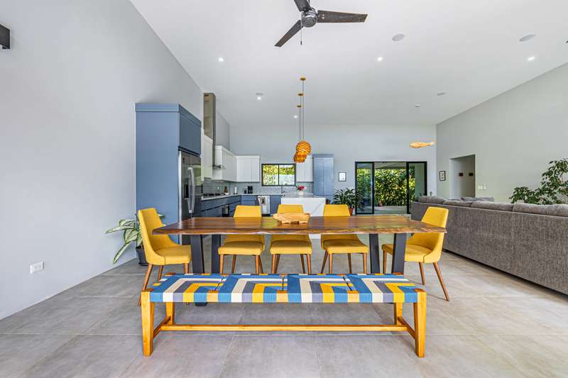 The home comes fully furnished with exceptional pieces, including a solid Guanacaste wood dining table that seats eight, and handwoven Masaya fabric chairs and benches in the living room. Two of the three bedrooms are outfitted with luxurious king beds and premium linens, while the third bedroom offers both a queen and twin Guanacaste wood bed set.