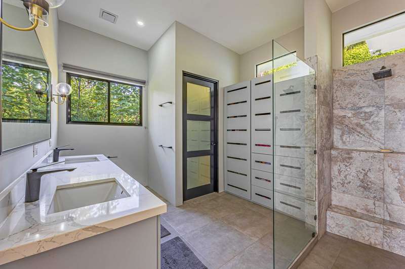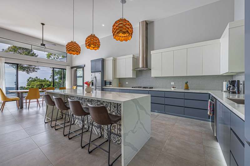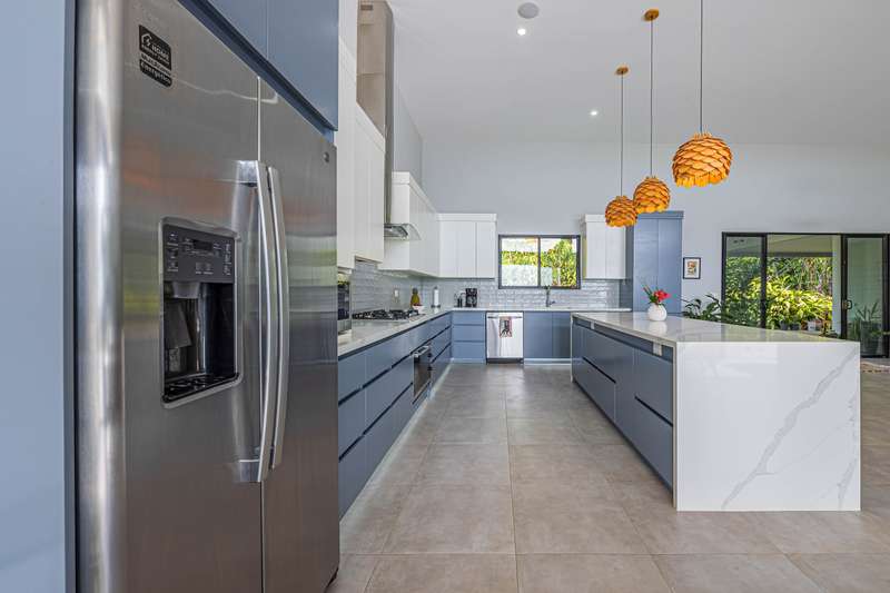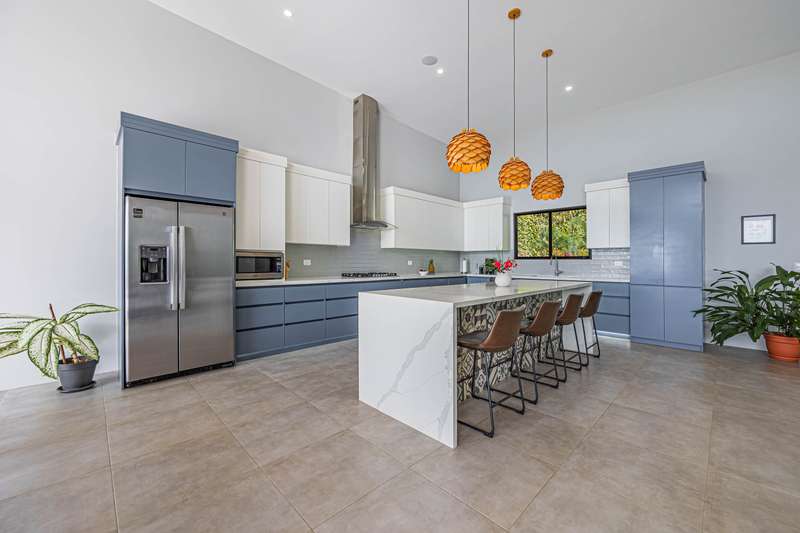 This single-level masterpiece, built in 2022, is perfect for a large family or a couple seeking a serene retirement haven. The open-concept design seamlessly connects modern luxury with natural beauty. As one of the finest luxury properties Parrita, the oversized great room features top-of-the-line appliances, including a high-grade electric convection oven, a five-burner propane cooktop, a 28-cubic-foot refrigerator with an ice maker, a dishwasher, and a garbage disposal. All are complemented by expertly crafted cabinetry and stunning Italian-imported quartz countertops.