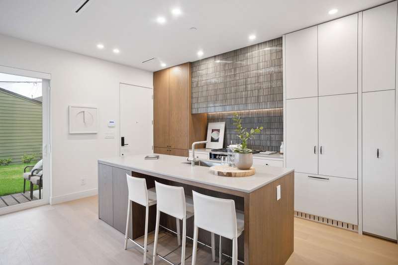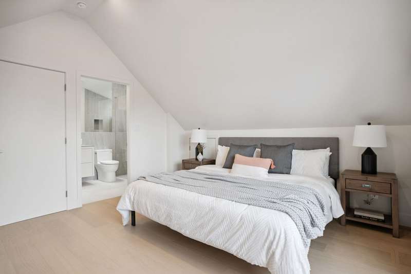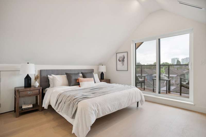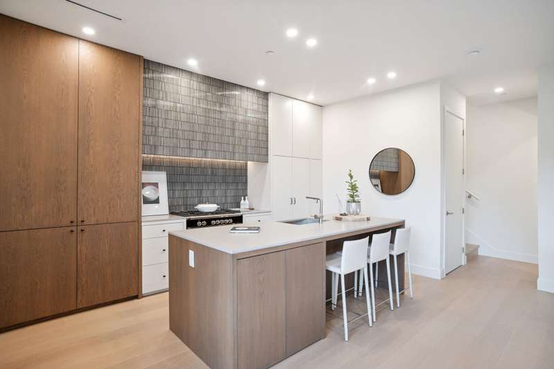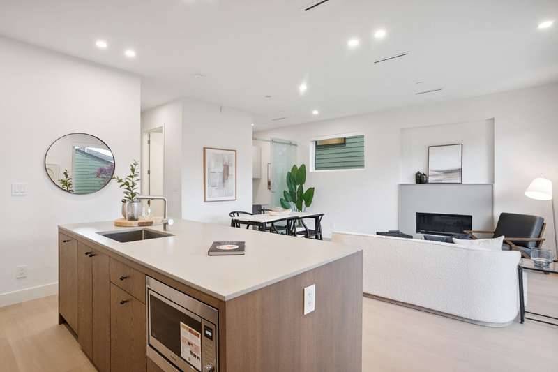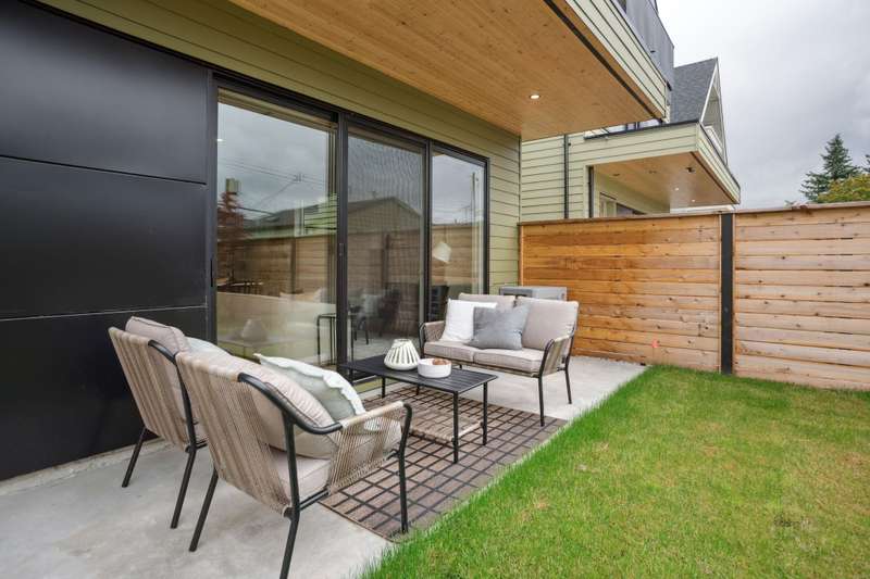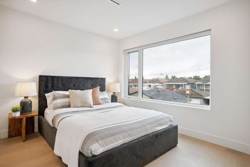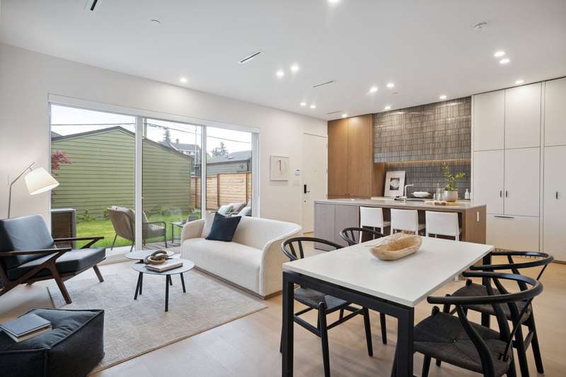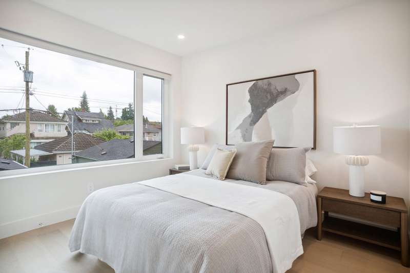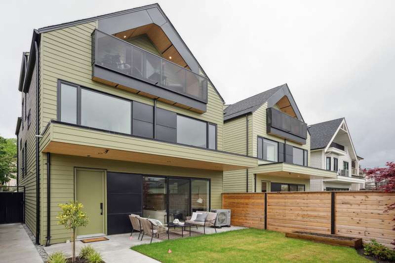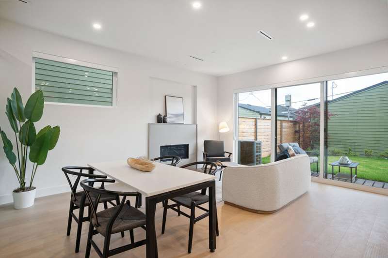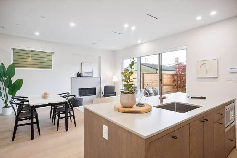 Mizan Developments & Architrix Design Studio present this stylish 1/2 duplex home in the desirable Kensington/Cedar Cottage neighbourhood of East Van. Each home offers 3 beds+Den/3.5 baths, an open-concept main floor, and luxurious earth-tone finishes, including quartz countertops, brushed oak flooring, and a gas fireplace. Kitchens feature large islands, Fisher Paykel appliances, and custom cabinetry, leading to spacious at grade outdoor patio and fully fenced private yard. The primary bedroom has a spa-like ensuite and large walk-through closet. Spacious upper level bedroom with sliding doors leading to the deck to enjoy the view. Detached garage with EV capable parking. Schools:Lord Selkirk Elem & Gladstone Secondary.