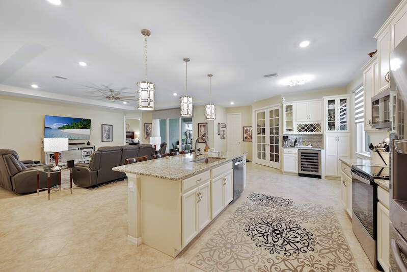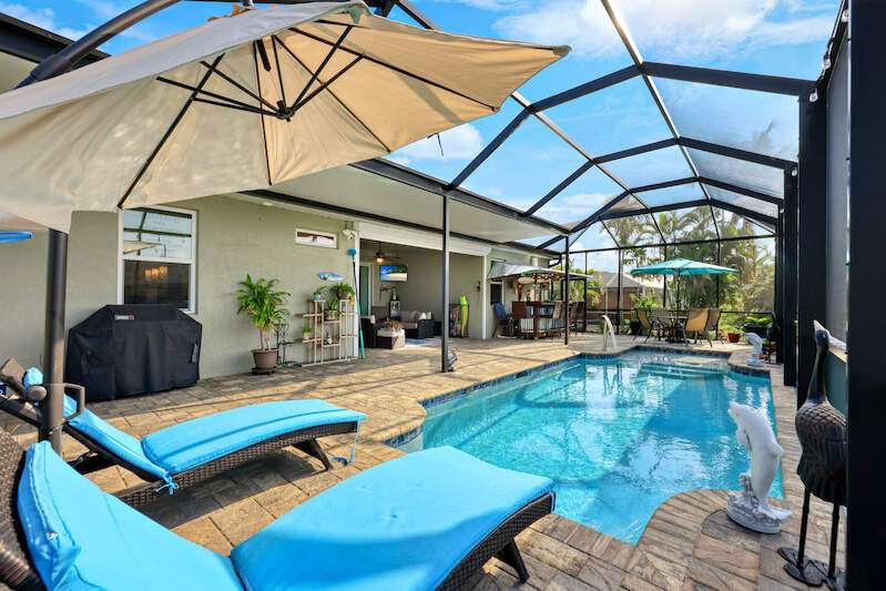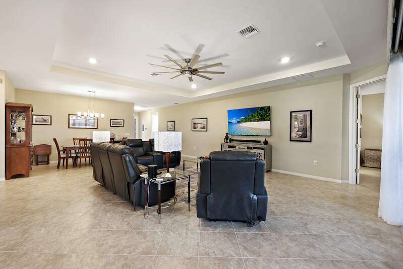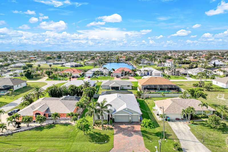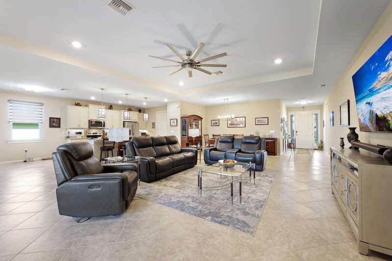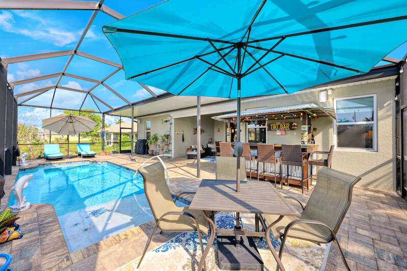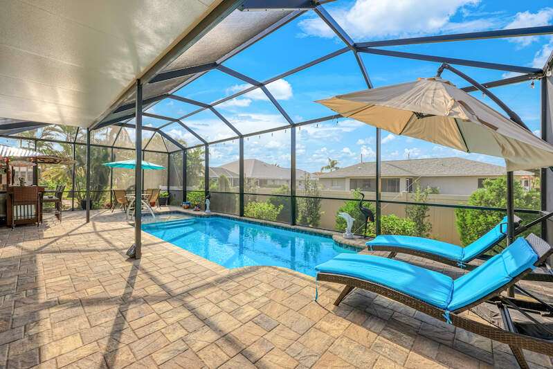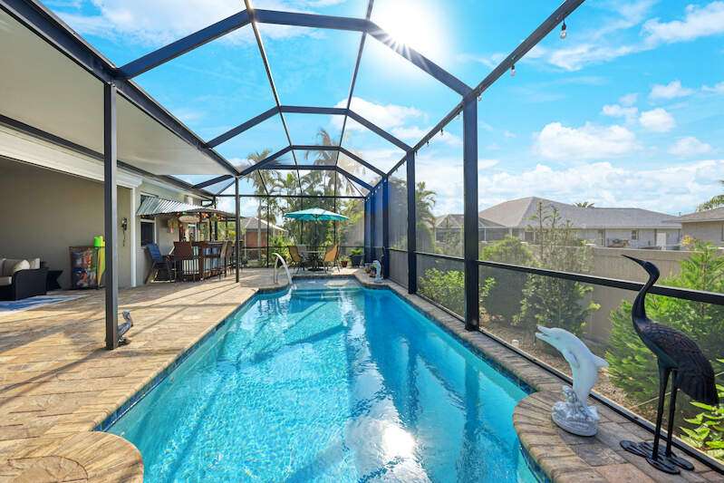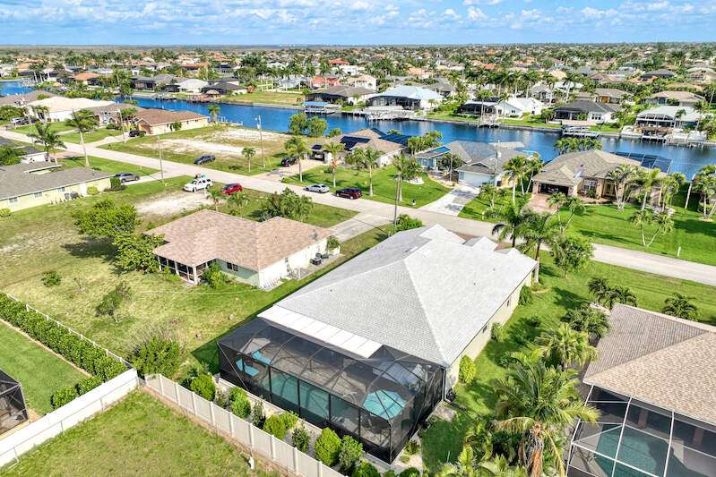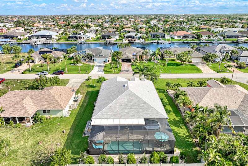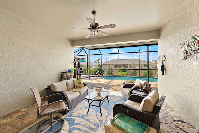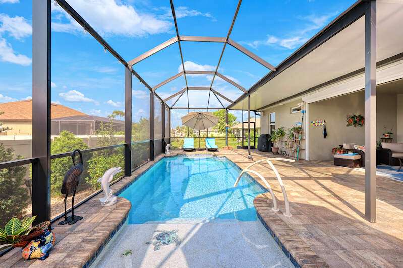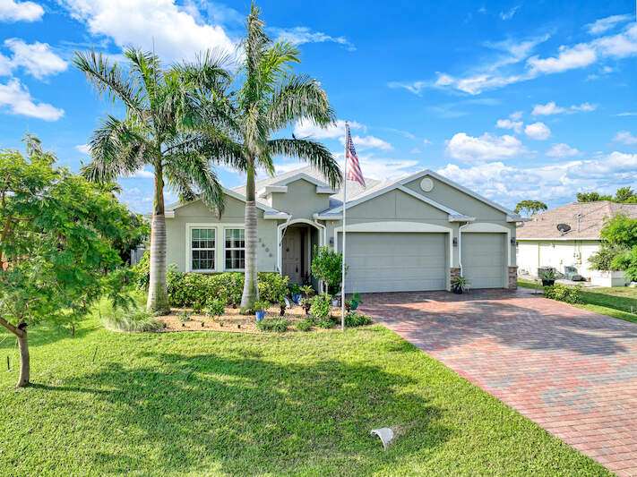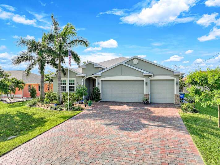 Don't miss out on this 2020 custom built home in the heart of Cape Coral! This ranch home entails 3 bed + den, 3 full baths, 2,300+sqft and a custom pool! Enter your home through its foyer into a HUGE open concept area that includes the kitchen overlooking the living room area. Stainless steel appliances, 42" cabinets, pull out drawers, walk in pantry, and wine fridge are just a few on the many features you'll find in your future kitchen! Stress free living comes with this home knowing all windows and doors are IMPACT rated, including electric storm smart hurricane screens for back patio! Entertain your guests with your future SOUTH facing saltwater pool thats heated and includes a tiki bar! 2023 Roof and Pool cage NEW in 2023. Plenty of storage space included with your 3 car epoxy floor garage and two overhead storage racks 4ft x 8ft. Your laundry is situated off the kitchen in your spacious mud room with your AC air handler located inside home to help prolong life of the unit and limit humidity. Other features include extra shelving in bedroom closets, 8ft interior doors, tile in the main areas and carpet in bedrooms, partially fenced backyard, and automatic sprinklers. Located near SWFL beaches including Fort Myers Beach, Sanibel Beach, tons of shopping and Cape Coral's finest restaurants, and plenty of marina's nearby to store your boat! Book your showing today!