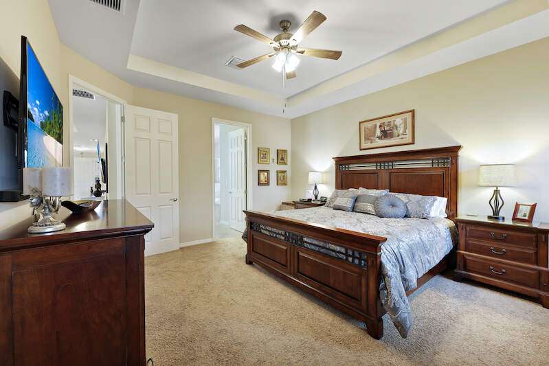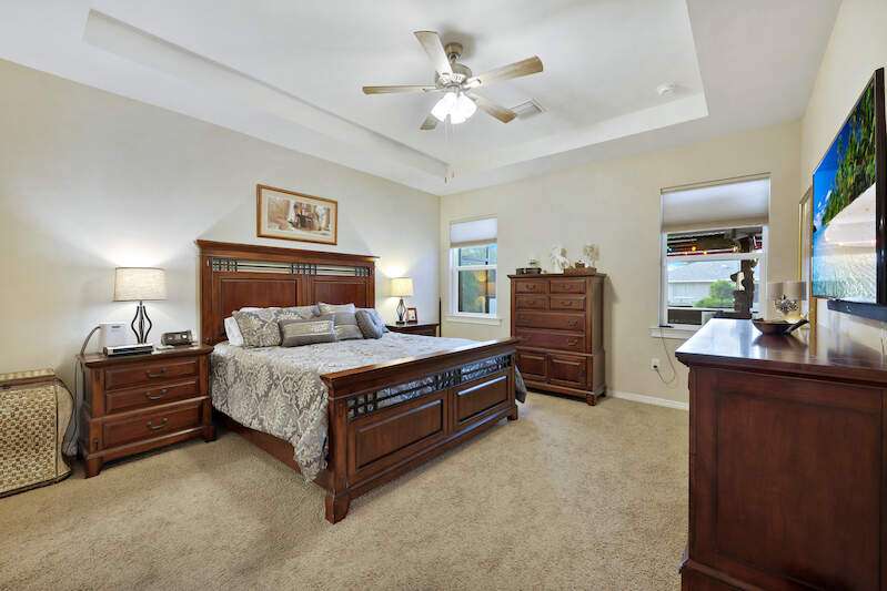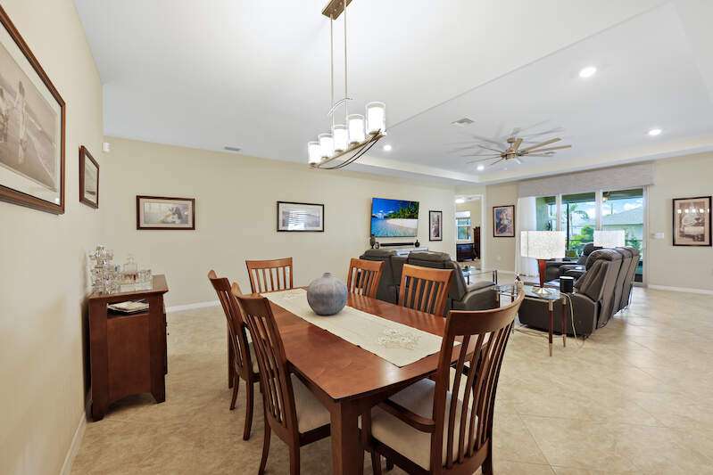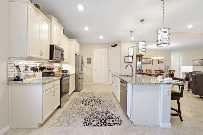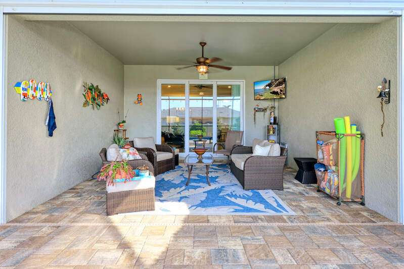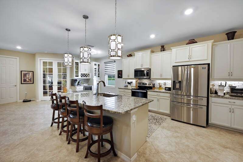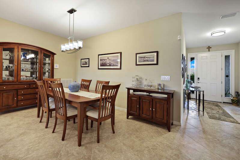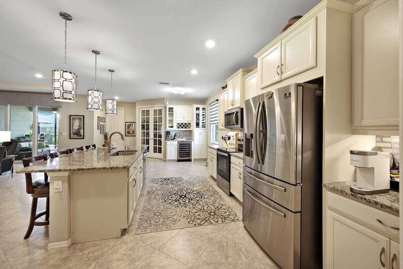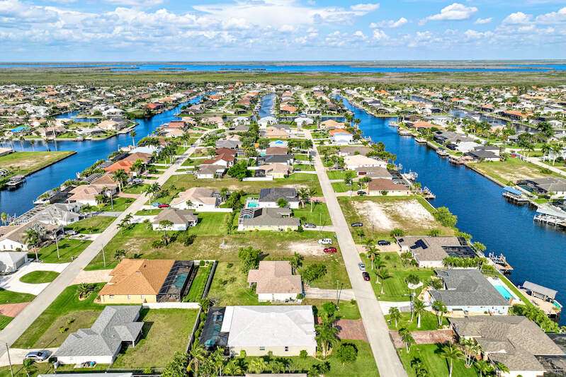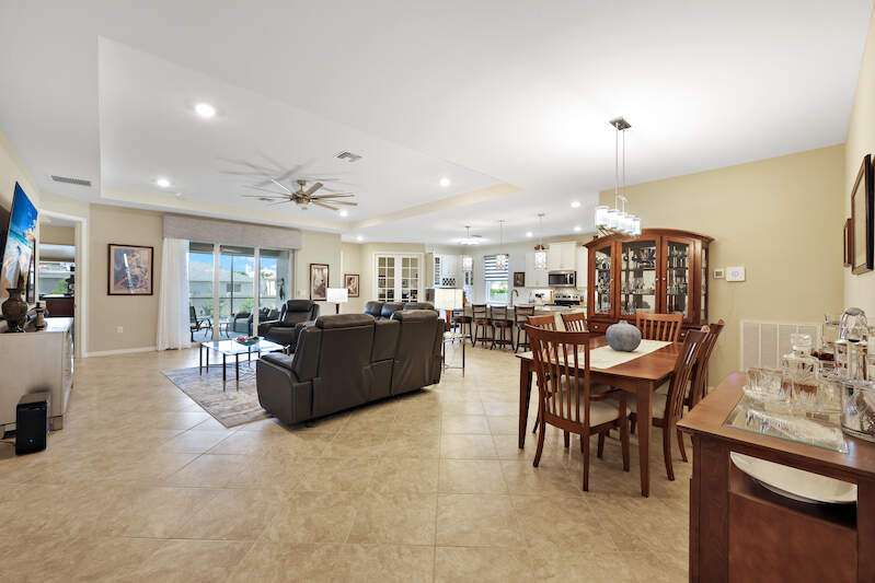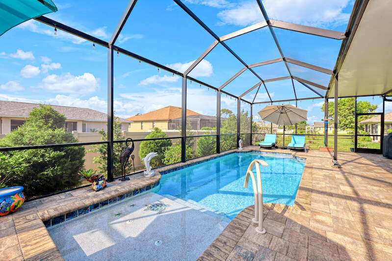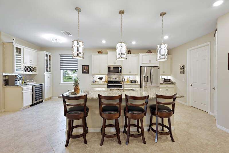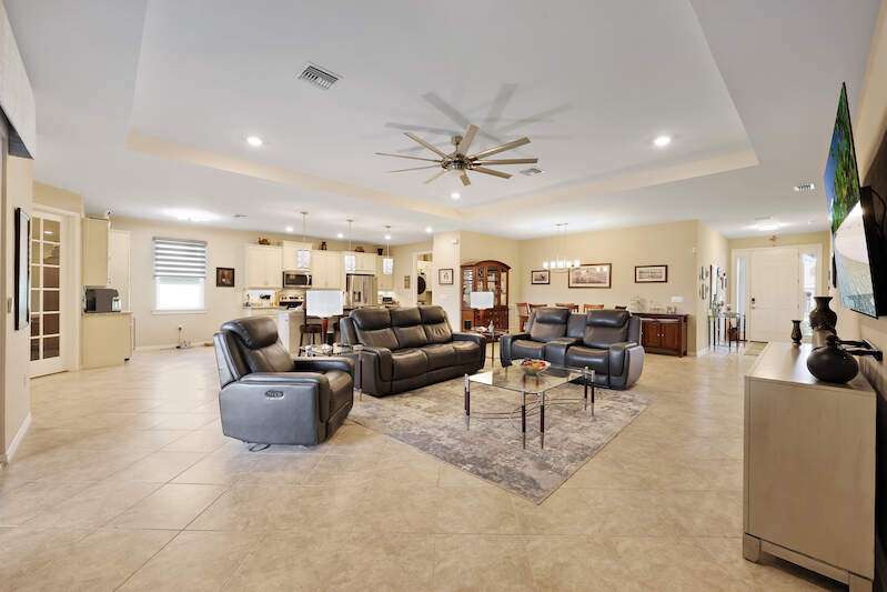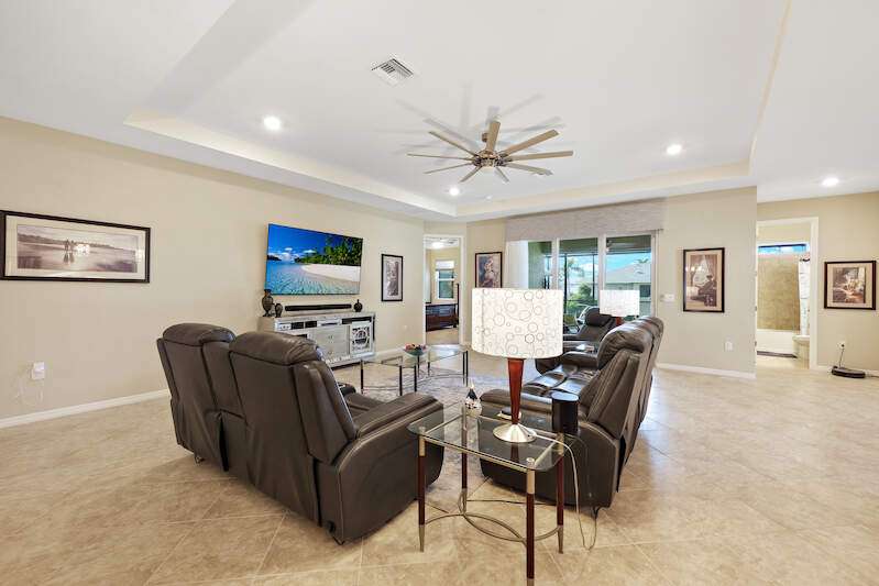 Don't miss out on this 2020 custom built home in the heart of Cape Coral! This ranch home entails 3 bed + den, 3 full baths, 2,300+sqft and a custom pool! Enter your home through its foyer into a HUGE open concept area that includes the kitchen overlooking the living room area. Stainless steel appliances, 42" cabinets, pull out drawers, walk in pantry, and wine fridge are just a few on the many features you'll find in your future kitchen! Stress free living comes with this home knowing all windows and doors are IMPACT rated, including electric storm smart hurricane screens for back patio! Entertain your guests with your future SOUTH facing saltwater pool thats heated and includes a tiki bar! 2023 Roof and Pool cage NEW in 2023. Plenty of storage space included with your 3 car epoxy floor garage and two overhead storage racks 4ft x 8ft. Your laundry is situated off the kitchen in your spacious mud room with your AC air handler located inside home to help prolong life of the unit and limit humidity. Other features include extra shelving in bedroom closets, 8ft interior doors, tile in the main areas and carpet in bedrooms, partially fenced backyard, and automatic sprinklers. Located near SWFL beaches including Fort Myers Beach, Sanibel Beach, tons of shopping and Cape Coral's finest restaurants, and plenty of marina's nearby to store your boat! Book your showing today!