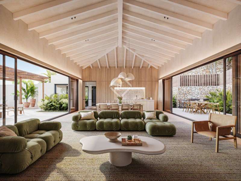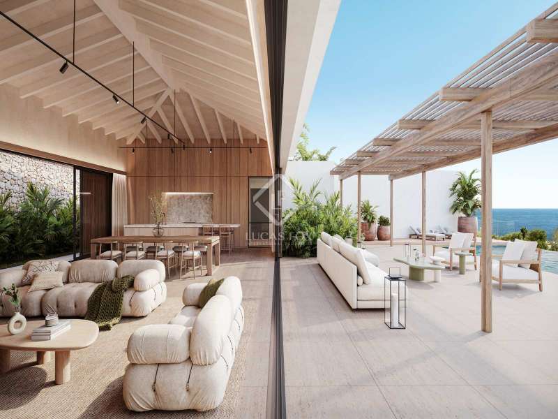This impressive brilliant white villa towers above the coastline of Ibiza, exceeding all expectations thanks to its exceptional location, the breathtaking view across Talamanca Bay, the refined architecture and the top-quality finish. Acquiring this villa is a golden opportunity, given that the there are few luxury homes of this calibre available on the island. This unique villa in Cap Martinet is a three-storey house with fantastic views of the Mediterranean and Formentera which sits on a 1,104 m² south-facing sloping plot in the area of Cap Martinet, Ibiza. The villa offers a clear panoramic view of Formentera and Cap Martinet, the cape that gives the name to the area. The different levels unfold and end up with the main living spaces on the top level, which overlooks the sea and has an infinity edge swimming pool as the backdrop for the views of the sea. The house is accessed through the lower part of the plot from Carrer de Cap Martinet, a quiet street in one of the most desirable areas of Ibiza. A large basement houses a covered garage, a storage area and all the necessary machine rooms in the house. The main space of the project, the true heart of the house, accommodates the kitchen, dining and living room. The main bedroom sits slightly off the main living areas and its volume hugs the pool area whilst enjoying the views from the vantage point top position of the plot. The pool blends with the deep blue of the sea and enhances the horizontal panoramic view. The bedroom level offers open views and private bathrooms and terraces. Outdoor life is enhanced through generous terraces, with the leading role being the one on the upper level, between the kitchen/bedroom/living-dining room and the pool, with the presence of a well-shaded area. A carefully selected palette of materials and finishes defines this development, with the search for a timeless and elegant character throughout the house. Natural stone from Ibiza covers the exterior walls and provides a stone plinth for the house while blurring the scale of the three levels. Please contact us for further information regarding this new luxury villa in Ibiza.