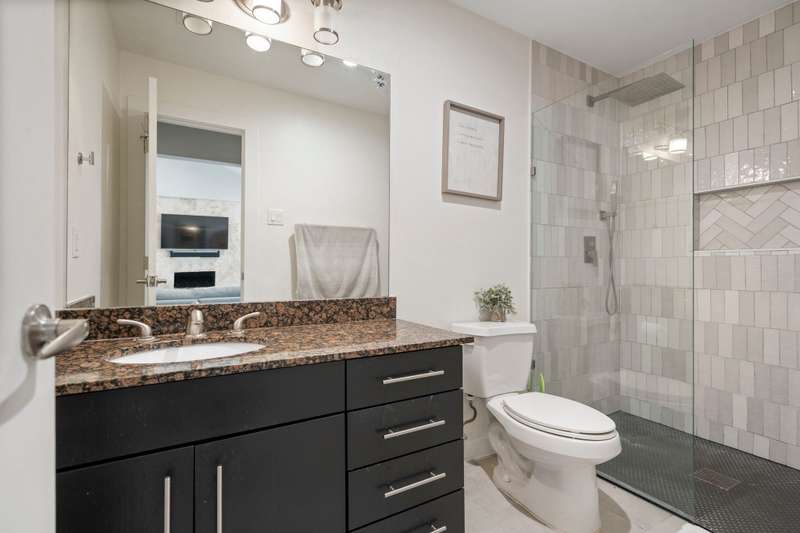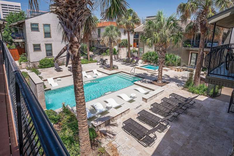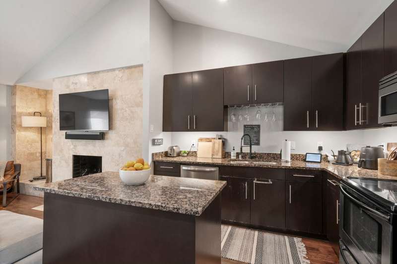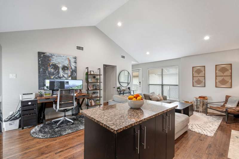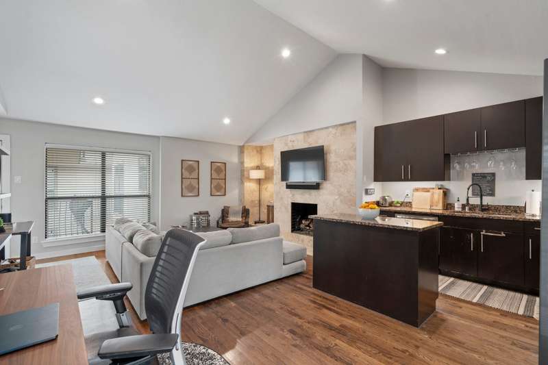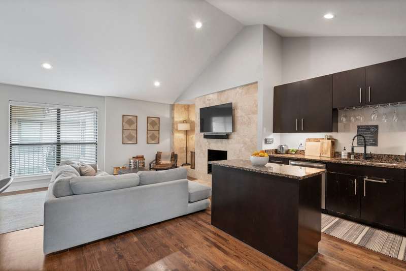 Spacious and airy one bedroom, with fantastic updates and tall vaulted ceiling. Solid hardwood floors, wood burning fireplace with travertine stone surround, and covered balcony. Large bedroom with huge walk in closet. Open kitchen with granite counters, island, and stainless steel appliances. Beautiful grounds with resort style pool, outdoor firepit, and grilling areas. 2 assigned carport spaces in gated parking area.