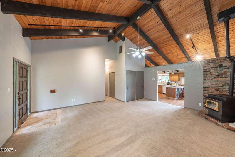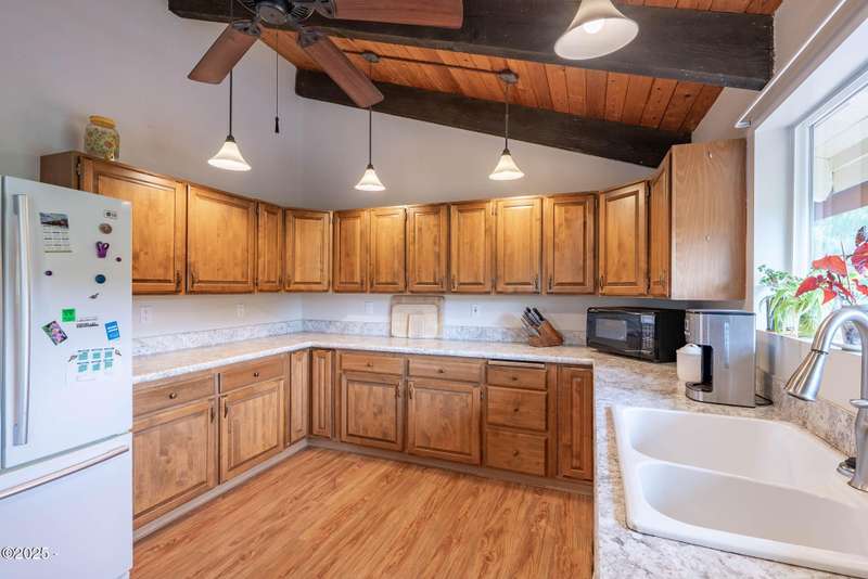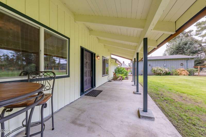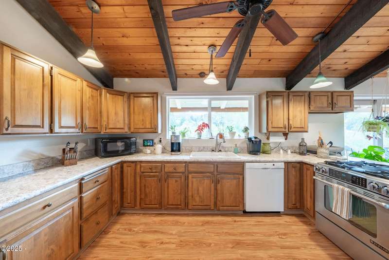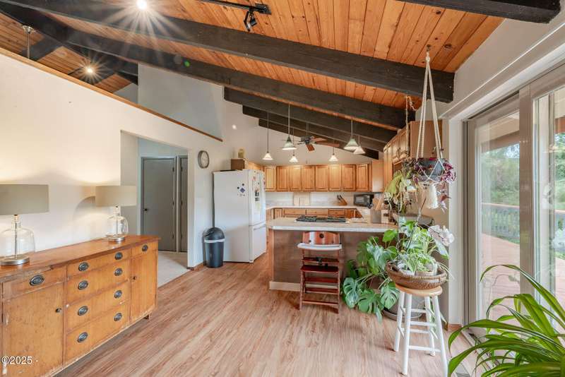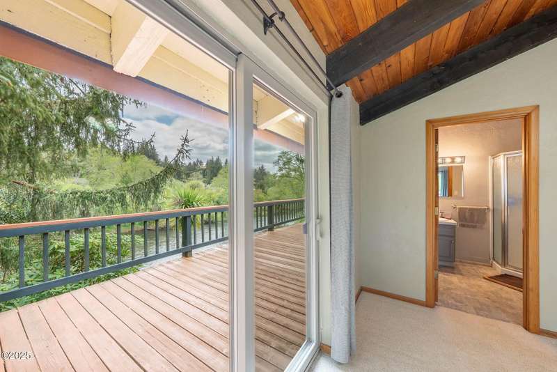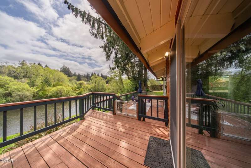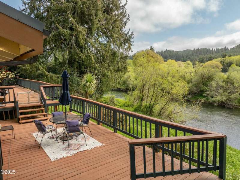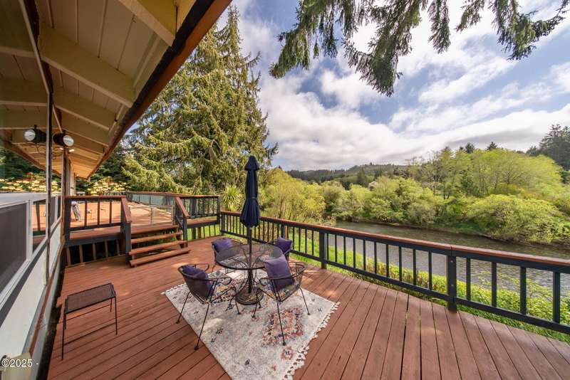 Scenic River Front 1.5 Acre with Spacious Single Level home. 4 bedroom, 2 bath, living room, separate dinning room and cathedral wooden beamed ceilings. Kitchen functionality at its best. Beautiful views of the river from the sprawling deck. Workshop with water, electricity and plenty of storage for the hobby enthusiasts. X-Large RV/Boat garage with electric, lighting and plenty of space for other large projects. Fenced yard, with apple trees, plum tree, mature blueberry bushes, raised garden beds and a green house with electricity and hot/cold running water perfect for the Gardner who enjoys a dedicated space. Property is not in a flood zone. River access for your own fishing hole. 15 minutes to the Pacific Coast. Tranquil living at its best!