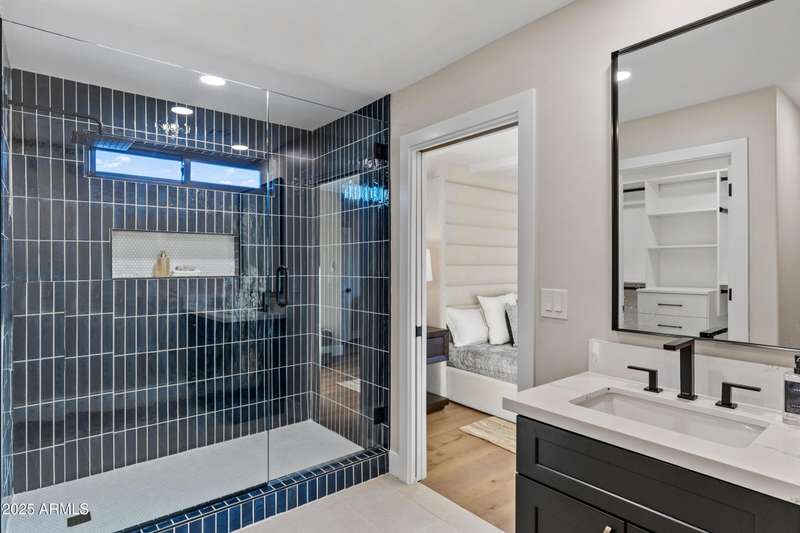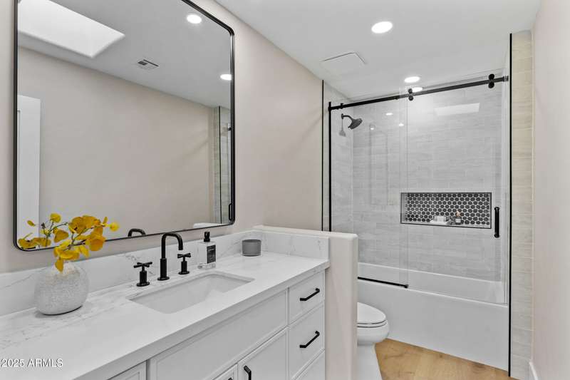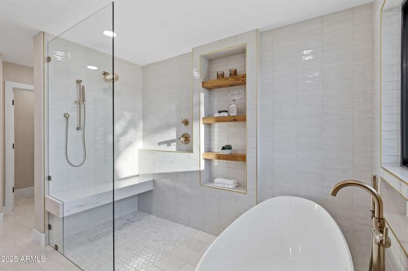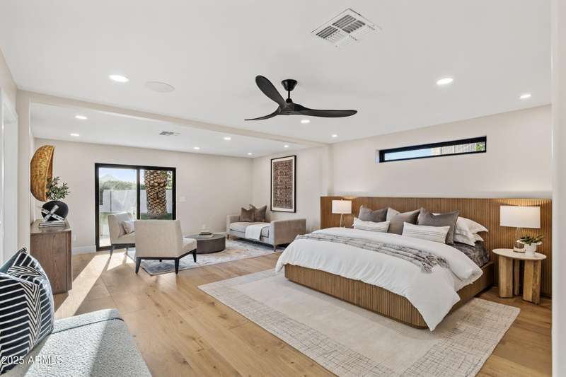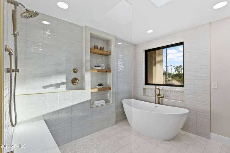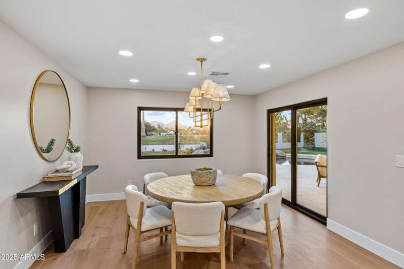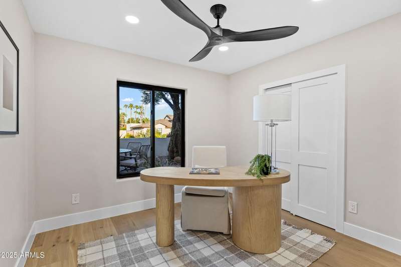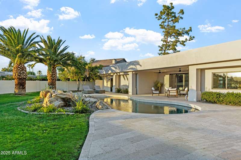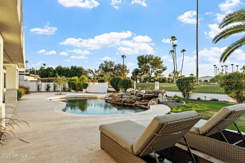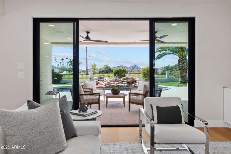 With an uncompromising blend of timeless luxury and modern design, welcome to this extraordinary single level estate on a premier golf course lot in McCormick Ranch. Showcasing iconic Camelback Mountain views, this 4 bedroom, 3 bath residence redefines refined living. Inside, European white oak floors, Anderson doors and windows, and a dramatic 72'' open flame gas fireplace set the tone for elegance. The chef's kitchen is nothing short of spectacular, anchored by a 15 foot island, custom stained designer cabinetry, Honed Taj Mahal countertops, and a full suite of Thermador appliances including a 48'' professional double oven. Designed for both grand entertaining and intimate gatherings, the space embodies seamless luxury and functionality. The formal dining room, crowned with a designer chandelier, frames panoramic views of Camelback Mountain and the lush golf course, offering a dining experience unlike any other. The resort inspired primary suite is a private sanctuary, complete with its own sitting room retreat. The spa-like bath boasts custom white oak vanities, a makeup station, a curbless walk in shower, and a freestanding soaking tub perfectly positioned to capture mountain vistas. A boutique style custom closet and in suite laundry area elevate convenience to couture living. An additional guest primary suite offers privacy and sophistication with a walk in closet, custom vanity, and walk in shower, ensuring visitors enjoy the same level of indulgence. Outdoors, the resort experience continues with Marbella Shellstone pavers, a Pebble Tec pool with cascading rock waterfall, and an enviable backdrop of Camelback Mountain rising over the manicured fairways. This is more than a residence, it is a statement of architectural artistry, modern elegance, and breathtaking natural beauty. Welcome home to Via Linda.
