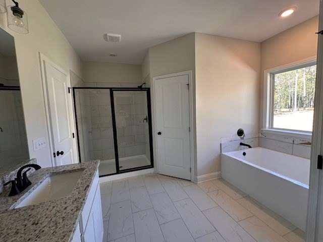 Experience easy living in the Carter floor plan, a beautiful one-level home featuring 4 bedrooms and an impressive 3 FULL bathrooms. Step onto the inviting front porch and enter into a foyer that provides access to a separate dining room or versatile flex room. The expansive family room, complete with an electric fireplace, seamlessly connects to the rear covered porch, perfect for outdoor relaxation. The open-concept kitchen is a chef's delight, showcasing an island, breakfast area, stylish cabinetry, granite countertops, and modern appliances. Unwind in the large primary bedroom, which includes a luxurious ensuite with double vanities, a separate tub and shower, and two walk-in closets. 1 This thoughtfully designed home also offers a laundry room, three additional bedrooms (one with its own private bathroom!), and a convenient hall bathroom with double vanities. A double car garage provides ample parking. Enjoy the durability of LVP flooring in the main living areas and laundry room, the comfort of carpet in all bedrooms, and the elegance of tile in all full bathrooms. Builder offering $4000 in incentives