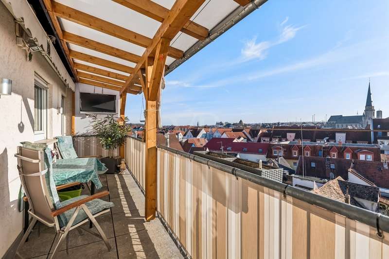 This apartment combines charming living above the rooftops of the city with modern furnishings and convenient extras and is expected to be ready for occupancy by arrangement in March / April 2026. It impresses with its approx. 83 m² of living space, a wonderful view over the city center and offers a comfortable home in a well-kept apartment building from 1992 with a total of 14 residential units. The apartment comprises three well-proportioned rooms and impresses with its modern furnishings: the bathroom, guest WC and kitchen have been extensively modernized and feature a contemporary design. A small storage room within the apartment provides additional storage space. The south-facing balcony invites you to spend relaxing hours and offers plenty of light and sunshine. Despite its location on the top floor or 3rd floor, the apartment is easily accessible via the bright and wide staircase. In addition to the fitted kitchen, the apartment also has a practical cellar storage room and a garage parking space. Residents also have access to a communal laundry and drying room. The monthly house rent is €300. The apartment building has always been well maintained and was converted to modern central heating with a heat pump in 2024 - a valuable contribution to energy efficiency and future security. Demand certificate - final energy requirement: 38.52 kWh/m²a - energy efficiency class: A - main energy source: electricity - year of construction according to energy certificate: 1992