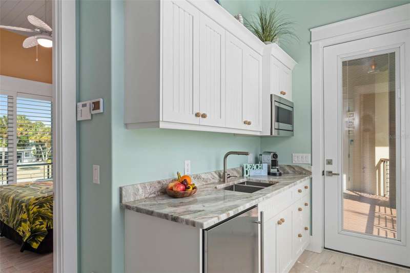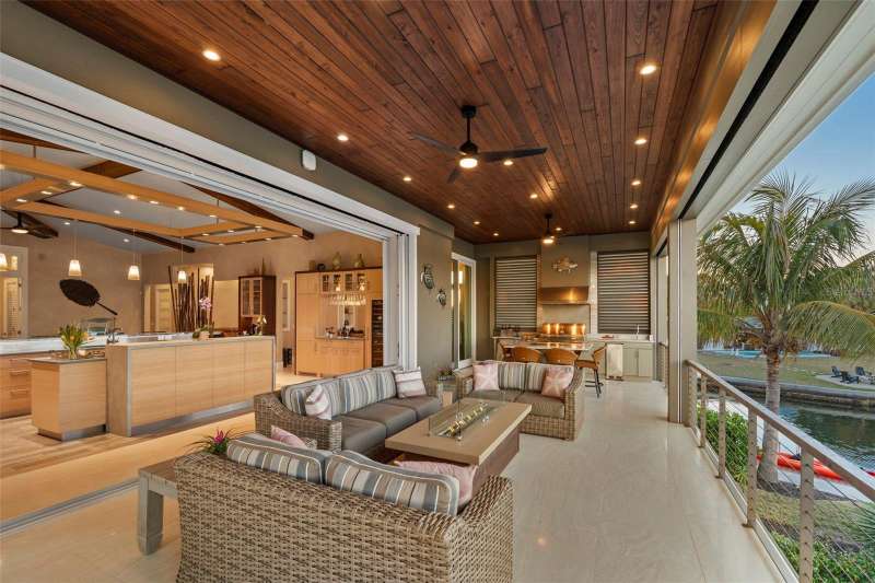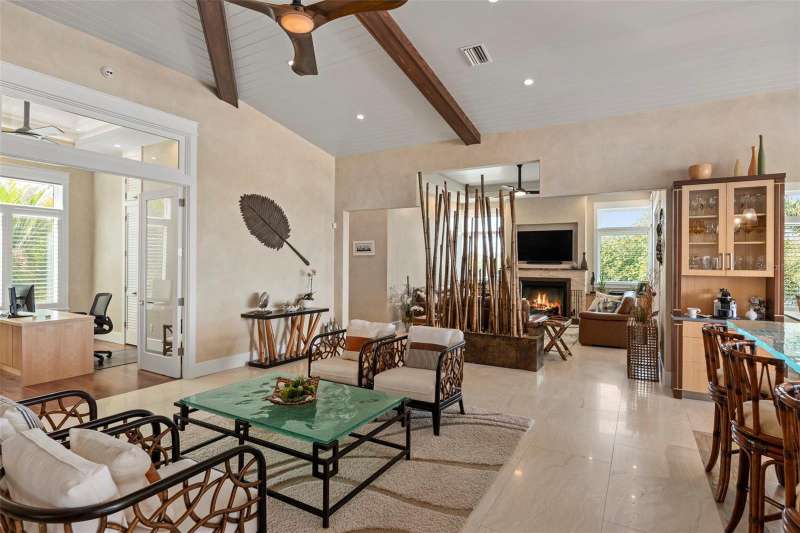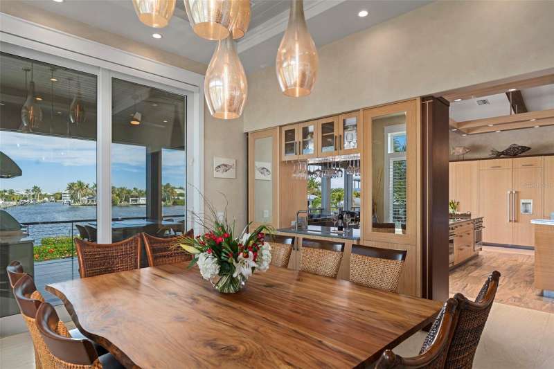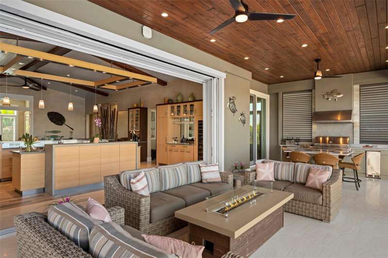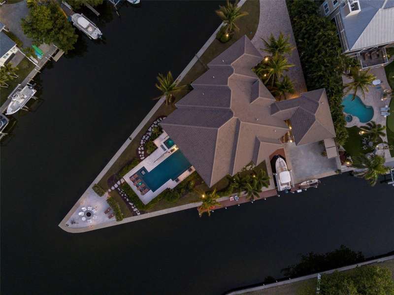 A rare opportunity now exists to own what has been described by many as one of the most beautiful homes on Anna Maria Island. This remarkable family estate has it all: location, architectural beauty and quality, elevated construction. In a sea of homes renovated or built for rental income, this property stands out as a true family residence, constructed to withstand the storms, yet take advantage of the beautiful Florida weather. Newly built in 2020, the spectacular home is set on a stunning triangular, gated property with over 500 feet of water frontage. It is located on the only street on the island that directly accesses both the famous beaches of Anna Maria and the pristine boating waters of Bimini Bay. With Anna Maria’s ideal climate, this home brings a seamless flow between indoor and outdoor living. The 3850 feet luxury air conditioned, elevated home combines with a further 4000 feet of covered and finished living space, to create an expansive family residence that is ideal for entertaining guests. Stepping out of the elevator into the huge vaulted great room, you are met with spectacular views over Bimini Bay. The stunning chef’s kitchen, with imported cabinetry and illuminated glass countertops, adjoins the family dining room with seating for ten and a living room with a fireplace for the occasional cool winter night. Throughout the home, imported cabinetry and Tahitian-inspired finishes reflect craftsmanship and thoughtful design. When not needed, a 20ft set of hurricane safe glass doors disappear into the outdoor walls, allowing a seamless flow from the kitchen onto the massive covered lanai The 800 square foot lanai, with retractable screens, is home to a full outdoor kitchen, a Teppanyaki cooking table with seating for eight, a built in fire table, outdoor dining and seating areas, and it has direct access to the elevated spa. All of this with spectacular views of Bimini Bay, over the resort-style pool below, the tropical gardens, fire and water features, and a waterfront “beach” fire pit, where family and guests gather beneath the stars. In the main house, there are two luxurious primary bedrooms enhanced with full ensuites, while in the guest house, connected by a covered bridge, there are two additional bedrooms, a full bathroom and a kitchenette providing a private retreat for your guests or the grandkids! A 20-foot dock is ideal for launching the Kayaks or SUP, while serious boating enthusiasts will appreciate 500 feet of new concrete reinforced seawall, a 60-foot boat dock, and a 12,000 lb. boatlift, with direct access to Tampa Bay and the Gulf of Mexico. This estate truly represents one of the island’s most distinguished offerings. Private viewings are available exclusively by appointment. Meanwhile, you are welcome to enjoy a narrated video preview at the property’s private website, amidreamhome.com.