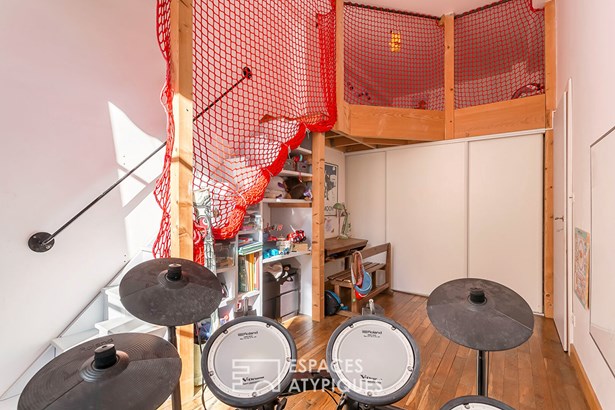 Two bedrooms are located on the main level, each benefiting from a mezzanine optimizing the space to accommodate sleeping accommodations. A third room, which can be used as a guest bedroom or office, completes the ensemble. A shower room with toilet and a storeroom enhance the space's functionality.