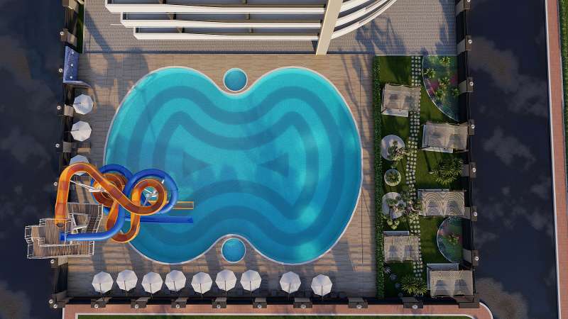 The apartments are in a single-block complex consisting of 14 floors. The project includes a communal pool, landscaped garden, outdoor parking area, barbecue area, volleyball, and basketball court, walking path, children's playground, aquapark, fitness, 24/7 security, and a generator.