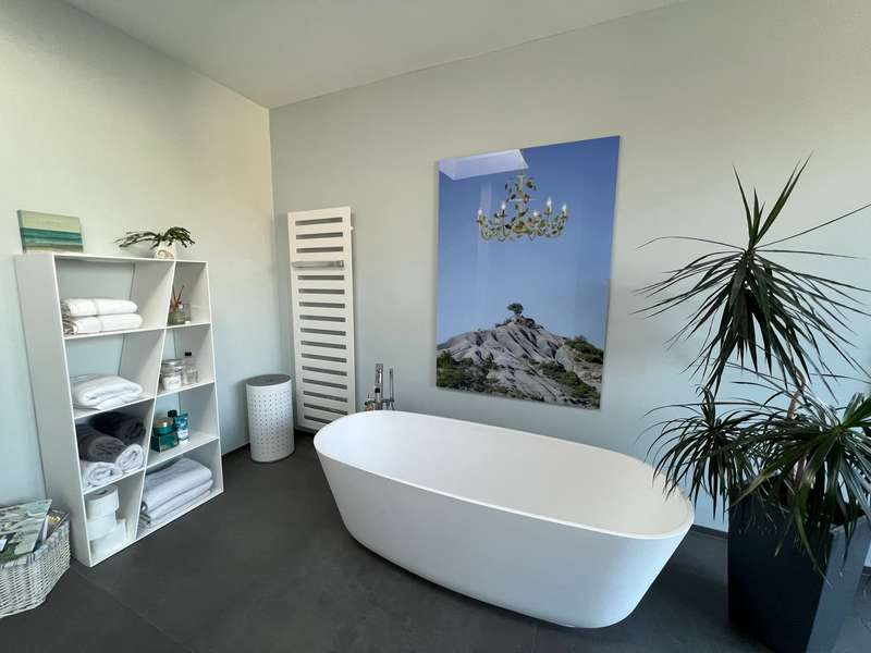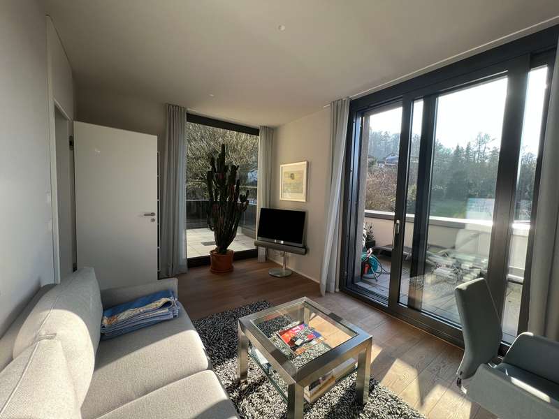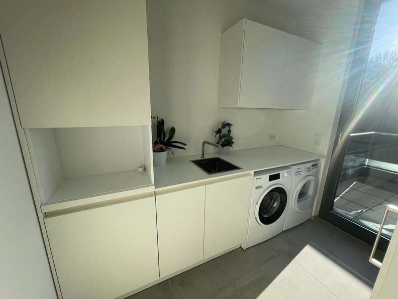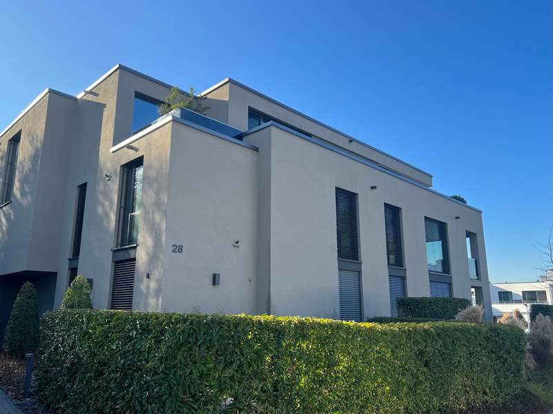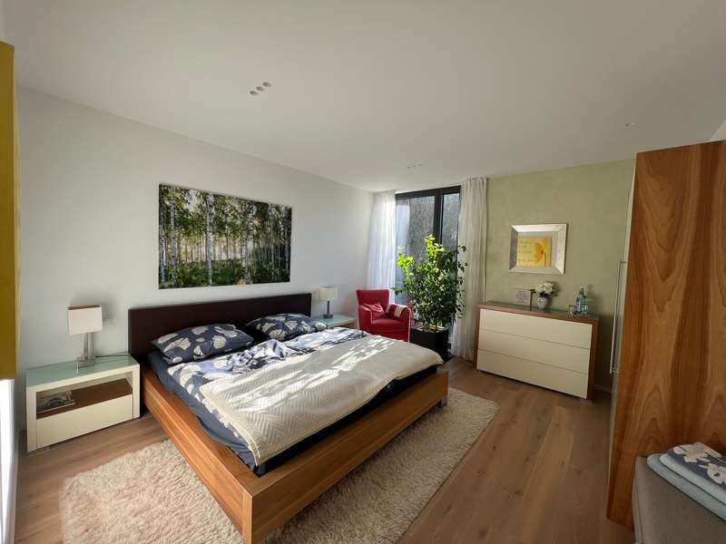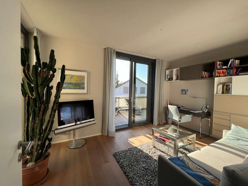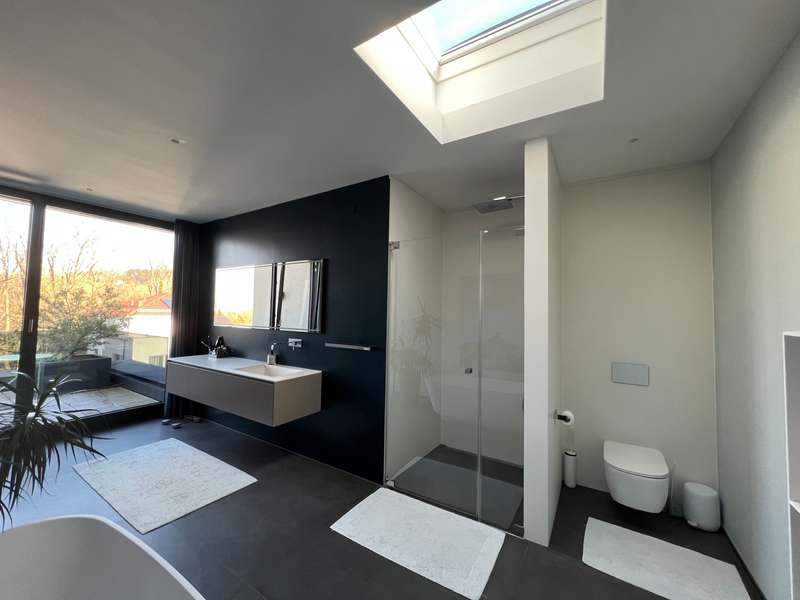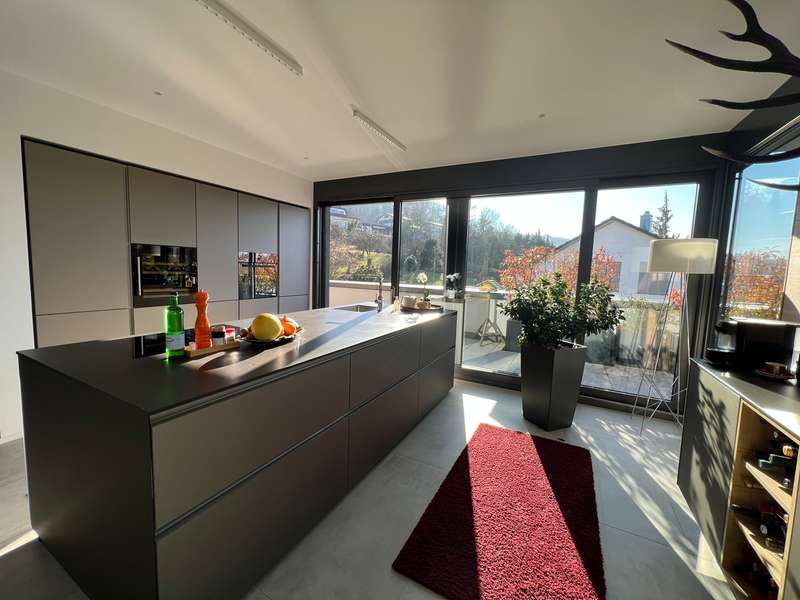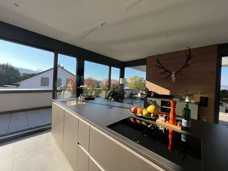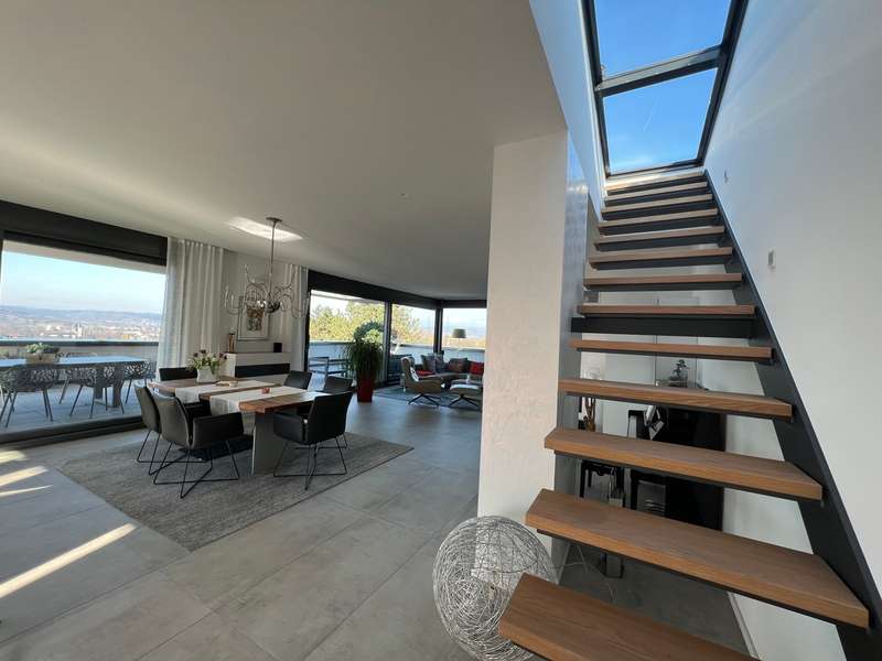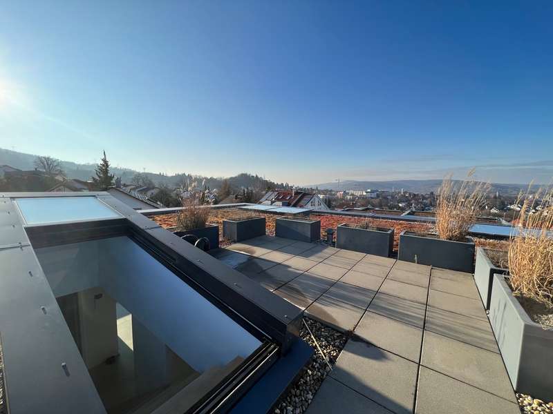 This exclusive penthouse apartment with a living space of 284.53 m² extends over two floors and is located in an apartment building with a total of five residential units. The building, which was completed in 2019, is in absolutely mint condition and meets the highest standards of modern living. The elevator takes you directly to the penthouse apartment, where you are greeted by a spacious, open-plan kitchen, living and dining area. This centerpiece of the apartment combines stylish luxury with maximum comfort. The wrap-around roof terrace is directly accessible via the window front and extends the living space into the open air. A high-quality glazed staircase leads from the living room to the roof. If desired, an already approved, covered and weather-protected terrace area with an area of 25 m² can be created here. From there, you can enjoy a unique 360-degree panoramic view over Schorndorf. In addition to the unique living area, the top floor also comprises the master bedroom with an en-suite bathroom, including a free-standing bathtub, a walk-in shower and a separate WC for more privacy. High-quality, custom-made built-in wardrobes in the bedroom and hallway provide stylish, additional storage space. There is also another bedroom and a utility room on this floor. Floor-to-ceiling windows in each of the rooms provide access to the terrace. The upper floor, which can be accessed both via the private staircase and a separate entrance to the apartment, offers a wide range of possible uses. In addition to another spacious bedroom and a stylish guest WC, a private wellness area with walk-in shower and sauna invites you to relax - a retreat for residents and guests alike. The highly exclusive furnishings throughout the apartment meet the most modern requirements and leave nothing to be desired. Heating is provided by an efficient underfloor heating system with individual room control in all rooms, which ensures a pleasant living climate. Floor-to-ceiling aluminum windows with triple insulating glazing ensure optimum thermal insulation and allow plenty of daylight into the rooms. An electric Venetian blind system offers additional comfort. The modern hybrid heating system with gas and heat pump ensures energy-efficient heating for the entire building. Thanks to the combination of first-class construction, well thought-out interior design and extensive fixtures and fittings, this penthouse apartment offers an exclusive living environment in a house-within-a-house concept. This property offers prospective buyers a unique opportunity to acquire a unique apartment in high-quality construction. Please do not hesitate to contact us for further information or to arrange a viewing appointment.