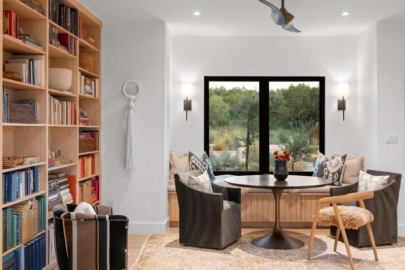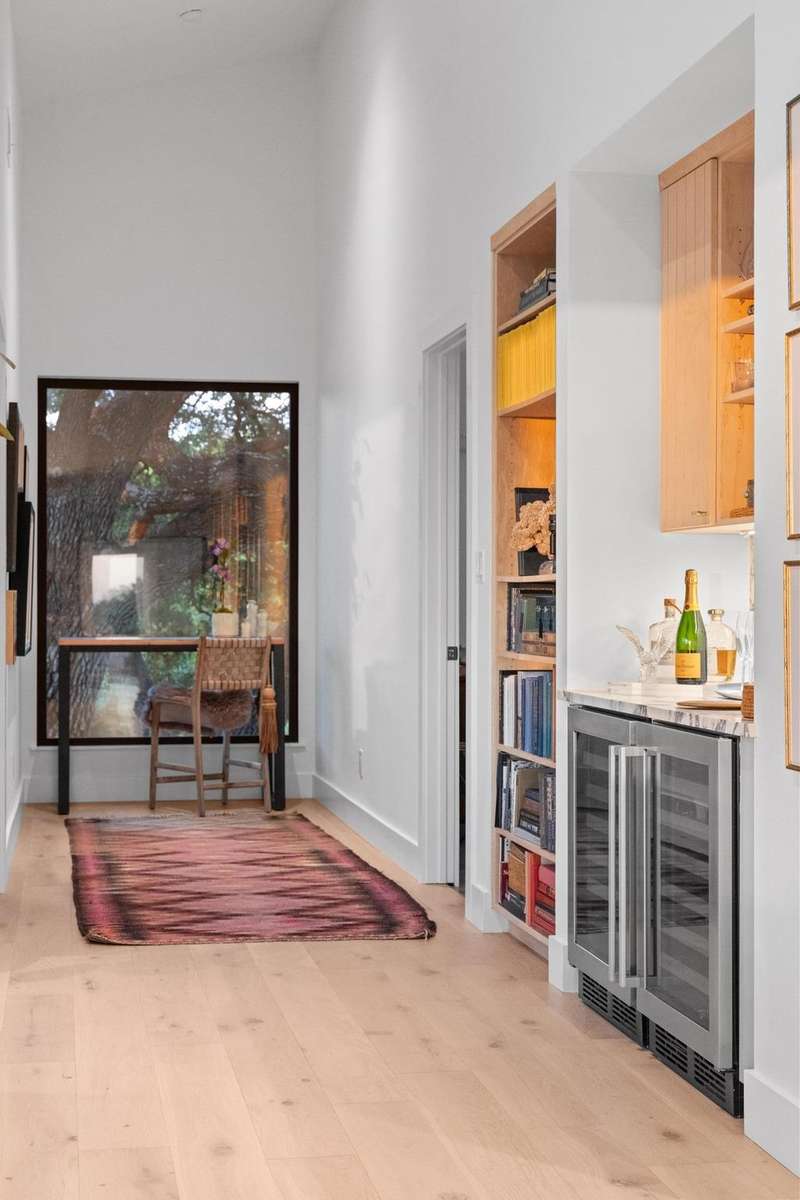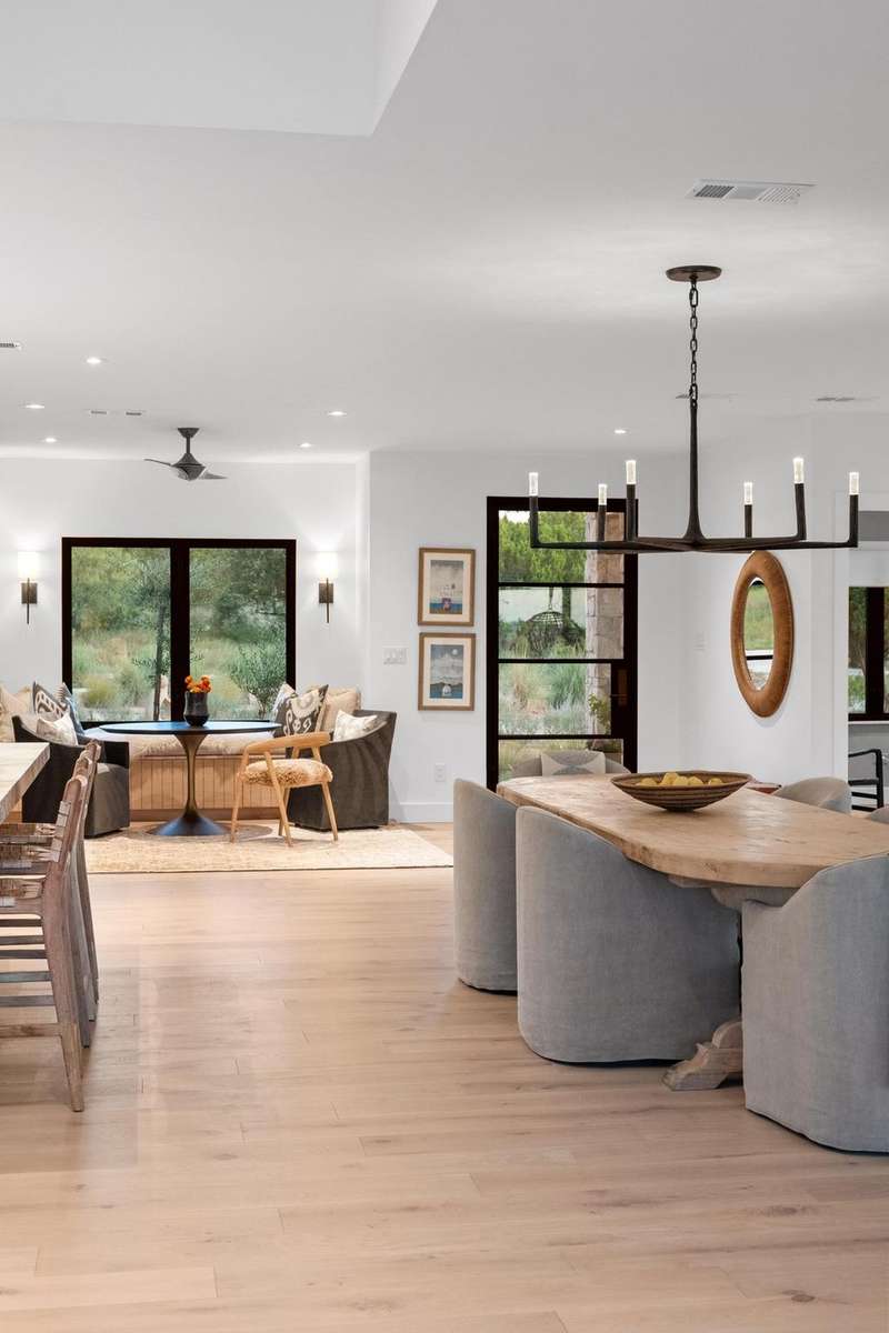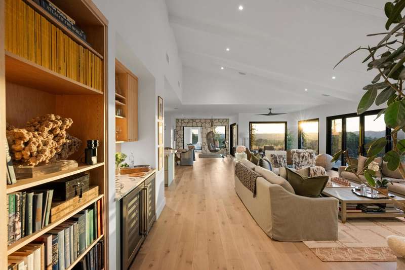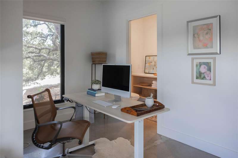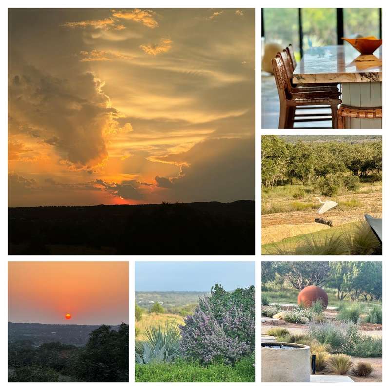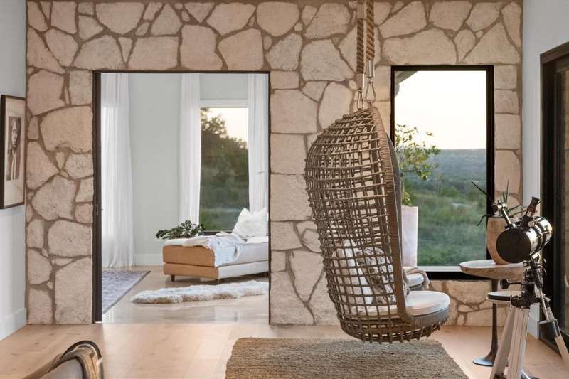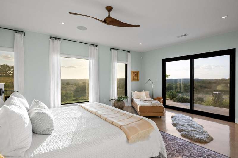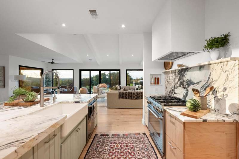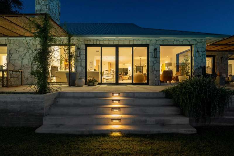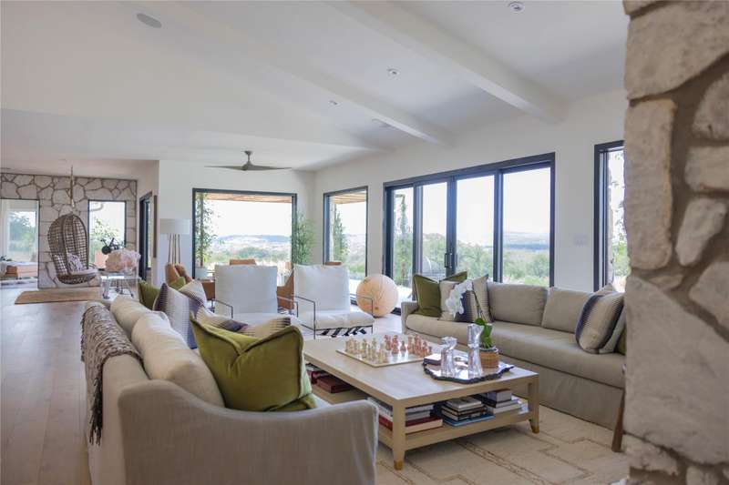 Nestled among century-old oak groves and stunning vistas, this exclusive sanctuary offers beauty and complete privacy. The home has been reimagined and rebuilt to enhance indoor-outdoor living, combining native stone, warm woods, and organic finishes for a timeless yet modern feel. This single-story ranch-style layout includes five bedrooms and five-and-a-half baths, providing multiple living areas for gatherings while maintaining intimacy. The bright oversized primary suite features panoramic Hill Country views and a spa-like bathroom with dual vanities, a soaking tub, and a walk-in shower. Open sightlines create a seamless flow between the living, dining, and kitchen areas, highlighted by quality wood plank floors and steel windows. The chef's kitchen anchors the space with dramatic viola marble surfaces, custom maple cabinetry, and a butler's pantry. Thoughtful details include built-in bookcases, a bar niche, and sliding glass doors that invite breezes and light. The outdoor living space features a gated circular drive and a 45-foot self-cleaning pool with an integrated spa, surrounded by lush grass and limestone edges. A fully equipped outdoor kitchen enhances alfresco dining, while a detached guest casita with a sauna offers a perfect retreat. Land regeneration is a key feature, with sculptured oak groves, sustainable native plantings, and trails for walking or horseback riding. The expansive area also accommodates livestock or future cultivation, and plans for a three-hole golf course seamlessly integrate with the landscape. A three-car garage with extensive cabinetry adds practicality, while a private well and rainwater collection system provide sustainability. Conveniently located just 30 minutes from Austin, this estate serves as a serene retreat designed for comfort and modern living.