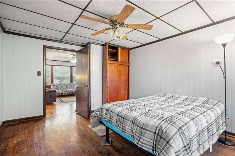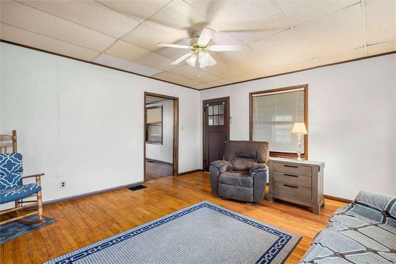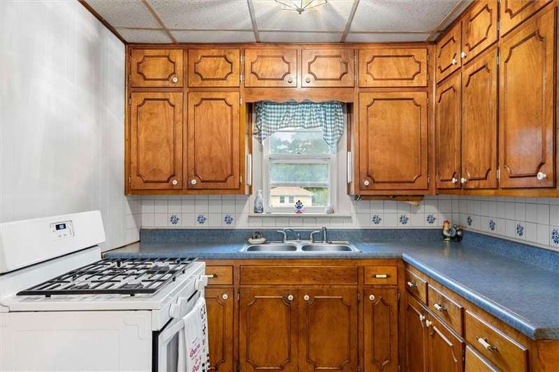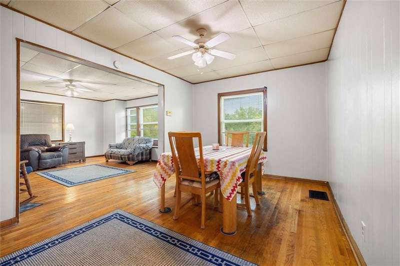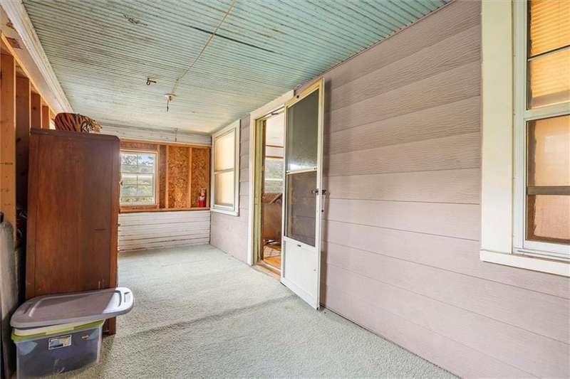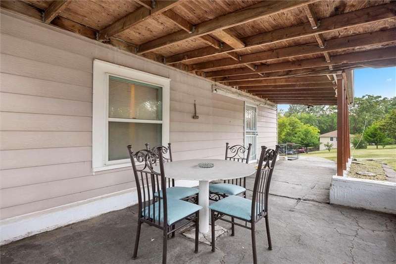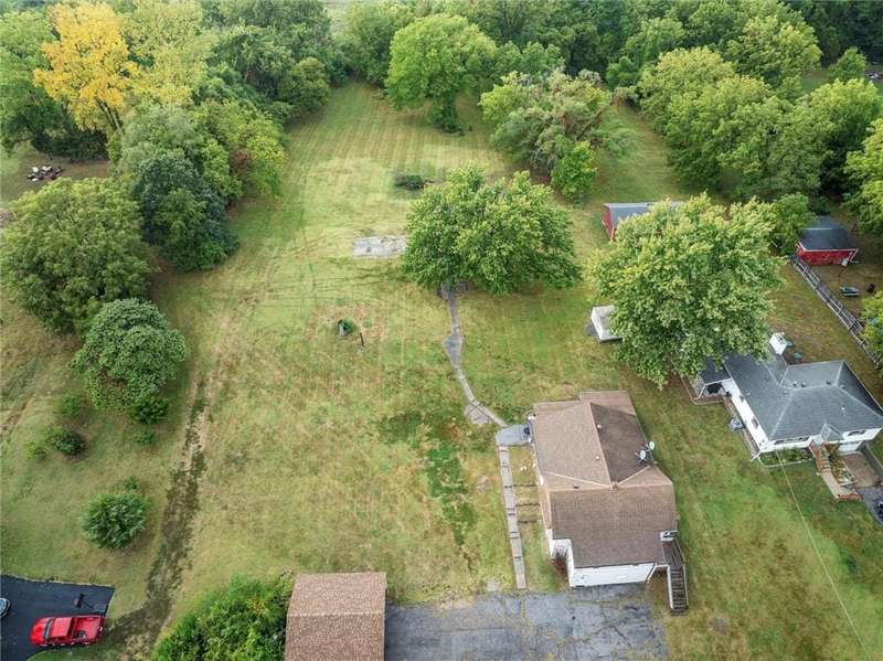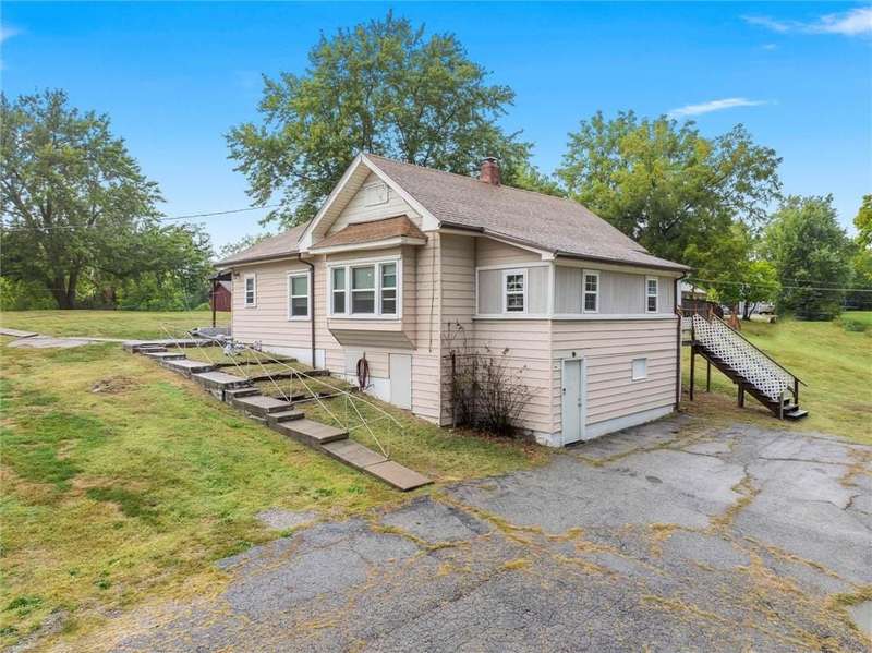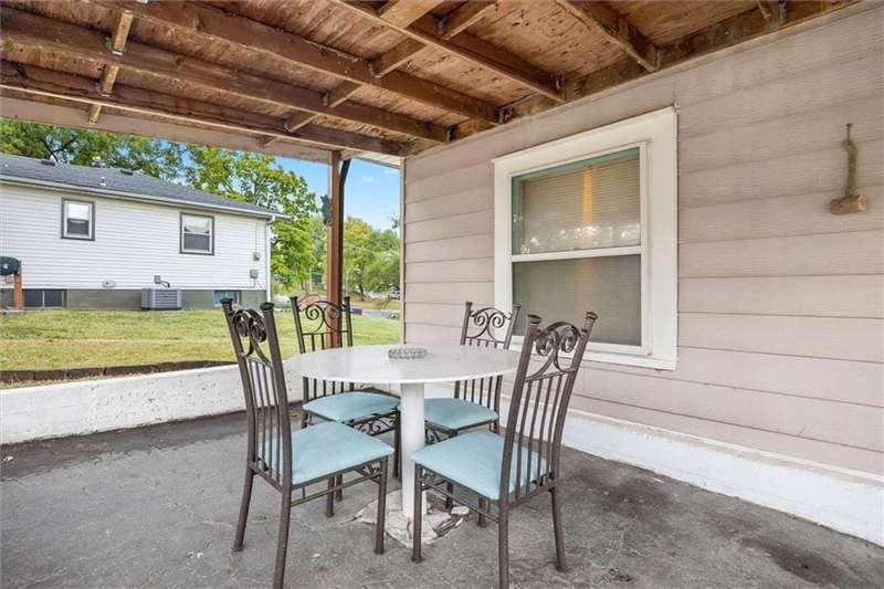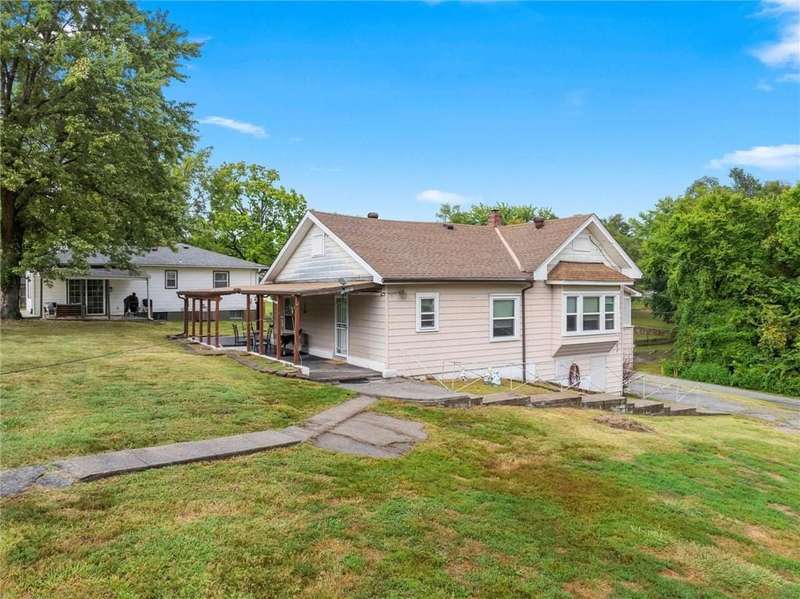 Nestled on nearly 2 acres this Grinter Heights home offers tranquility on roads less traveled yet close to everything KC. Main floor living provides a kitchen with well cared for stained cabinetry along with a freestanding gas range and a great view to the property. A large dining area and living room has beautiful wood floors and a lot of daylight through newer windows. Two nice size bedrooms along with a large bathroom with a newly resurfaced shower has lots of storage with built in cabinets. Enjoy the sunroom conveniently located right off the living room that also allows entry and exit from this space. The unfinished walkout basement includes an abundance amount of storage along with a nice shop. The exterior offers a two car carport, two sheds along with a nice size covered patio off the back of the home and right off the kitchen making grilling and entertaining a breeze. The land is nearly 2 acres and has partial fencing and backs up to greenspace. Roof is four years old along with newer HVAC and concrete drive. This property has been home to Halloween parties, hay rides and let's not forget the sleigh rides in the winter. This home located close to amenities yet a country feel on a quiet dead end road is a must see.