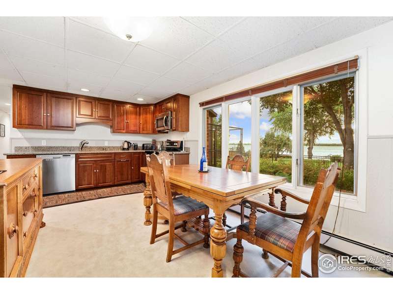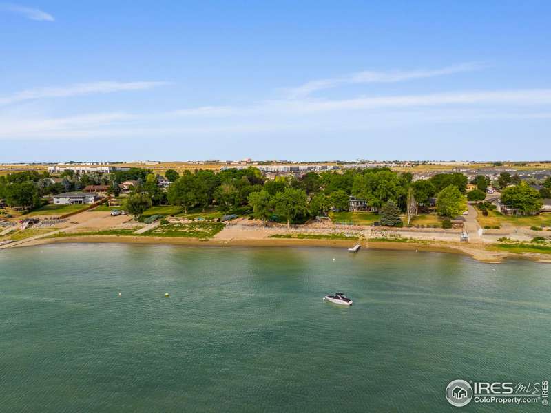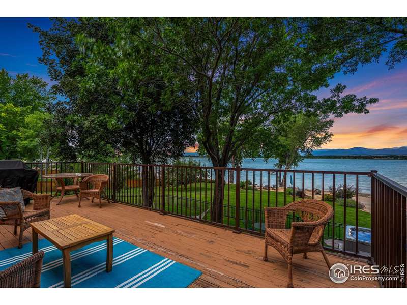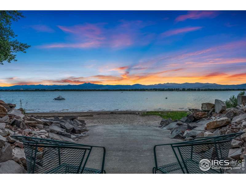 This unique lakefront property is only minutes from schools, excellent medical care, I-25, Loveland's best dining and shopping, - yet tucked away in a peaceful, no metro-district community, making this property truly one-of-a-kind. Boyd Lake is one of a few large, Colorado warm water lakes with direct, private water access, inviting everything from peaceful morning paddle boarding to adventurous water sports - both motorized and non-motorized. Mature shade trees tower over a natural sandstone patio and fire pit at the water's edge. The home's western orientation provides breathtaking daily sunset views over the water to the snowcapped Colorado mountains, which will be enjoyed from inside the home, and outside from the decks, hot tub, and patio. In the fall and winter, the lake is alive with eagles, owls and waterfowl, and fishing is abundant early in the spring and summer. This home is a rare sanctuary of beauty, recreation and tranquility. This comfortable and spacious ranch-style layout has everything you need on the main level, with a full finished, walkout lower level that could be used in a number of different ways - whether it's a home theater, game room, or multigenerational living space with a second kitchenette, dining and living area. Step outside to private lakeside living with a hot tub, coffee on the patio, mature trees, berry bushes and your own boat ramp making it super easy to get your lake toys on and off the lake. Note: The lot extends down to the water line so you always have access to the lake.