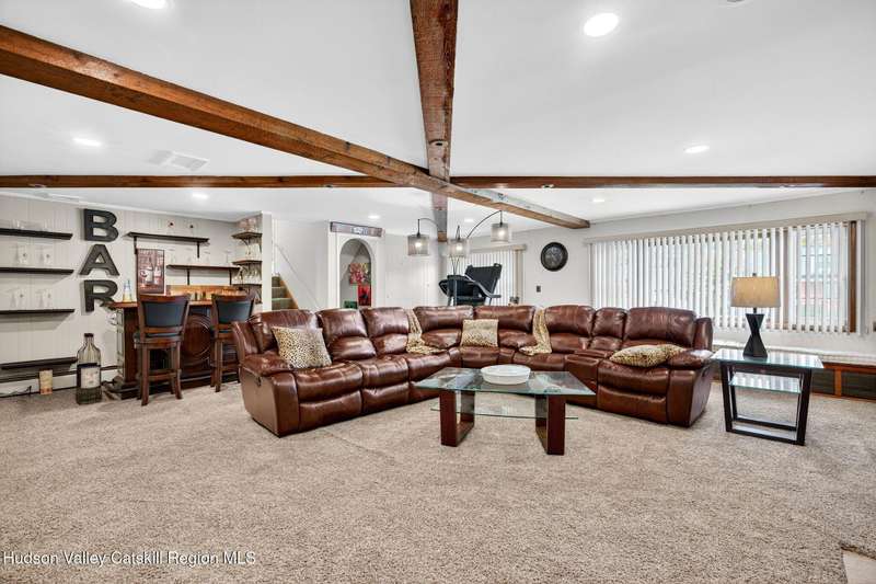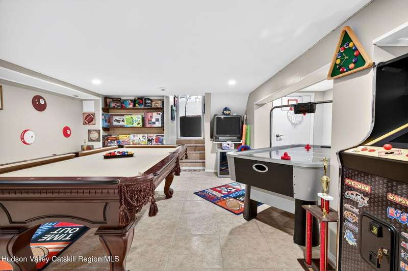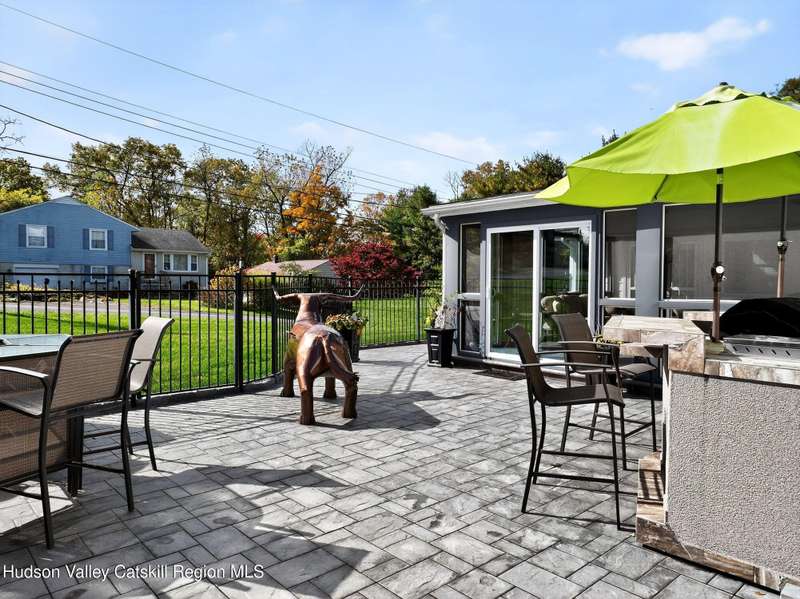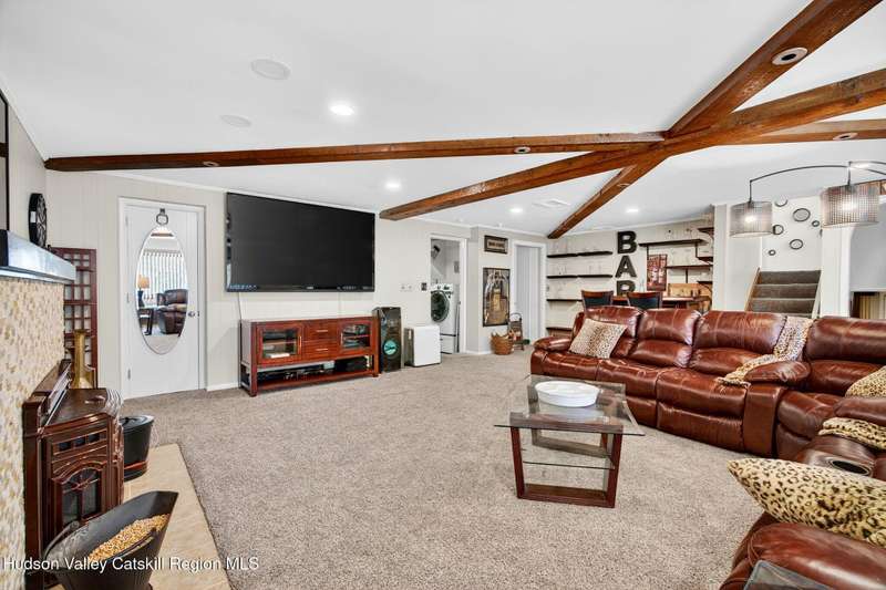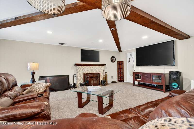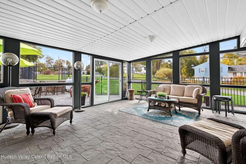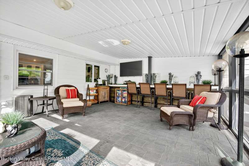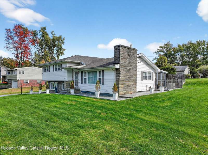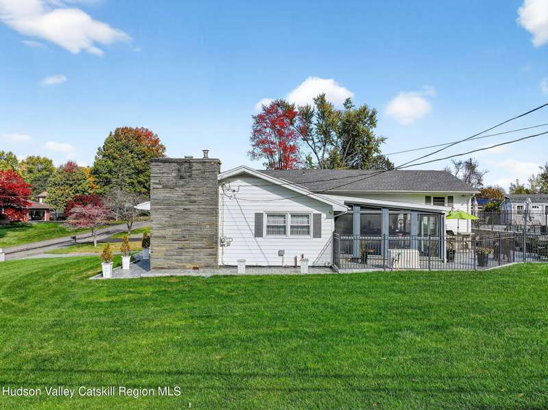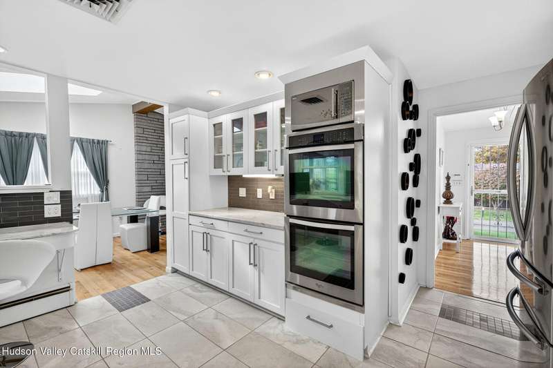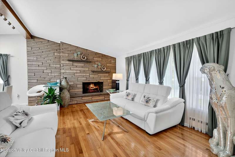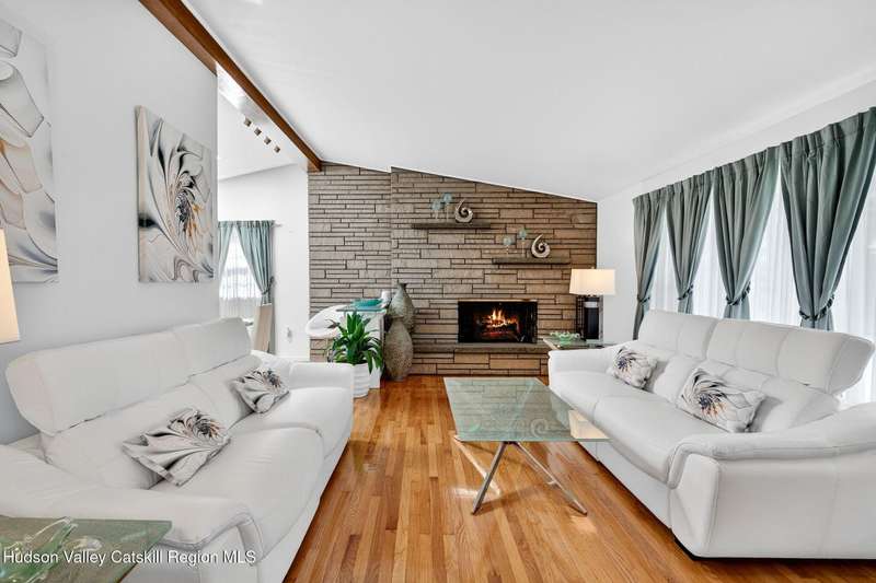 This stunning home offers the perfect blend of comfort, elegance, and functionality. A floor-to-ceiling stone fireplace creates a dramatic focal point in the spacious living area, filled with natural light from large windows and skylights. The impeccably maintained hardwood floors add warmth and character throughout. With four bedrooms plus an additional room currently used as an office, there's space for everyone. The expansive primary suite features two separate walk-in closets and a luxurious feel throughout. Kitchen is well appointed with multiple built in ovens as well as newer stainless appliances and quartz countertops. The lower level offers a laundry room, recreation room, and a large family-style room complete with a bar and built-in window benches-perfect for cozy evenings or entertaining year-round. A whole-house generator ensures peace of mind during power outages, and the immaculate garage with tiled floors adds to the home's impressive presentation. Outdoors, the home is designed for entertaining and relaxation. Paver-lined driveways and patios surround a sparkling heated in-ground pool-ideal for summer gatherings with multiple areas for guests to spread out and enjoy. The screened-in side porch opens directly to the pool area, providing a seamless indoor-outdoor flow. Grass will always be green with the sprinkler system that was installed. Located in the Elmendorf Heights subdivision which is close to Old Town of Hurley (lots of stone houses) as well as Uptown Kingston. This home offers both beauty and value.