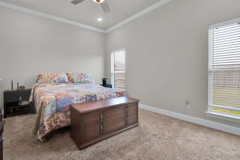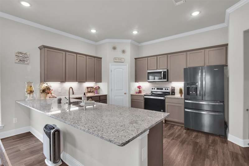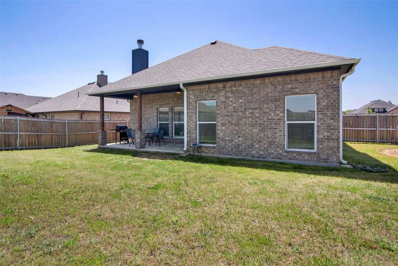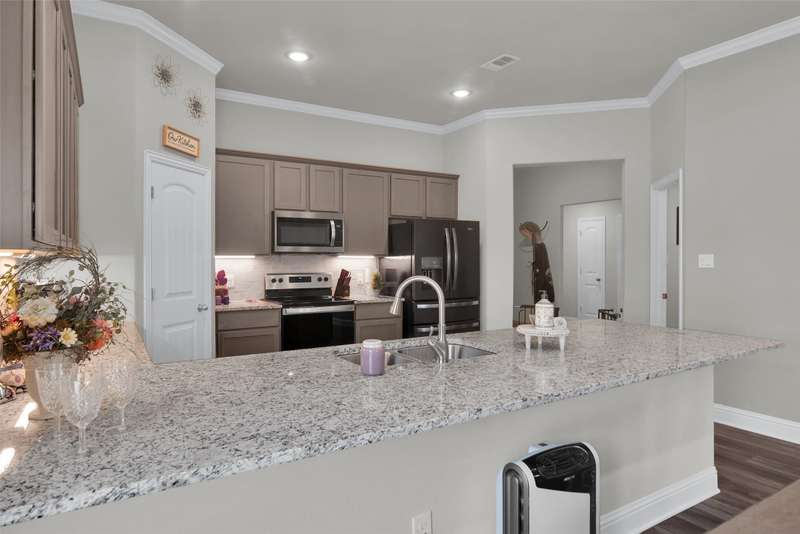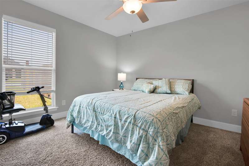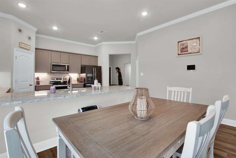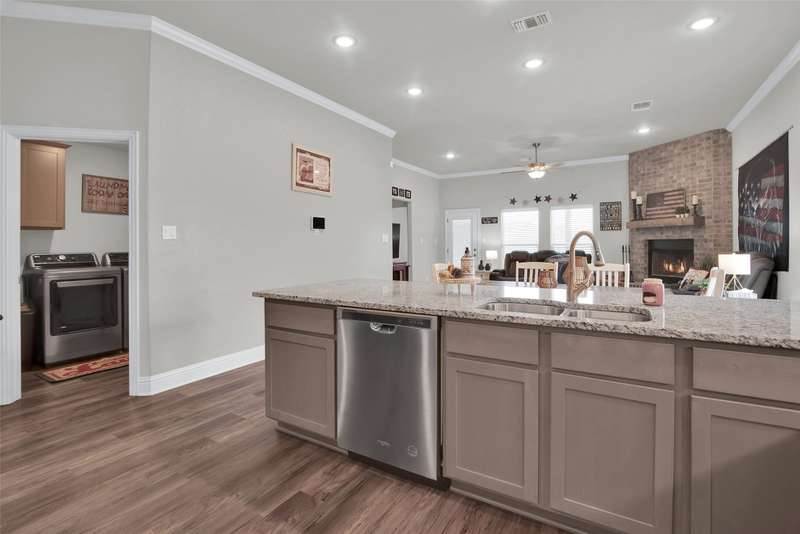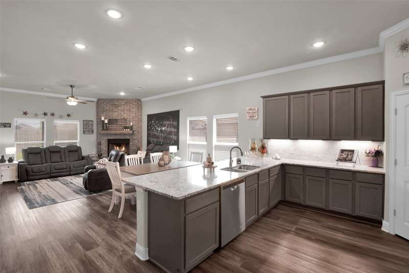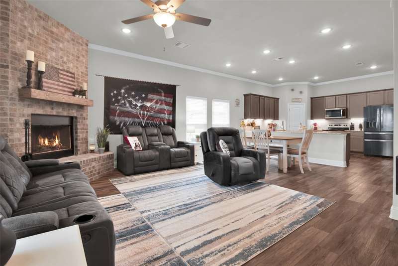 Welcome to a charming corner-lot home that perfectly blends comfort and convenience with a touch of country living. The open floor plan is ideal for everyday life and entertaining, featuring granite countertops, under-cabinet lighting, recessed LED lighting, and a walk-in pantry. A stunning brick fireplace with a wood mantle anchors the living area. The spacious primary suite boasts a large walk-in closet with direct access to the laundry room. Enjoy morning coffee on the front porch and unwind in the evening on the shaded back patio. Ceiling fans in every room and cordless blinds offer added comfort throughout. Located in a quiet, contained neighborhood just minutes from shopping, restaurants, and entertainment. While strolling through the community, you may spot deer and rabbits along the way, adding a special charm to daily walks. Friendly neighbors and a peaceful setting make this home the perfect retreat.