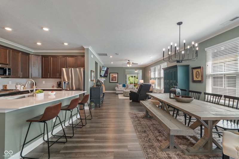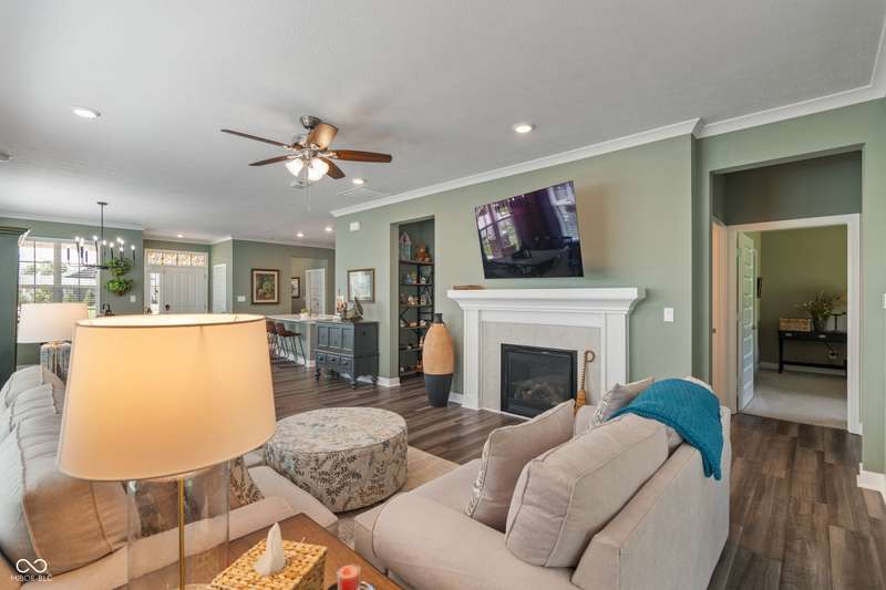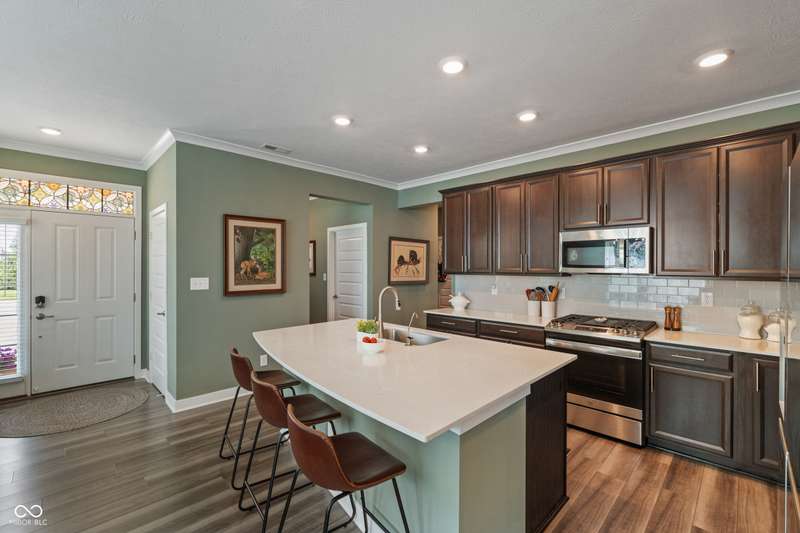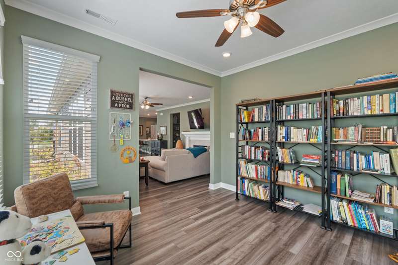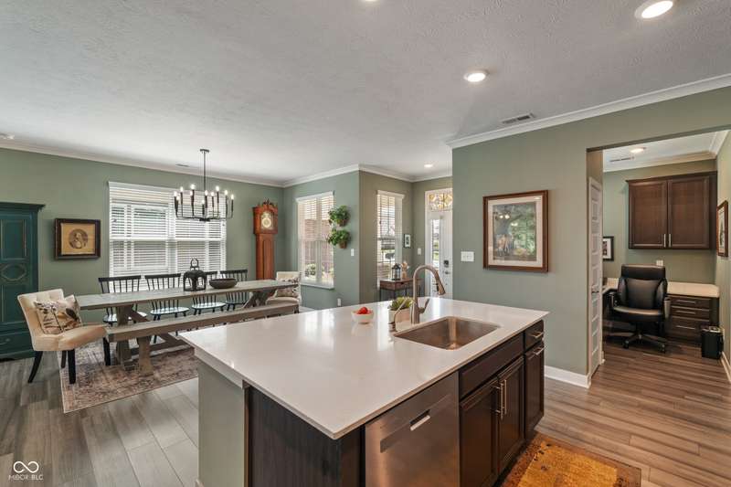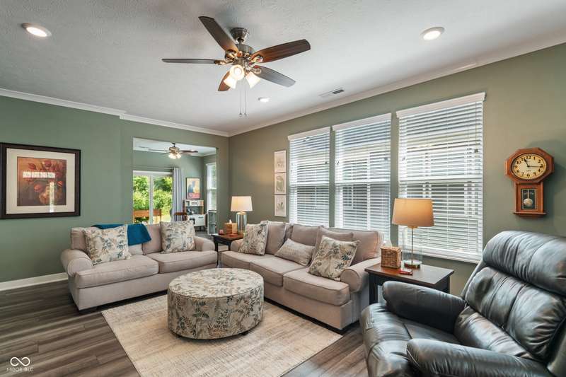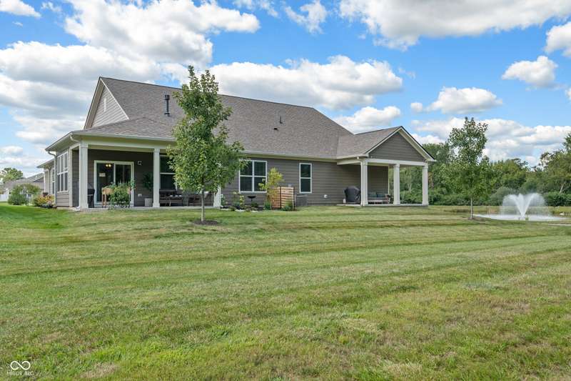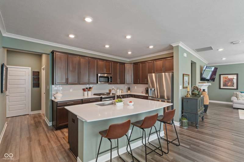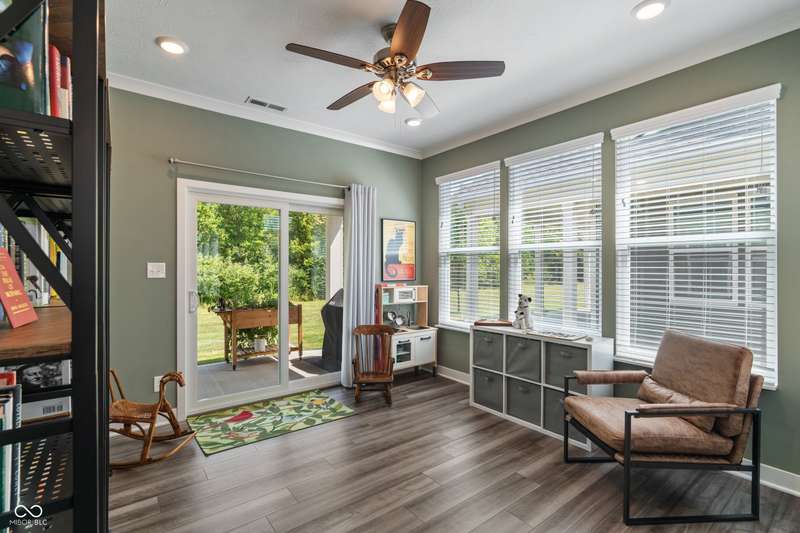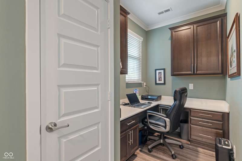 A whole lotta golf and very little work! If this sounds attractive to you, look no further than this pristine 2bd/2ba villa backing up to the 18th tee of Pebble Brook Golf Course! This spacious ranch style villa is 4 years young & teeming w/ modern updates galore! Enjoy 9' ceilings, crown molding LVP floors throughout. Gourmet kitchen features 42'' cabinets, large center island w/ farm sink, quartz countertops, tile backsplash, huge pantry & ss appliances. Secluded Owner's Suite boasts tray ceiling, comfort height dual vanities, walk-in shower, huge walk-in closet with custom organizers & clever laundry access. Dedicated office space along w/ peaceful flexroom add creativity to your living space. Covered back porch overlooks tree-lined private backyard. Scratch your golf itch by hopping on the golf cart trail nestled next to your backyard! Deep 2 car garage & irrigation system, next to impossible to find at this price. Leave your mower & snowblower; rest easy & savor this low maintenance lifestyle. Book showing, a tee time and move right in!