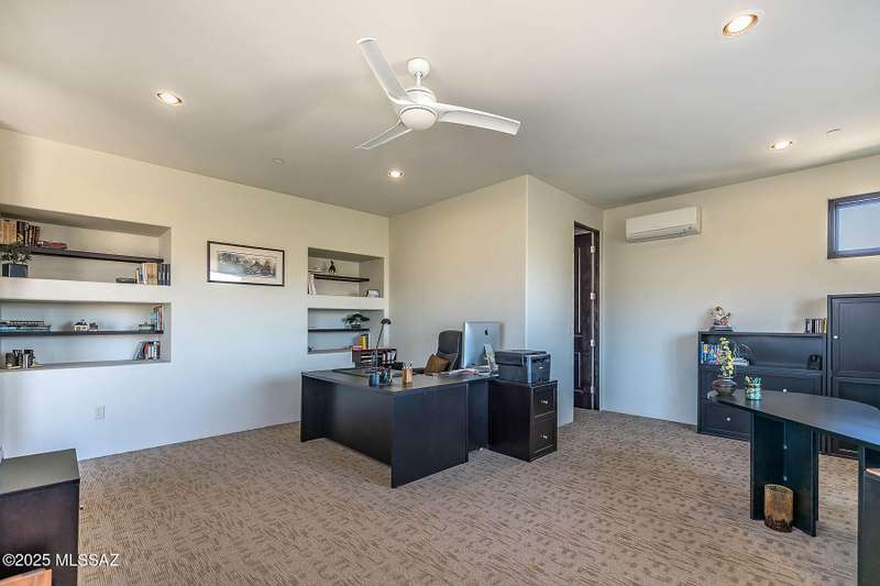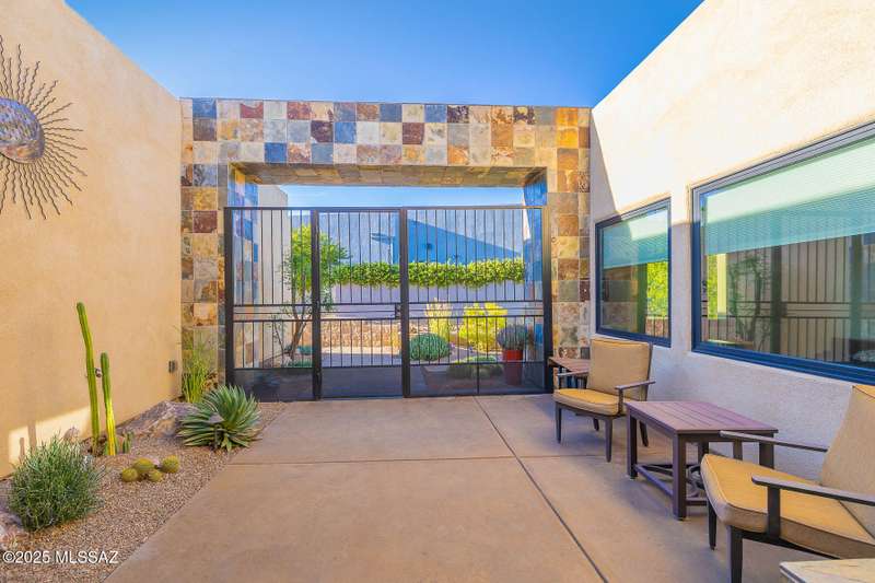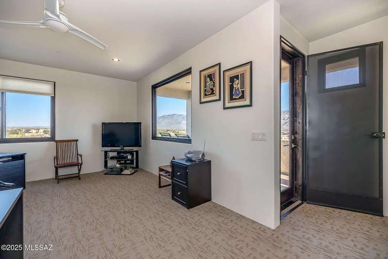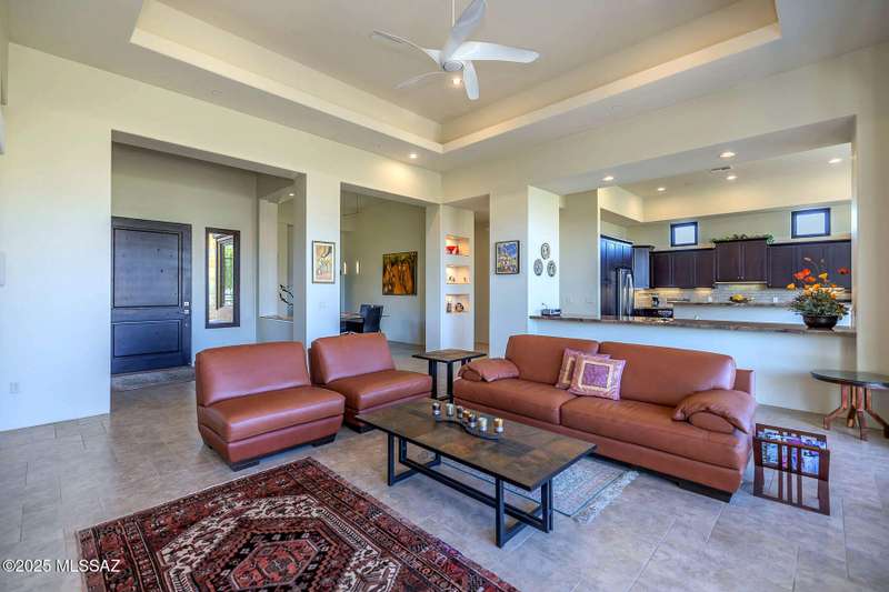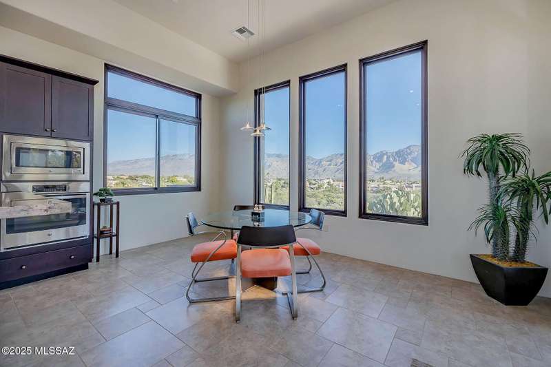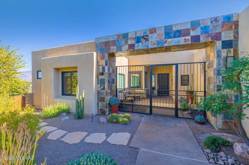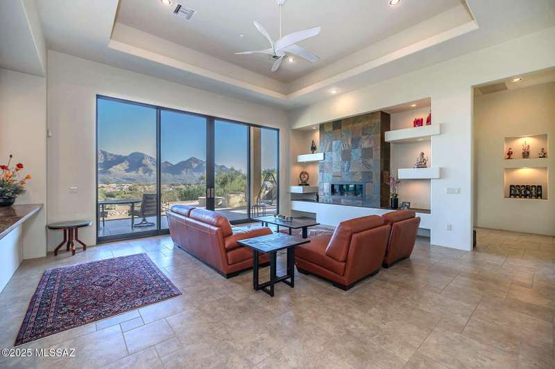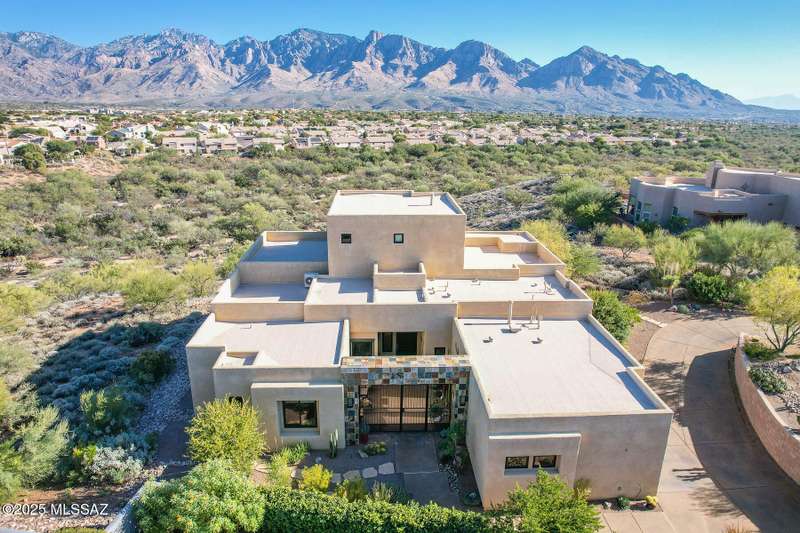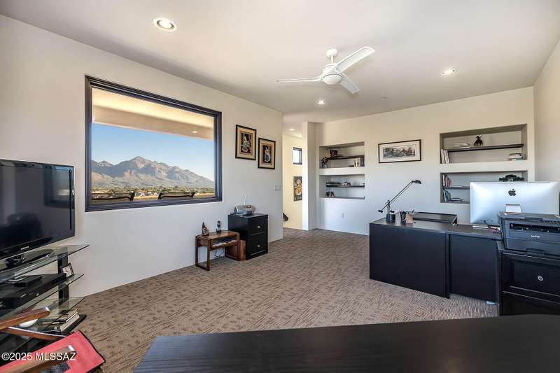 LUXURIOUS CUSTOM ESTATE nestled within the gated, picturesque community of Vistoso Pointe affords architectural detail, flexible living spaces plus uncompromising desert, mountain & city light views. Elevated, Premium East-facing lot with no one directly behind affords ultimate privacy. Featured are 4 bedrooms, 2.5 baths plus 3,531 sq ft of elegant living space including a spacious, upper level office/5th bedroom. Striking courtyard entry displays an expansive wrought iron gate with slate tile surround to welcome your guests. Inviting foyer flows effortlessly to formal dining room and large gathering room displaying a soaring, recessed ceiling, slate tiled fireplace flanked by art shelves, plus walls of windows accentuating the magnificent views. Gourmet kitchen hosts large center island,