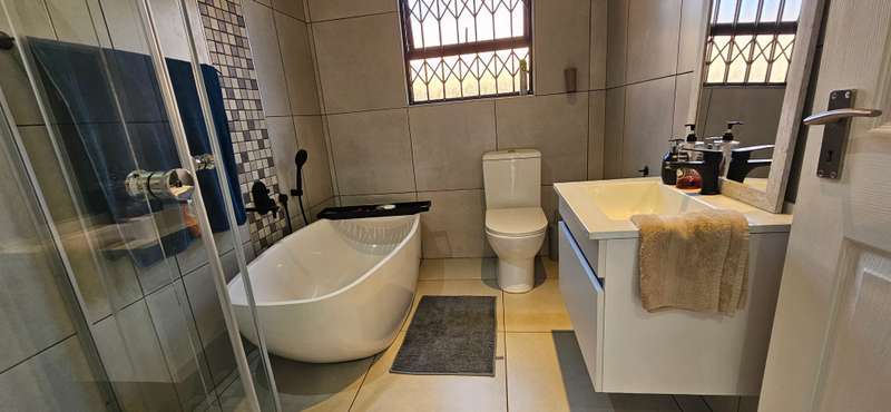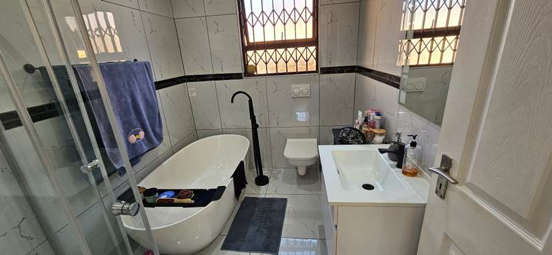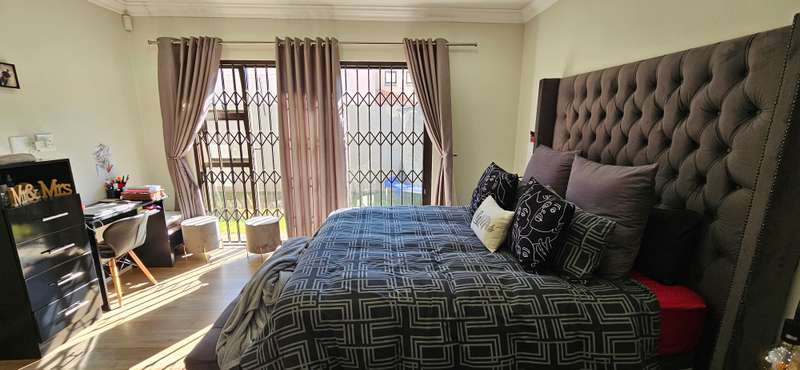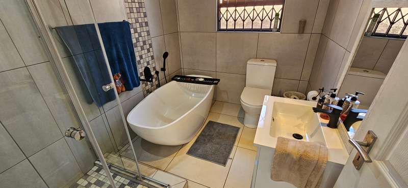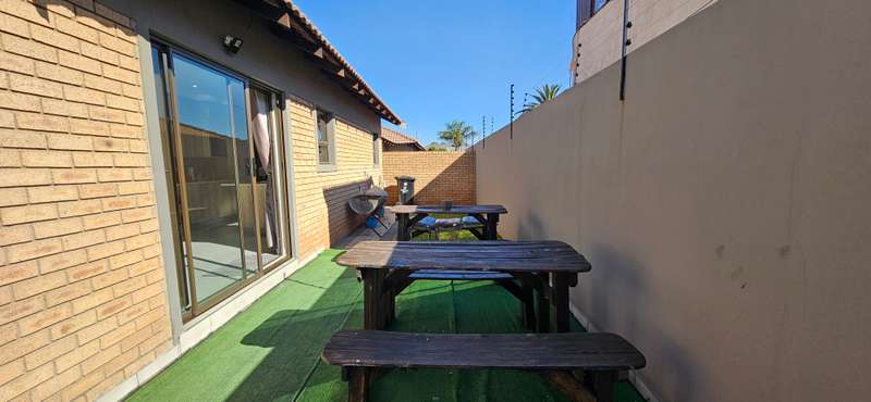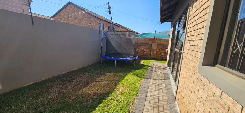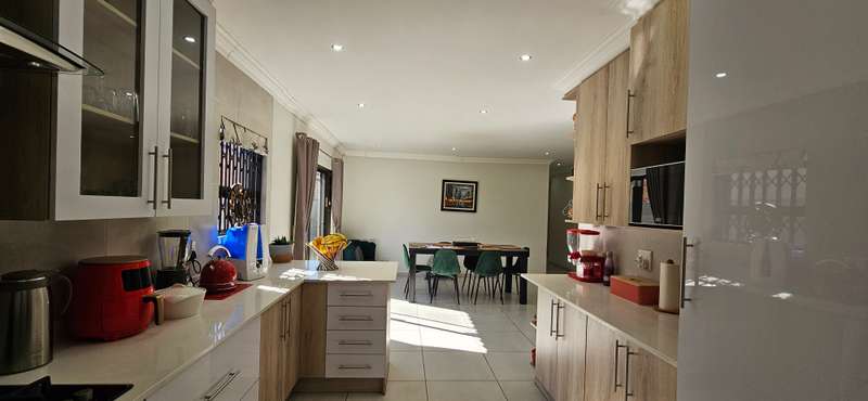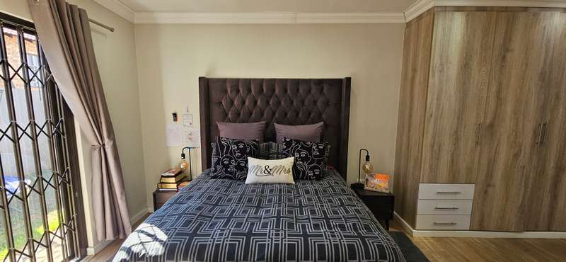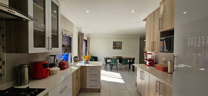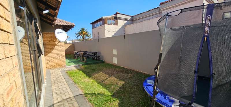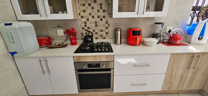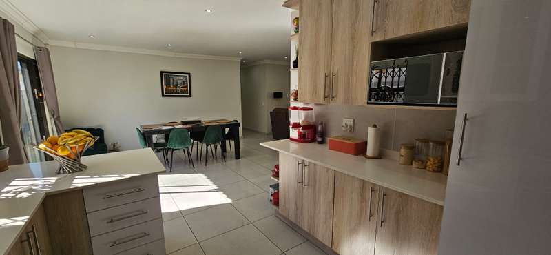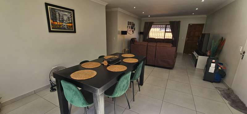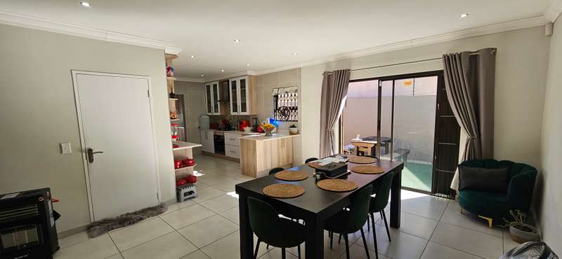 Welcome to this beautiful and modern unit featuring a large open plan lounge, dining room and a modern kitchen with a gas hob, stone countertops, ample cupboards and a separate scullery. Sliding doors from the living area leads out to a private and pet friendly garden. There are 3 good sized bedrooms with built in cupboards and 2 full bathrooms. Extras include a solar geyser and pre-paid electricity. Complete with a double garage plus an extra parking as well. A well secured unit with an alarm system, security beams and electric fencing around the complex. Close to amenities and easy access to main roads as well.
