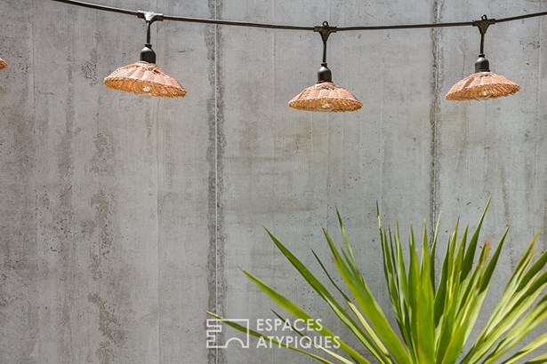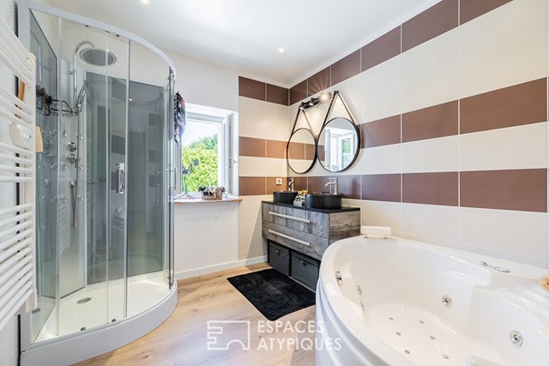 One of the bay windows opens onto an elegantly tiled terrace, in a concrete style, extending the indoor comfort into an outdoor setting dedicated to relaxation. A charming, intimate, walled garden and a spa pool complete this wellness experience.