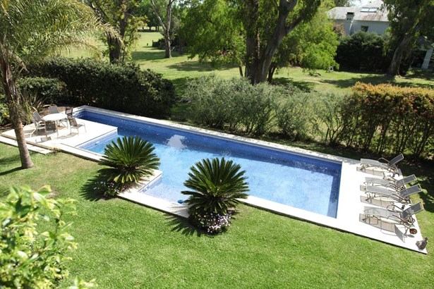 En subsuelo, amplia cochera con control remoto; dependencia de servicio; espacio acondicionado para diversos usos (playroom, gym); lugar de almacenamiento u otro uso; vestuario; baño; jardín inglés en el lateral; pileta climatizada; riego automático.