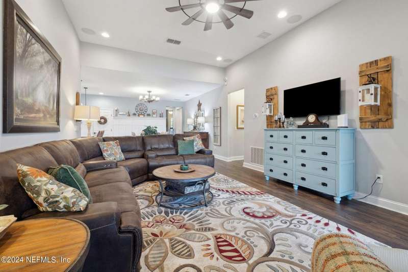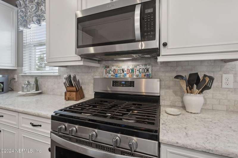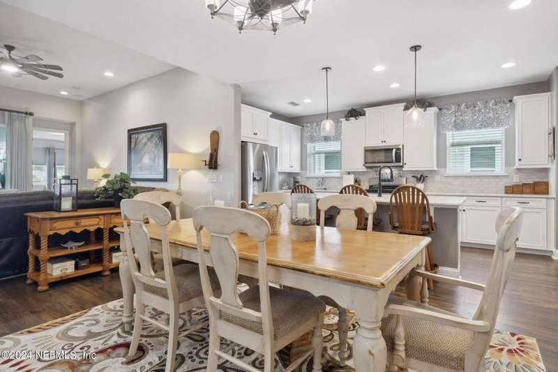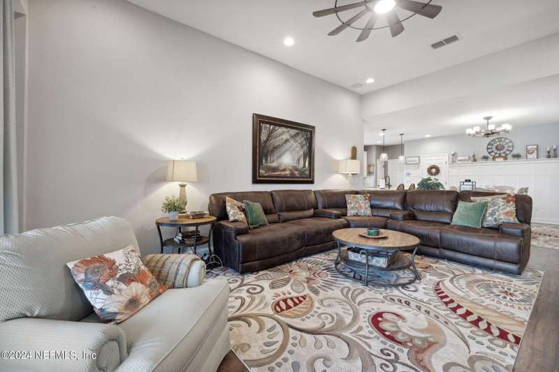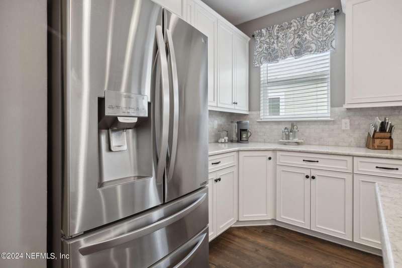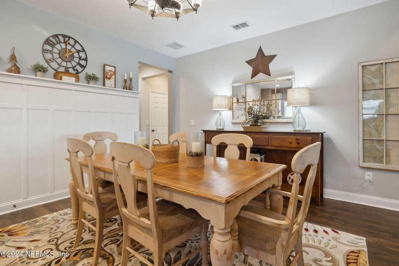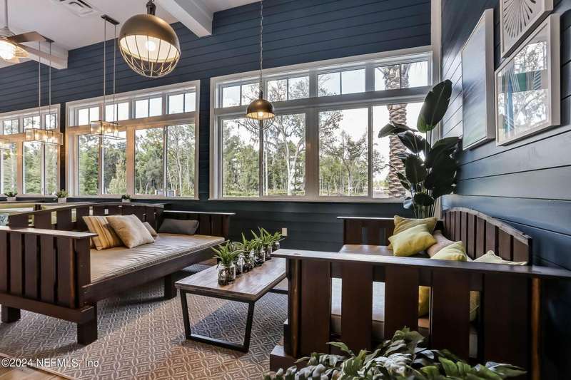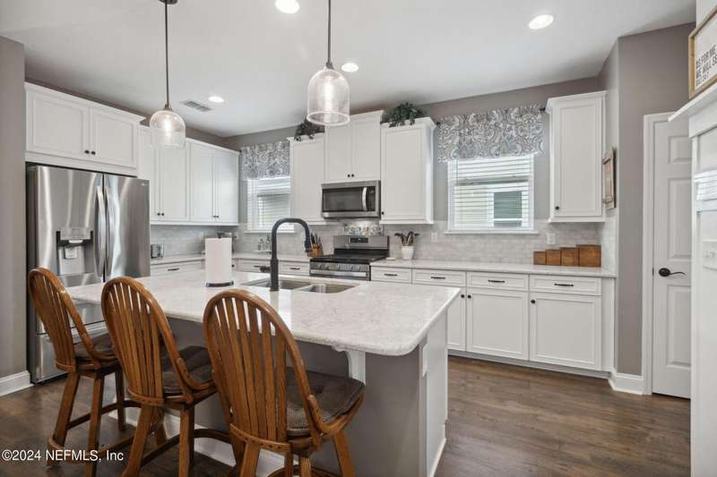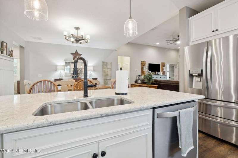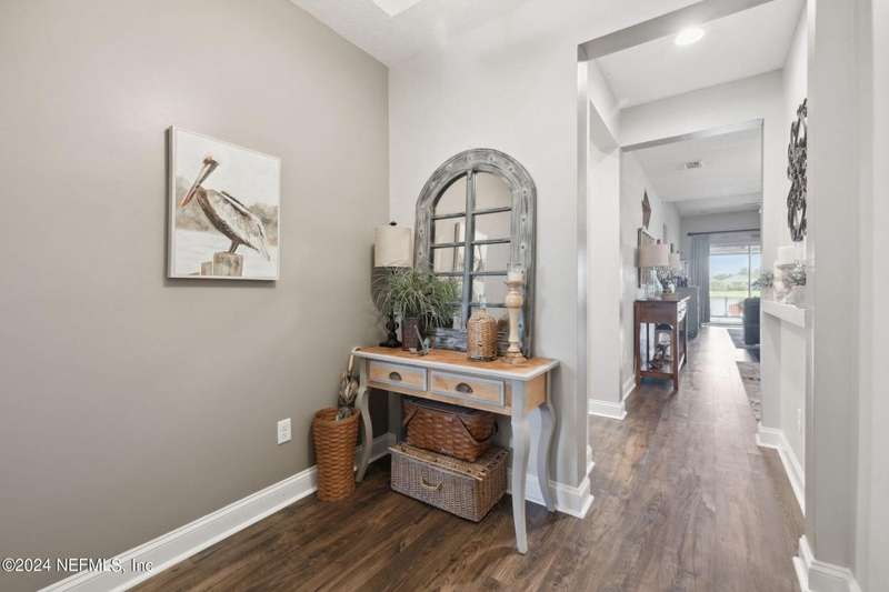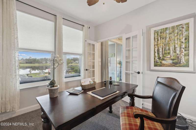 BUYERS CONTINGENCY FELL THROUGH! Motivated Seller. You will love this charming 3 Bed, 2 Bath with an inviting front porch perfect for chatting with neighbors. The expansive kitchen features stainless steel appliances including a whisper quiet dishwasher, gas range, exquisite quartz countertops, 42'' cabinets, undermount lighting, crown moulding, beautiful tile backsplash, Bubble Glass Pendant lights. Enjoy pantry and broom closets with wood shelving, an art niche, and garage access. The dining room has an amazing custom Classic American Flat Panel style wall. The living room features 12-foot ceilings and opens to an oversized screened and paved lanai with gas bib and a 220-amp outlet to accommodate a future spa. An additional flex room with French doors for use as an office, playroom, gym or den. Enjoy breathtaking sunsets and water views by the firepit with family and friends. The sunbathed Owner's suite has a large bath with quartz counters, dual vanity and large walk-in closet. Second and third bedrooms share a large hall/guest bath. This amazing home features a whole house Generac generator, water softener system, gutters and fenced back yard. Walk to the River Club & enjoy events, the River Cafe and St. Johns River sunsets by the pool.