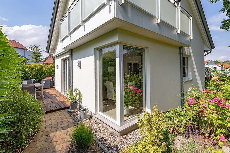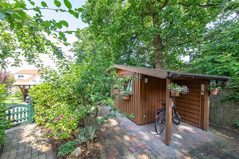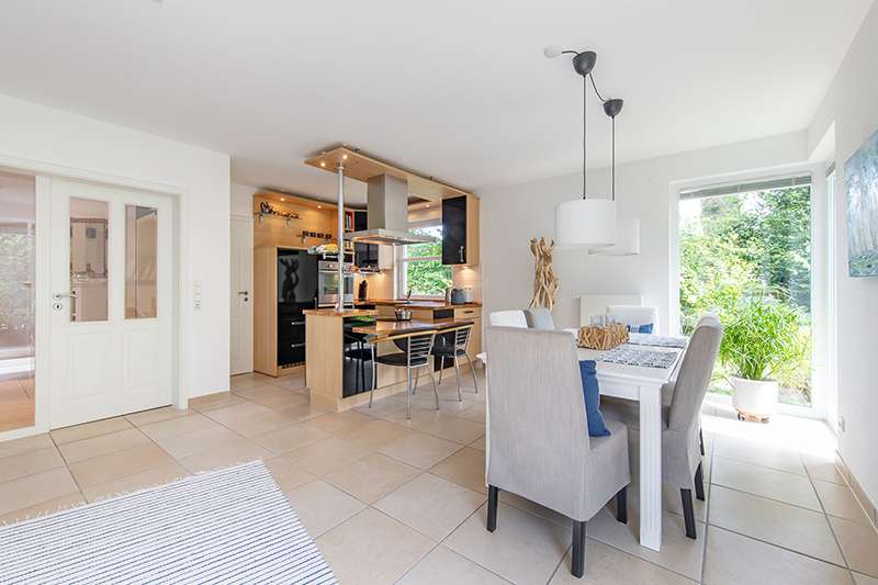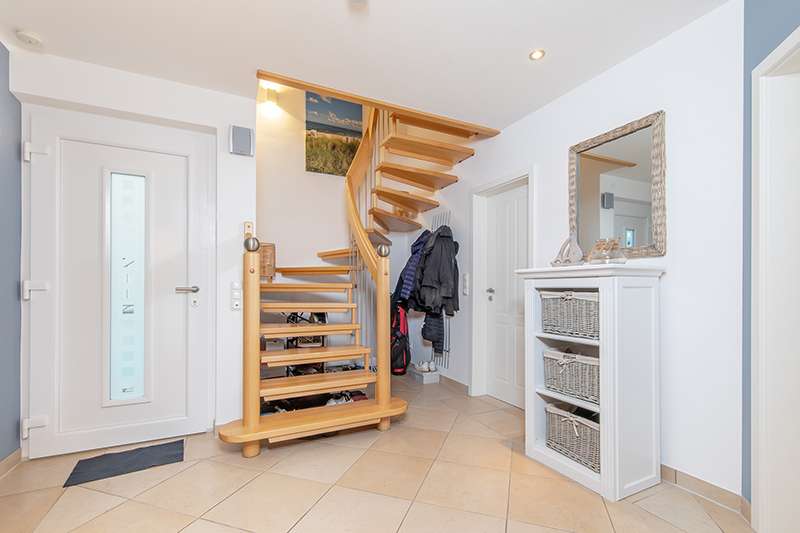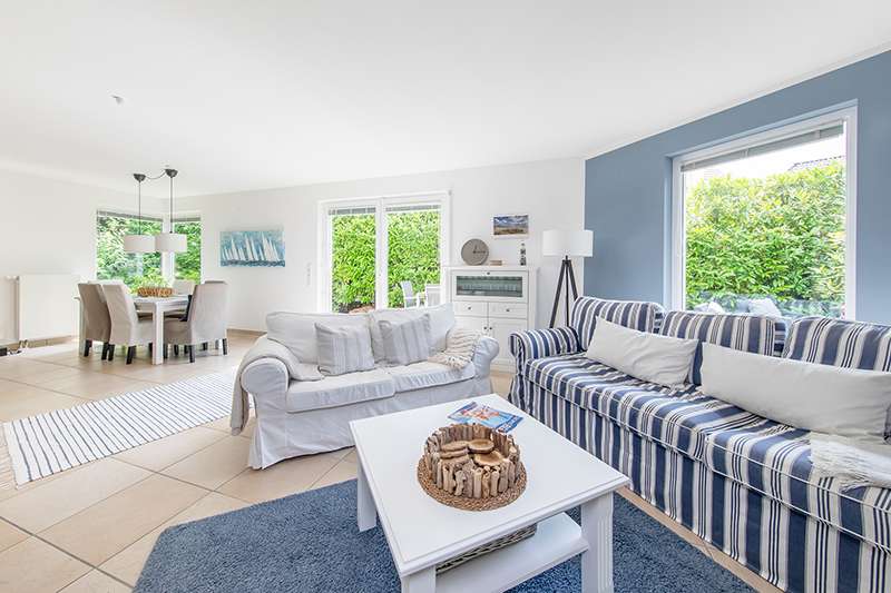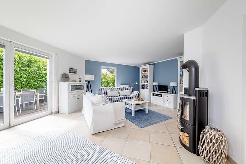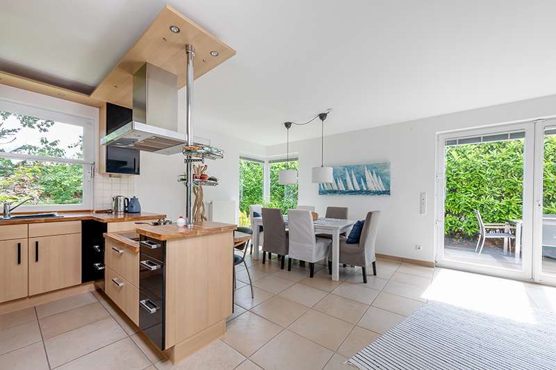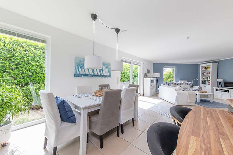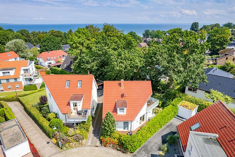 Beach life or oasis of peace? Here you will find both! Built in 2007, the house with two residential units has a living space of approx. 138 m² and a plot area of approx. 393 m². The property offers high-quality fixtures and fittings and impresses with its attractive architecture and well thought-out room layout. The house has a total of 4 rooms, including 3 bedrooms and 2 bathrooms. A highlight is the bedroom with roof terrace, from which you can even enjoy partial sea views in winter; the latter is also possible from one of the children's rooms. On entering the property, you find yourself in the hallway, from which all rooms on the first floor lead off. In the living room, a working fireplace provides a cozy atmosphere, while pleated blinds ensure sufficient privacy. The spacious living and dining area invites you to spend pleasant hours together with family or friends. The integrated, open-plan kitchen keeps you connected to the action so that cooking can become a joyful experience. On the first floor there is also a shower room for guests or as an alternative and a utility room with additional kitchen furniture and connections for a washing machine and dryer. An open wooden staircase leads to the upper floor of the house. Here there are 2 rooms, which can optionally be used as a children's room or office, as well as the master bedroom with direct access to the roof terrace, which offers a view of the Baltic Sea in fall and winter. From one of the children's rooms you can also enjoy a partial sea view in winter. The current owners have separated the area somewhat and put up a wall so that the children can visit the bathroom undisturbed at any time without having to enter the parents' bedroom. In its original state, the bathroom was only accessible via the master bedroom (ideally the parents' area). The loft offers space for all kinds of practical items, seasonal decorations or sports equipment. However, there is also the possibility of extending the space here. The garden scores with a beautiful terrace that runs around it, fruit trees, a very well-kept condition and is suitable as a wonderful relaxation area thanks to the all-day sunshine. The house has a double carport and a separate cellar room, which is located in the neighboring building (part of the condominium complex). The underfloor heating in the living room and in both bathrooms ensures that it is pleasantly warm even on cold days. Overall, this is a ready-to-move-in property with space for the family or as a beautiful second home for your own vacation purposes. The location close to the beach offers a high level of comfort - daily walks on the beach after a long day at work are easily possible here - you are only about 600 m away from the sea breeze on foot. The property is part of a condominium community with an administrator, which ensures orderly and professional management. Due to the original planning and approval as a house with two residential units, the building is classified as a two-family house in the energy certificate, but it is used and inhabited continuously and not separately. This means that a monthly house fee, which includes all expenses excluding electricity, of currently € 502.00 per month is due. The WEG consists of a total of 3 parties. Are you curious? Then we look forward to hearing from you to arrange a viewing appointment so that you can see this outstanding property for yourself!