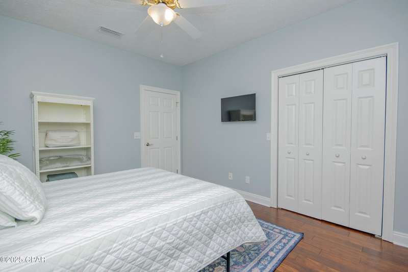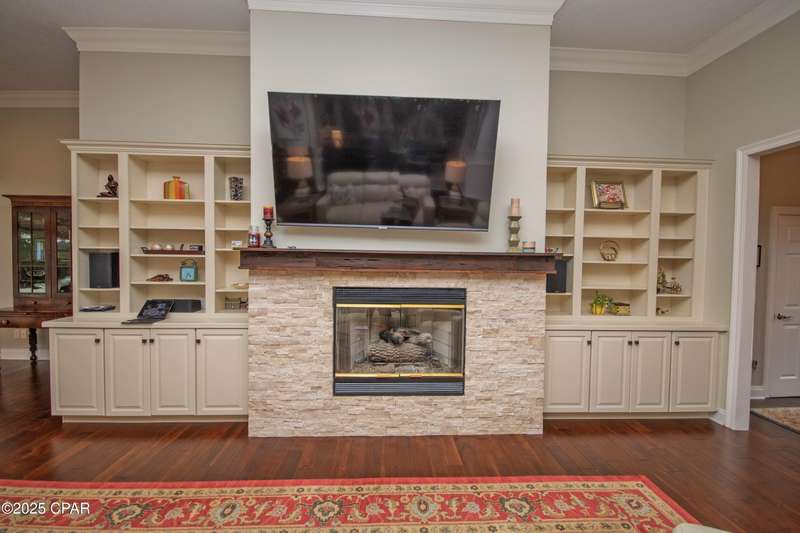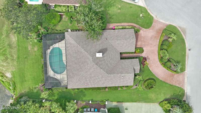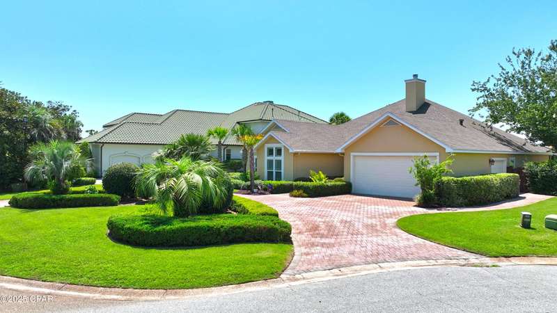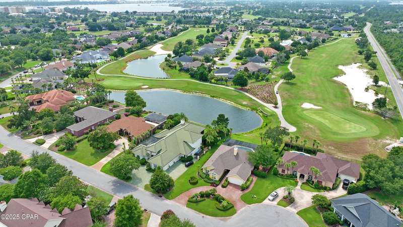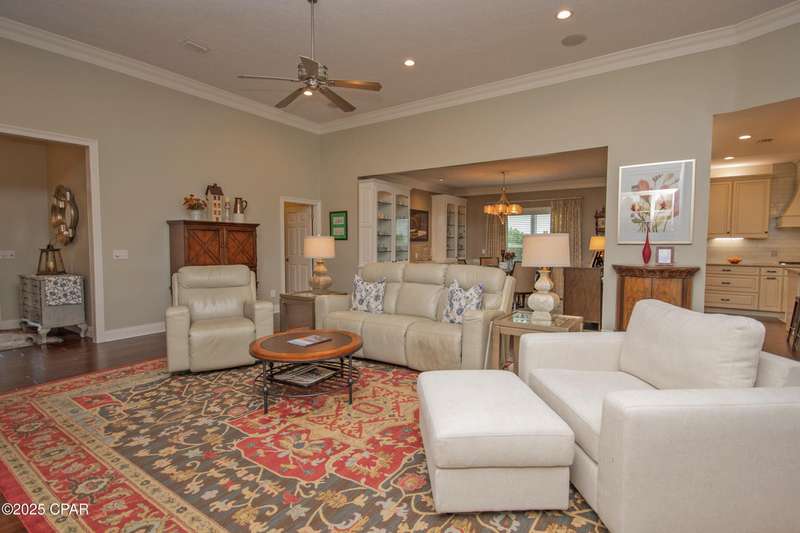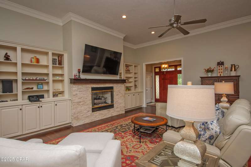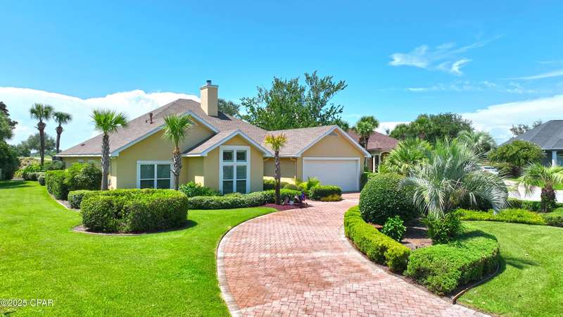 Welcome to Legend Hills in Bay Point! A private gated golf course community. The home is located between the 9th green and the tee box of the 10th hole par 3 over the water, and on the cul de sac of Dragons Ridge Road. This 4 bedroom, 3 bath home includes a beautiful open floor plan with incredible sunset views over the screened pool patio and the golf course. Soaring 12' ceilings with crown moldings, built-in cabinets, and the gas fireplace create an open welcoming home. The oversized 2-car garage includes a separate garage door for your golf cart, two large closets, built-in storage cabinets, and polyurea floor coating with a lifetime warranty. Renovated in 2018 after Hurricane Michael, the home features a new 3-dimensional shingle roof, spray-foam insulation, new HVAC systems, all new hurricane-rated windows and doors, engineered acacia hardwood flooring, completely renovated kitchen (new cabinets, quartz countertops, KitchenAid stainless steel appliances, etc.), Waypoint cabinets in the kitchen, great room, and master bathroom, a new pool screen enclosure, refinished gunite pool, new pool pump & filter, and more. The master bathroom includes a huge walk-in closet and the frameless glass shower includes a steam generator with bluetooth speakers, lighting, and aroma therapy. Bay Point residents have 24-hour security, gated entry, the Nicklaus Golf Course, the Point South Marina that hosts the annual Bay Point Invitational Billfish Tournament, and a golf cart friendly community. Often called the best neighborhood in Bay County. The home is vacant and easy to show. Call today to schedule your private tour and submit your offer.