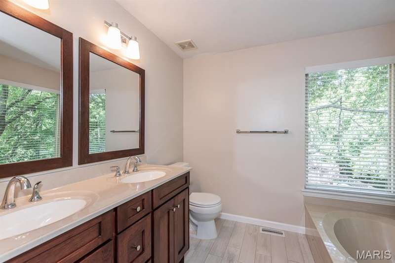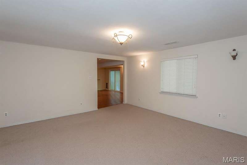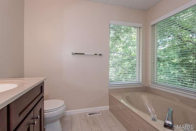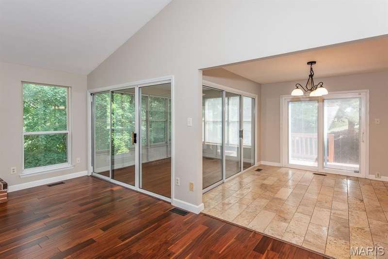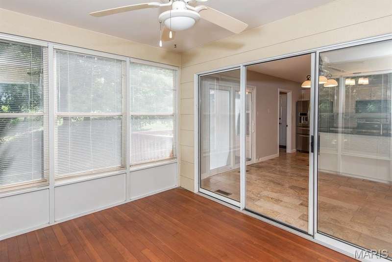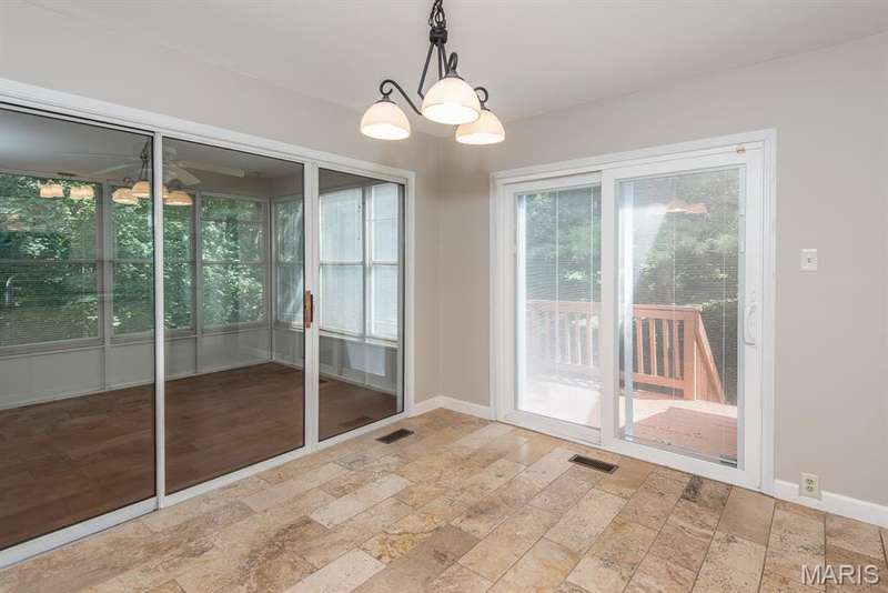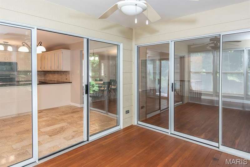 Welcome to this beautiful 3 bed (could be 4), 3 bath ranch on an oversized lot with incredible curb appeal and backing to peaceful wooded common ground! Enjoy the vaulted great room with fireplace, open to the stylishly updated kitchen (2017) featuring granite counters, subway tile backsplash, ceramic tile floors, and stainless steel appliances. Step right into the spacious 3-season room, perfect for relaxing or entertaining. Gorgeous engineered wood floors (2018) run through the main living spaces and bedrooms. The front office can easily convert to a 4th bedroom. In the hall you will find a powder room (2017) for the secondary bedrooms, while the primary suite offers a walk-in closet and overlooks the serene, fenced yard with mature trees. The renovated en-suite (2017) features dual sinks, adult-height vanity, garden tub, and separate shower. Walk-out lower level offers a rec room with wet bar, a large flex space (ideal as a 4th bedroom or family room with a walk in closet), and a full bath. Lots of storage in the unfinished portion of the basement. Additional highlights include a 3-car garage, main floor laundry, central vacuum, 6-panel doors, and a sprinkler system. New AC unit installed August (2025) Rockwood Schools, parks, and shopping nearby, this home has it all!