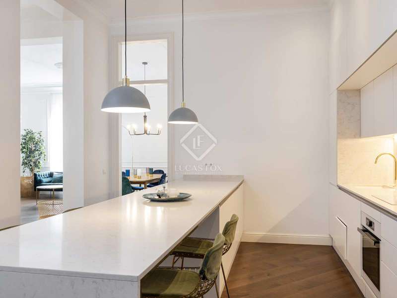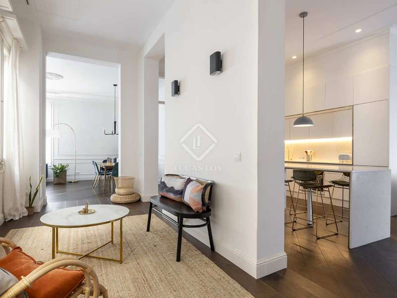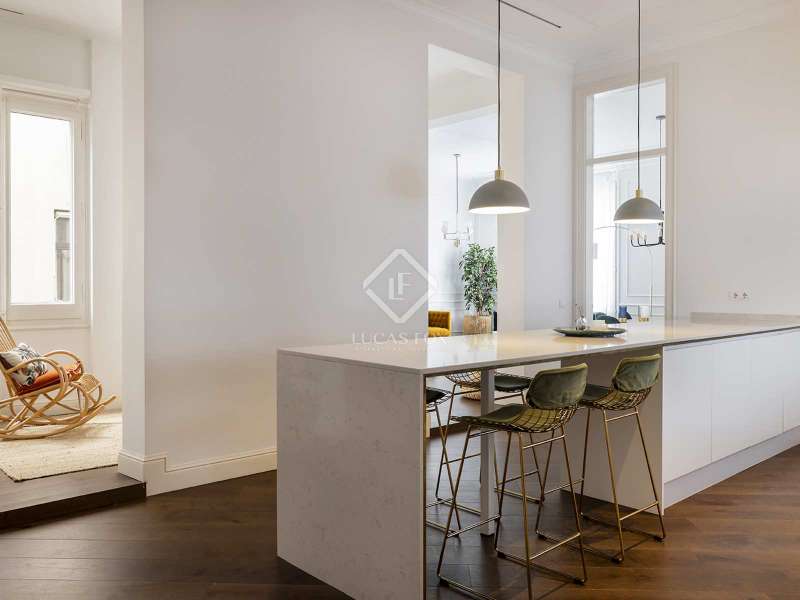 This exclusive historic apartment is a magnificent Modernista gem. This residence seamlessly marries historical grandeur with contemporary sophistication, achieving a harmonious balance through meticulous design and opulent finishes. Spanning a total area of 154 m², this 2-bedroom haven is a testament to refined living. The main suite, a sanctuary of comfort, boasts a private bathroom and an in-built 5-door wardrobe, ensuring ample storage space and privacy. The second double bedroom comes complete with its own luxurious bathroom, catering to both convenience and style. What truly sets this home apart is its fully renovated space that reverently preserves the original Modernist essence, evident in the intricately detailed ceilings. The pièce de résistance, however, is the generously sized living room, adorned with lofty ceilings that elevate the overall sense of grandeur. The vast living room space is a breathtaking feature, not only for its size but also for the panoramic views it offers, like the iconic Casa Calvet, designed by the legendary Antoni Gaudí. This commanding view is one of the highlights of the living area, blending the historical charm of the surroundings with the comforts of modern living. Please contact us for further information and to arrange a viewing.