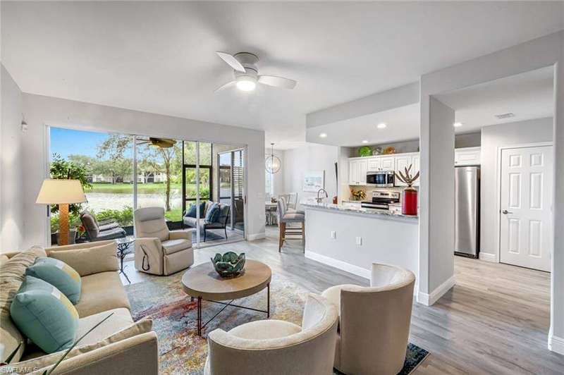 Welcome Home to Pelican Sound Golf & River Club - one of the most amenity-rich communities in all of Southwest Florida! This beautifully renovated 2 Bedroom + Den, 2 Bathroom Coach Home is being offered TURNKEY FURNISHED and is ready for you to move in and start enjoying the ultimate SWFL lifestyle! Step inside and experience luxury from top to bottom. Elegant luxury vinyl plank flooring flows seamlessly throughout the home, complemented by new ceiling fans, updated light fixtures, plantation shutters and has been tasteful furnished/decorated. The chef-inspired kitchen features stainless steel appliances, quality hardwood cabinetry with soft-close drawers, granite countertops, and modern recessed lighting-perfect for both everyday living and entertaining. The primary suite is a private retreat, offering ample space, two closets and wide-open water views! The primary bathroom boasts granite countertops, custom cabinetry, and a reimagined walk-in shower with frameless frosted glass and designer tile. Both bedrooms offer king-sized beds, while the den-complete with new doors and a pull-out sofa-provides flexible space for guests or a home office. Relax and unwind on your private screened lanai, accessible from both the great room and primary suite, where you'll enjoy tranquil lake views and a picturesque water feature. And the attached one-car garage with overhead storage, offers convenience for either a vehicle or your very own personal golf cart. The home is nestled in Pelican Sound Golf & River Club, Southwest Florida's most desirable BUNDLED GOLF community, offering 27 holes of Championship Golf, nine tee settings that invite participation from all ages and skill levels. For those who prefer adventures beyond the golf course, PSG&RC boasts 14 PICKLEBALL COURTS, 8 Har-Tru Tennis Courts, 5 Bocce courts, a large resort-style pool, 4 satellite pools/spas w/ BBQ grill stations, a brand new fitness center, walking trails, a dog park and culinary experiences ranging from casual to Fine-Dining, all without ever leaving the gates! Located on the Estero River, the completely renovated and reimagined River Club is conveniently located near the On-site Boat, Kayak & Paddle Board Launch and a complimentary Beach Shuttle to Lovers Key State Park. A Prime location West of 41, only 15 minutes to RSW International Airport, over 100 shops/dining options at Coconut Point Mall just 2 short miles away, minutes from Bonita Beach, and much, much more! Schedule your private showing and start living the life you deserve, TODAY!