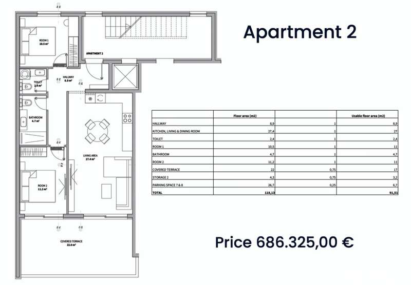Apartment S-2B - 1st floor - living area 64.61 m2 (2 bedrooms + bathroom + WC) + covered terrace (22 m2) + storage (4 m2) + two outdoor parking spaces no. 7 and 8; net calculated area 91.51 m2 = 686,325.00 EUR