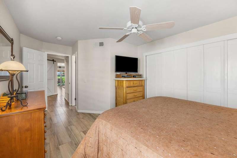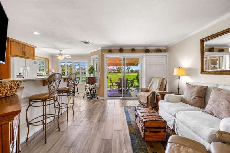 Dramatic lake, fairway and views of the Santa Rosa Mountains from the patio of this luxury condo. The 7th fairway pond and waterfall are visible from the private south facing patio. Private patio features an awning and ceiling fan. Interior is highly upgraded. Kitchen has been reconfigured and extensively upgraded. Features newer cabinetry with a built-in buffet and lazy Susan turnstile corner cabinets. A bonus of slab granite counters and upgraded appliances. Bath upgrades include newer vanities with slab granite counters, walk in custom tile showers, and linen closet storage. Ceramic plank tile flooring throughout. Bedrooms and closets have upgraded raised panel doors. Energy efficient upgrades include Milgard vinyl windows and patio door, and ceiling fans which combine luxury with sustainability. Decorated in warm neutral colors. Furnishings available. Garage features built in storage and is larger than the standard garage. to accommodate storing a larger than average vehicle. The inclusion of a 1-car garage adds practicality to the package. The complex's amenities include 6 community pools and spa areas, to provide ample opportunities for relaxation and recreation. The added perk of UNLIMITED golf on a Ted Robinson designed par 3 course. Featuring tennis and pickleball courts that are well maintained. Now the area headquarters for Helix Disc Golf, enhances the lifestyle appeal. Low HOA dues covering essential services, cable, and internet make for worry-free living, while convenient access to shopping, dining, and transportation adds to the property's allure. Situated across from the Indian Wells Tennis Gardens, home of the Paribas Open, this property is perfect for either full-time residence or a luxury seasonal home. Overall, it truly offers a lifestyle of convenience and luxury, appealing to those seeking the ultimate in comfort and relaxation.