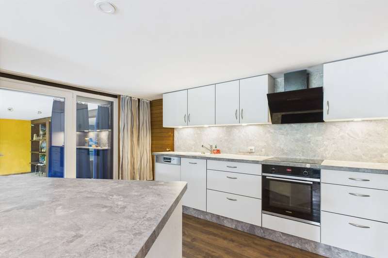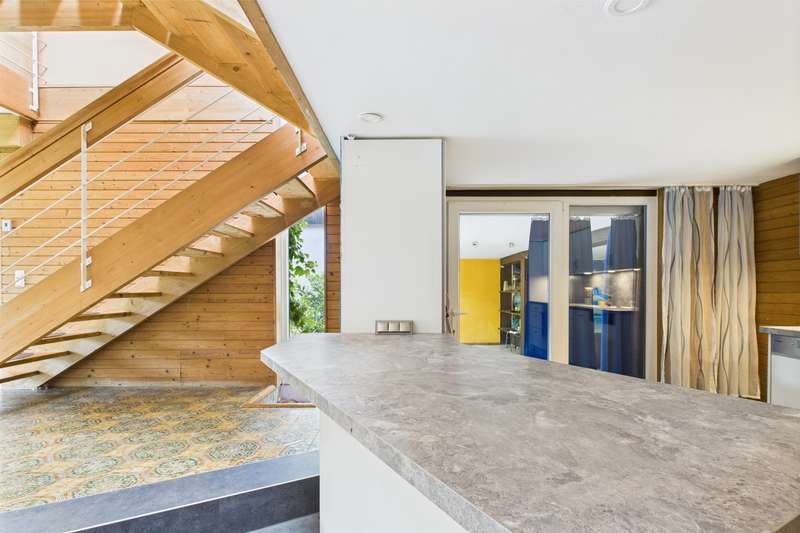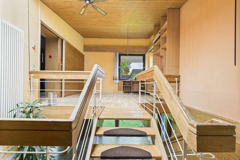 Welcome to an extraordinary home that combines open-plan concepts with homely comfort thanks to its split-level design. This property impresses with its well thought-out architecture, light-flooded rooms and numerous highlights for the whole family. The stylish vestibule welcomes you with a generous feeling of openness and guides you to the different levels of the house. The open kitchen forms the heart of the living area - it is ideal for communicative cooking and sociable evenings and opens up harmoniously to the living and dining area. The living area itself impresses with floor-to-ceiling windows that not only provide plenty of natural light, but also allow direct access to the garden. A wood-burning stove provides pleasant warmth and a cozy atmosphere in the cooler months of the year. One of the staggered levels features an inviting office space with a fantastic view of the greenery - perfect for concentrated work or creative moments. Also on this level is the master bedroom with direct access to the main bathroom, which invites you to relax with a spacious, round bathtub. There are two bright, friendly rooms for children, offering plenty of space for playing, learning and dreaming. An additional bathroom with shower ensures comfort and functionality in everyday life. The gallery not only lends the house architectural sophistication, but also an open, airy feeling of space and offers a wide range of possible uses. This attractive offer is rounded off by a work-hobby room - a sheltered retreat whatever the weather - and a spacious garage with space for two vehicles. A small, idyllic inner courtyard completes the ensemble and offers additional space for individual design.