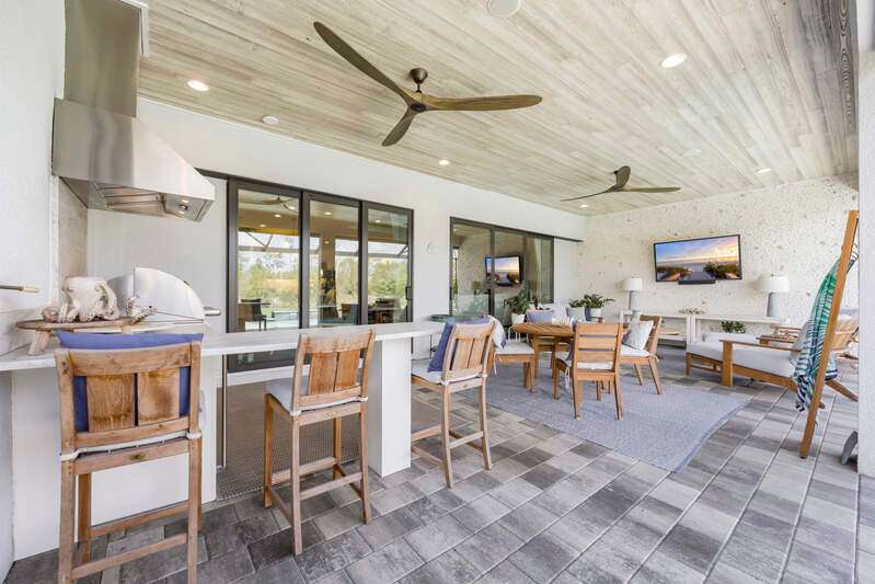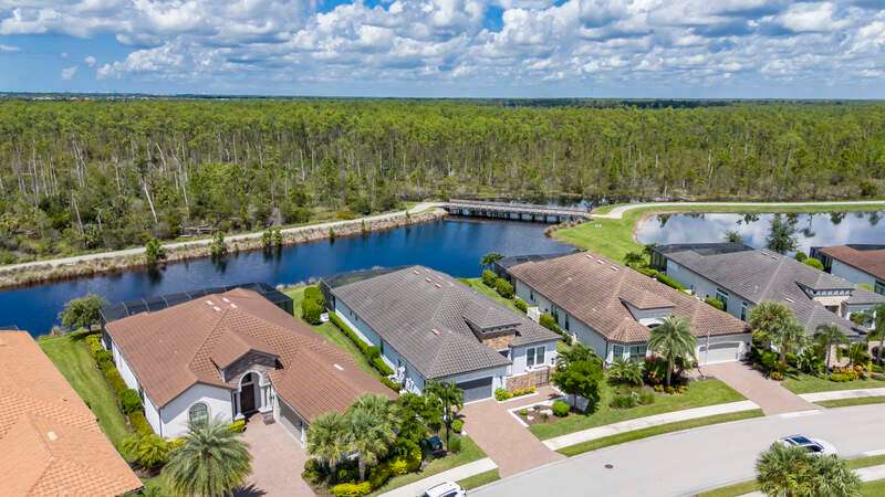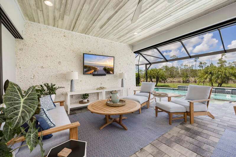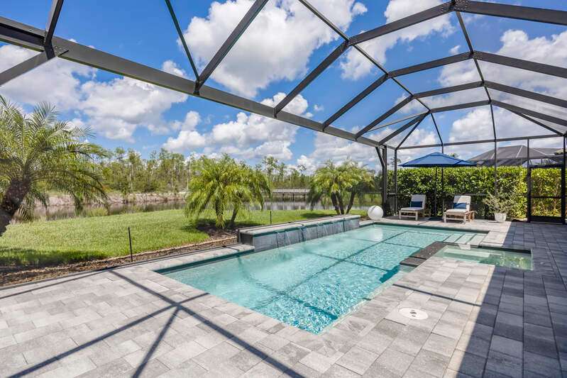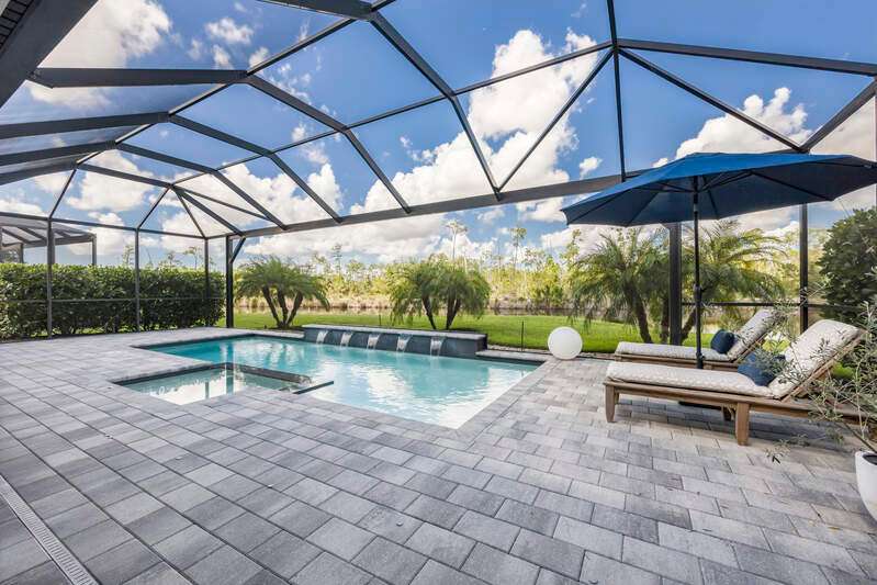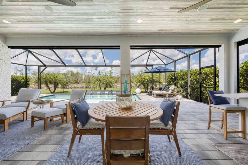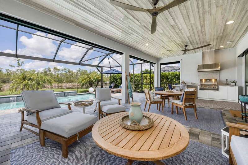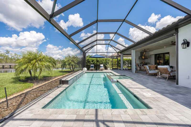 This stunning Pallazzio floor plan offers over 3,000 square feet of elegant living space, complete with three bedrooms, a den, and three full baths. Designed for both comfort and sophistication, the home includes an immediate full golf membership, making it an ideal choice for those seeking a vibrant lifestyle with world-class amenities at their fingertips. Thoughtful upgrades are found throughout the residence, starting with hurricane-rated windows, sliders, and doors, a new hurricane impact front door with matching side panels, and Storm Smart motorized shutters for peace of mind. A whole-house gas generator, tankless hot water heater, and a full water filtration and reverse osmosis system ensure modern convenience and efficiency. Inside, 10-foot ceilings, 8-foot doors, and Synergy cypress wood accents in the entryway, lanai, foyer, great room, primary suite, powder room, and laundry add warmth and architectural character. The extended gourmet kitchen is a true centerpiece, featuring GE Monogram appliances, a natural gas cooktop with wall oven, wine and beverage coolers, glass display cabinetry, and under-cabinet lighting. A SONOS sound system with in-ceiling speakers, custom designer lighting, and professionally designed draperies and blinds elevate the home's interior design. The spacious primary suite offers a walk-in closet with custom shelving, a luxurious bath with double sinks, makeup area, and a frameless glass shower, while guest suites feature their own stylishly appointed bathrooms. Step outside to a private retreat on the oversized lanai, enhanced by a feature shell wall, bar seating, and a fully equipped outdoor kitchen. The gas-heated saltwater pool and spa with waterfall features are surrounded by picture window screens, mature native landscaping, and front and rear landscape lighting, creating a serene backdrop of preserve views and glowing sunsets. Additional highlights include an extended two-car garage with epoxy flooring, built-in storage, insulation, air conditioning, and a refrigerator, as well as ceiling fans in every bedroom, the den, great room, and lanai. High-end furniture is negotiable, allowing for a seamless move-in experience. Every detail of this property has been carefully curated for luxury, comfort, and peace of mind-ideal for both entertaining and quiet enjoyment.