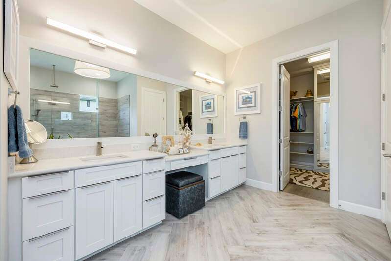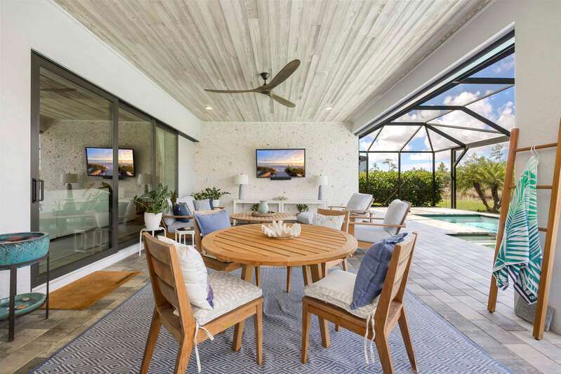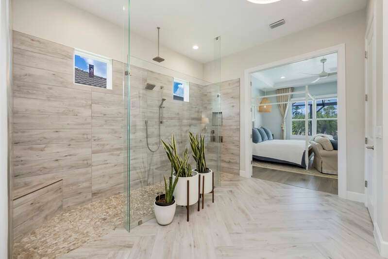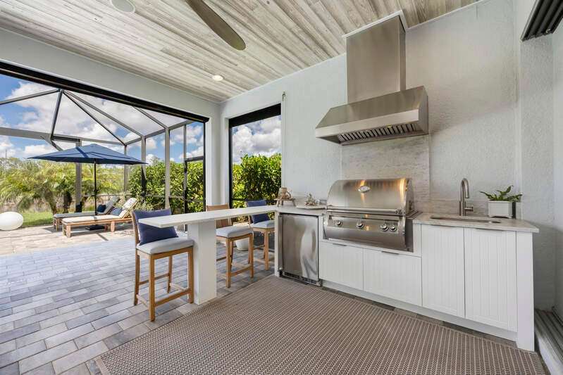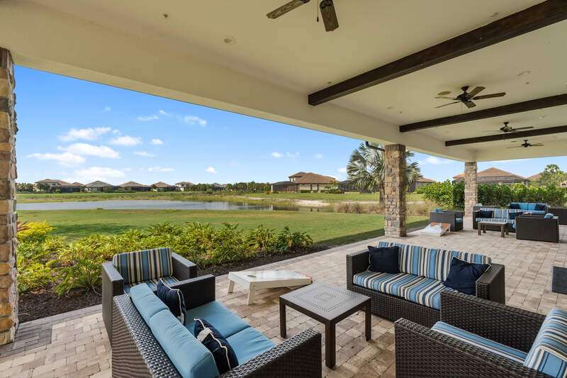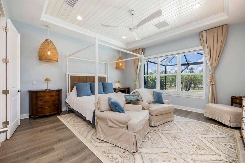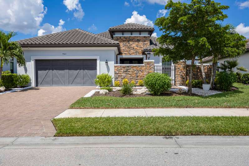 This stunning Pallazzio floor plan offers over 3,000 square feet of elegant living space, complete with three bedrooms, a den, and three full baths. Designed for both comfort and sophistication, the home includes an immediate full golf membership, making it an ideal choice for those seeking a vibrant lifestyle with world-class amenities at their fingertips. Thoughtful upgrades are found throughout the residence, starting with hurricane-rated windows, sliders, and doors, a new hurricane impact front door with matching side panels, and Storm Smart motorized shutters for peace of mind. A whole-house gas generator, tankless hot water heater, and a full water filtration and reverse osmosis system ensure modern convenience and efficiency. Inside, 10-foot ceilings, 8-foot doors, and Synergy cypress wood accents in the entryway, lanai, foyer, great room, primary suite, powder room, and laundry add warmth and architectural character. The extended gourmet kitchen is a true centerpiece, featuring GE Monogram appliances, a natural gas cooktop with wall oven, wine and beverage coolers, glass display cabinetry, and under-cabinet lighting. A SONOS sound system with in-ceiling speakers, custom designer lighting, and professionally designed draperies and blinds elevate the home's interior design. The spacious primary suite offers a walk-in closet with custom shelving, a luxurious bath with double sinks, makeup area, and a frameless glass shower, while guest suites feature their own stylishly appointed bathrooms. Step outside to a private retreat on the oversized lanai, enhanced by a feature shell wall, bar seating, and a fully equipped outdoor kitchen. The gas-heated saltwater pool and spa with waterfall features are surrounded by picture window screens, mature native landscaping, and front and rear landscape lighting, creating a serene backdrop of preserve views and glowing sunsets. Additional highlights include an extended two-car garage with epoxy flooring, built-in storage, insulation, air conditioning, and a refrigerator, as well as ceiling fans in every bedroom, the den, great room, and lanai. High-end furniture is negotiable, allowing for a seamless move-in experience. Every detail of this property has been carefully curated for luxury, comfort, and peace of mind-ideal for both entertaining and quiet enjoyment.