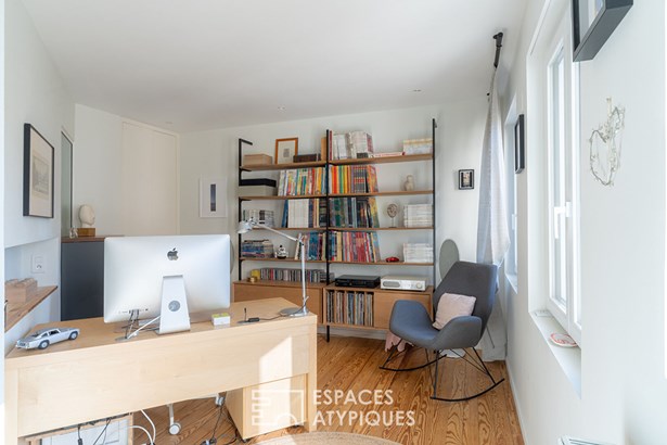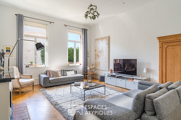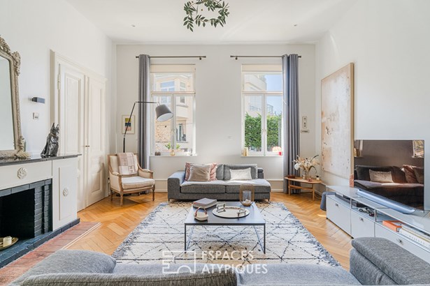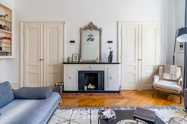 The spacious entrance hall sets the tone with its generous volumes and refined finishes. It leads into a vast, light-filled living room with high ceilings and character features such as herringbone parquet flooring and a superb fireplace.