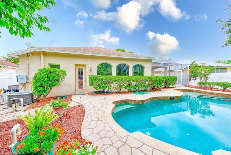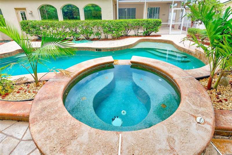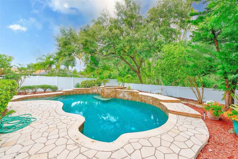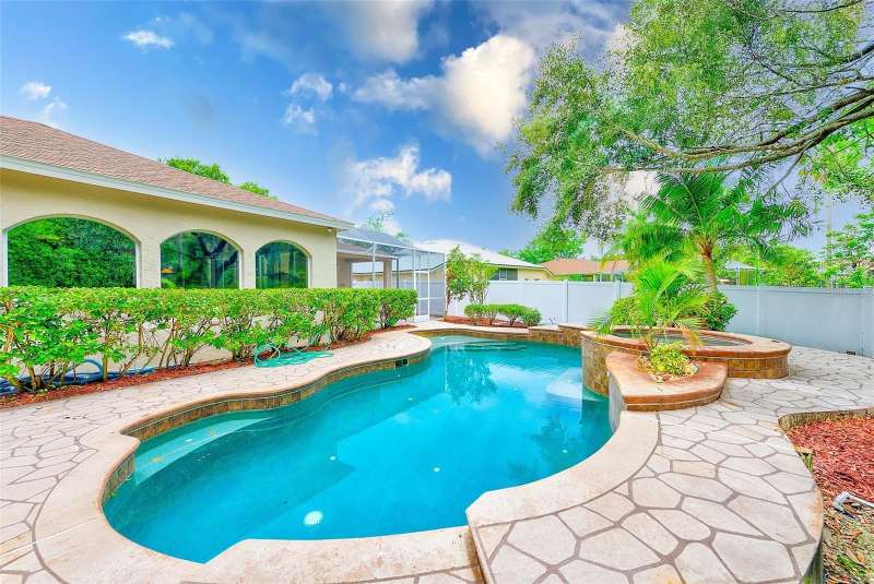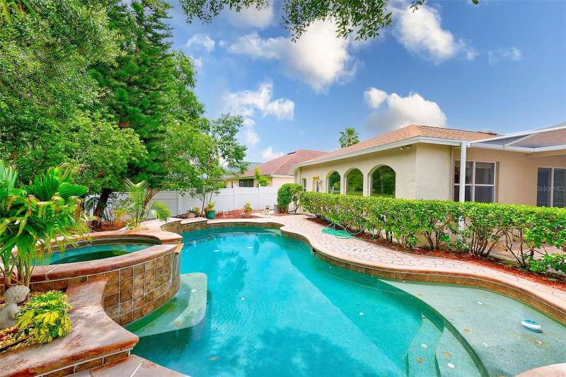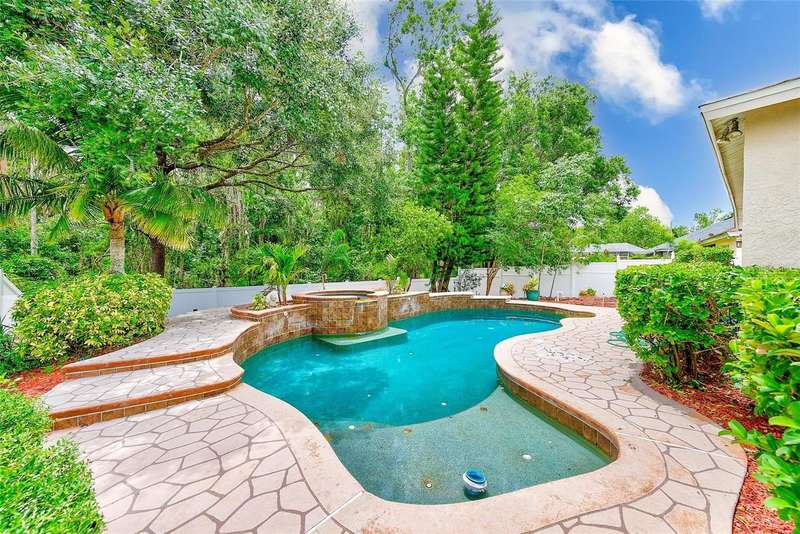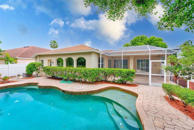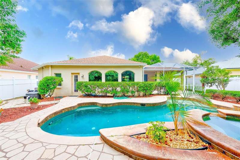 Under contract-accepting backup offers. LOCATION! LOCATION! LOCATION! You must see this lovely 4-bedroom, 3-bathroom home in Meadow Pointe with backyard view of adjoining conservation area. Fully fenced yard creates your own private oasis for relaxing in your beautiful, spacious pool or accompanying spa with the pool waterfall providing a soothing soundtrack. An oversized screened lanai serves as the perfect spot for outdoor entertaining day or night. Inside the split floor plan opens into a large living room and formal dining room. To the right a spacious kitchen featuring a breakfast bar, pantry, and center island with a built-in wine cooler, opens to an expansive family room with sliders opening to the lanai and 4 large windows facing the pool to let in all that wonderful Florida sunshine. The family room provides access to a door leading to the pool deck, a full bathroom, and a bedroom. Two other sizeable bedrooms and a second full bath also occupy this side of the house. Opposite the kitchen is a dedicated laundry room that also provides entry to an expansive 3 car garage. The comfortable primary suite occupies the left side of the house and includes sliders that open to the lanai, his and her walk-in closets, and bathroom with a Jacuzzi tub, separate shower and his and her vanities. Best of all, no HOA fees in Meadow Pointe but plenty of amenities including a fitness center, recreation center, and tennis and racquetball courts. Meadow Point is close to schools, hospitals, shopping, and I-75. Like I said, LOCATION! LOCATION! LOCATION! Come see for yourself.